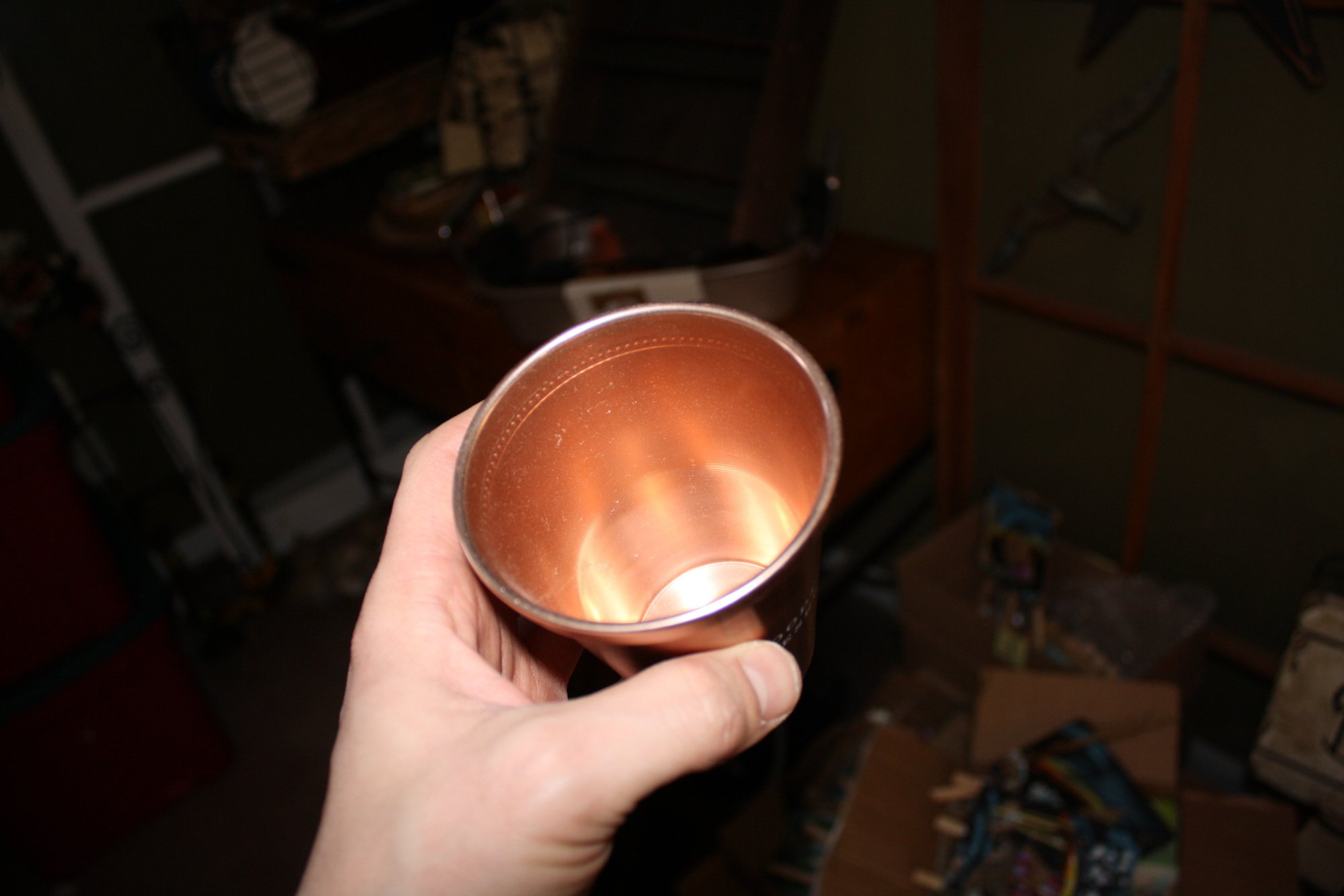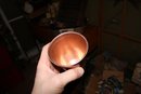 Woodford Reserve Kentucky Derby julep cup featuring a classic copper exterior with beaded detailing around the rim. Engraved with the “WOODFORD RESERVE” logo. Crafted from copper-plated stainless steel or copper-toned aluminum, ideal for serving mint juleps or as a collectible keepsake.