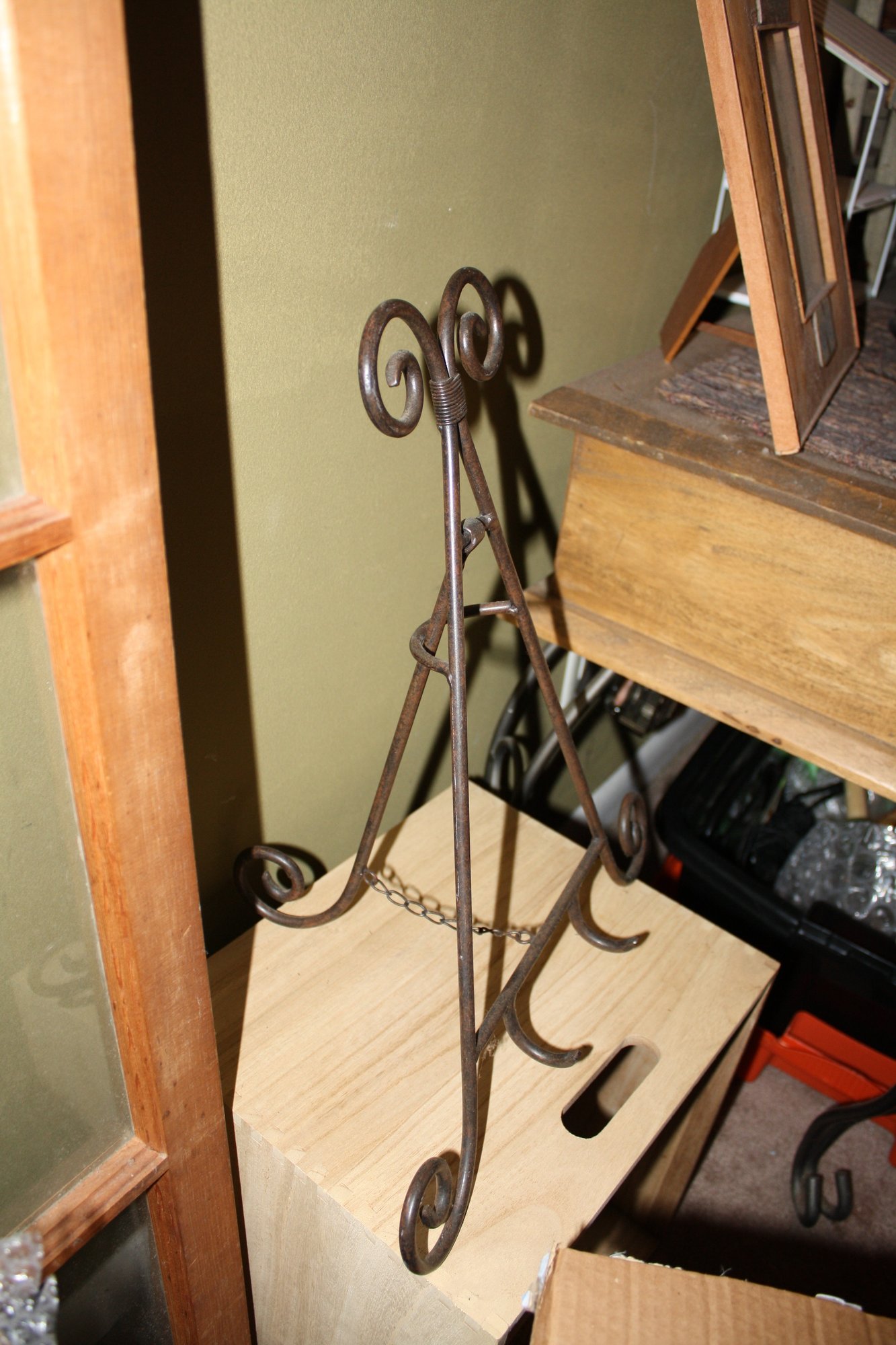 Wrought iron easel display stand designed to showcase books, photos, plates, or artwork. Features a tripod structure with decorative curls and scrollwork at the top and base. Sturdy metal construction allows for folding flat for convenient storage and portability.