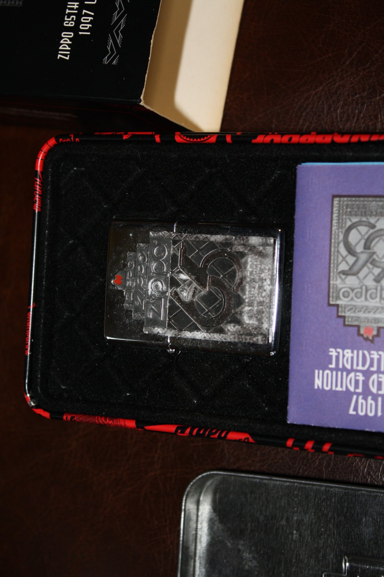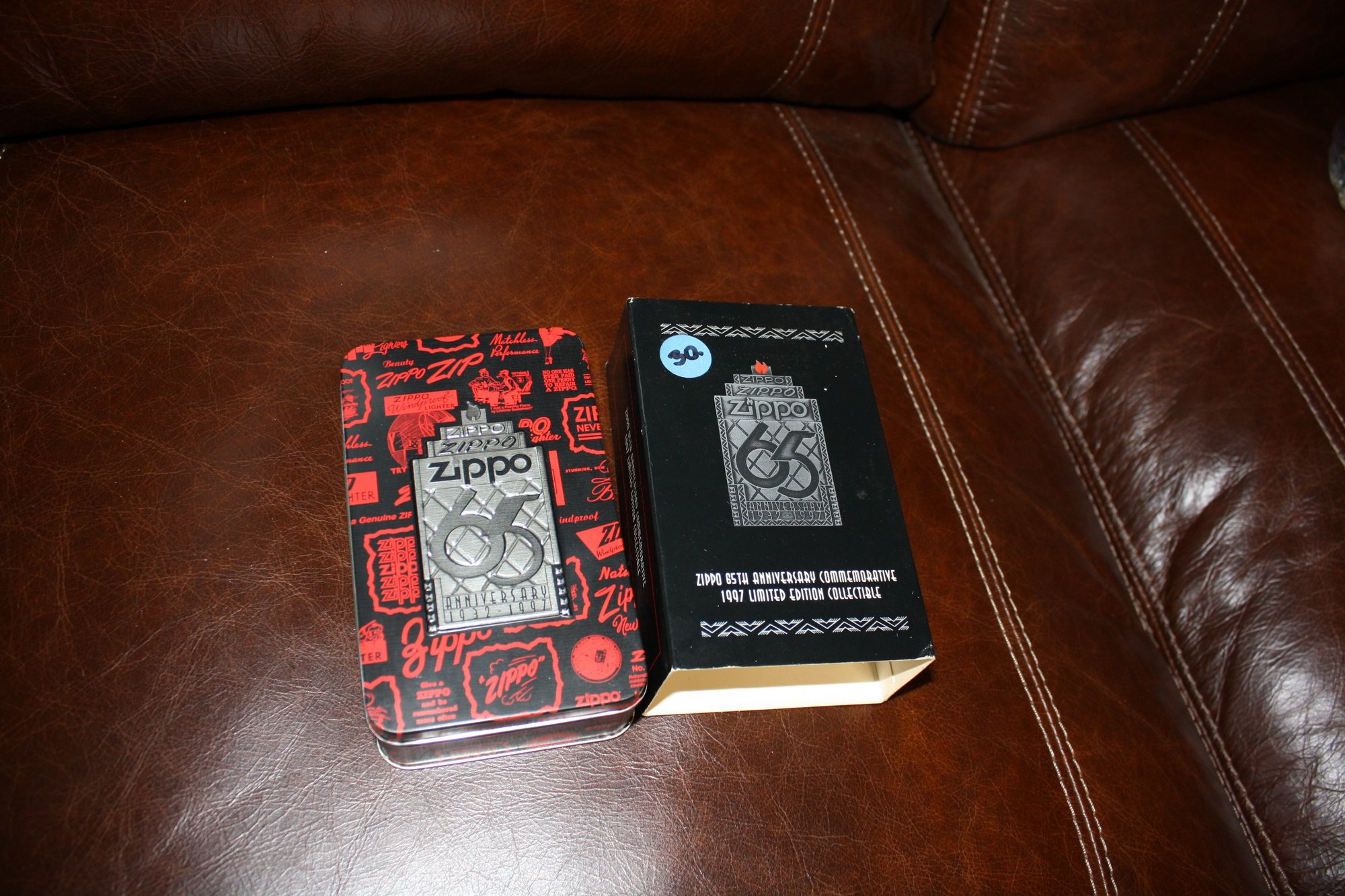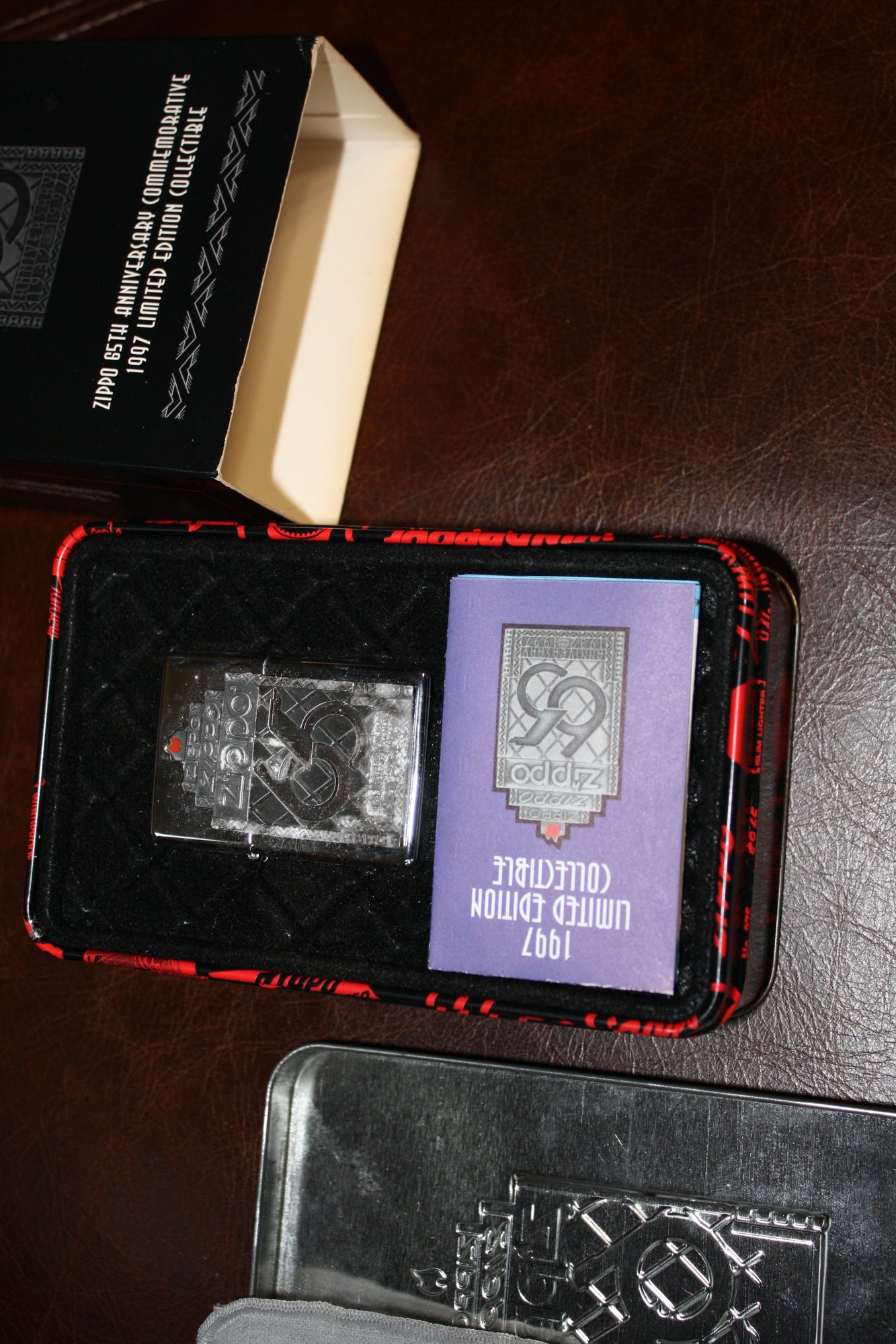 Zippo 65th Anniversary commemorative collectible lighter released in 1997, celebrating Zippo’s 1932–1997 legacy. Limited edition set featuring a classic Zippo windproof lighter housed in its original themed red and black presentation tin with outer cardboard sleeve. Many examples are found in unused or “unfired” condition with original security sticker intact, making them desirable for collectors of Zippo memorabilia and vintage advertising items.