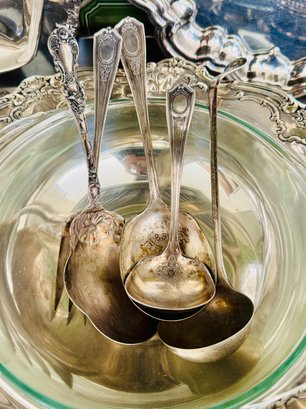 Assortment Of Silver-plated Serving Pieces, Which Include Trays, Bowls, Serving Utensils, And Covered Dishes