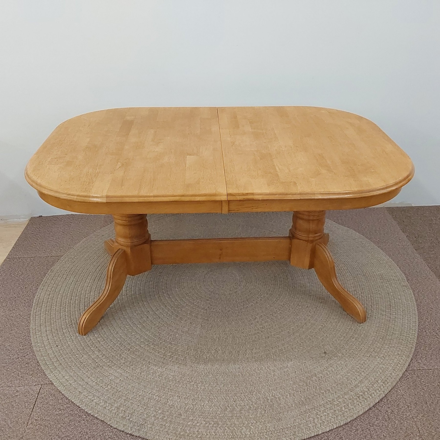 60" table expands to 84" with both leaves, each leaf is 12" expanded