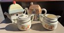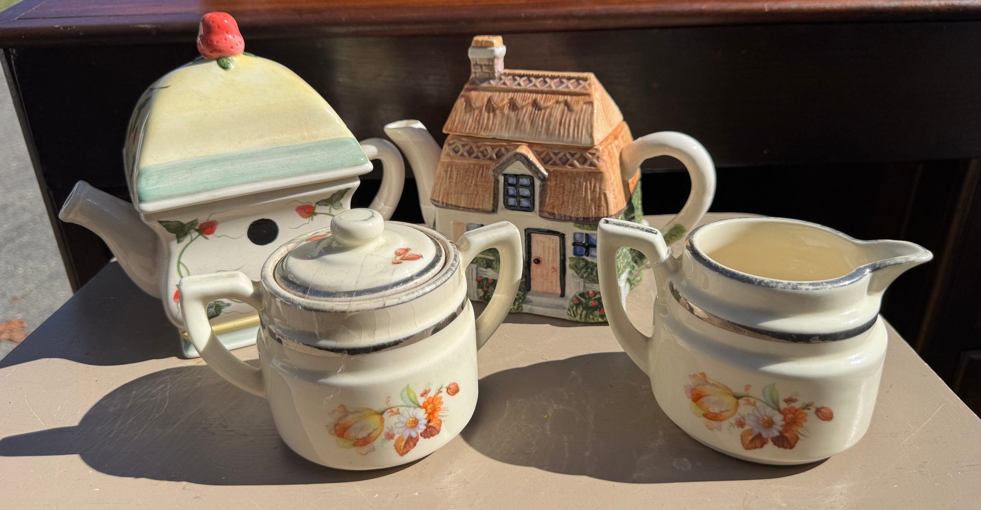 Lot of four pieces- two unique teapots and matching cream & sugar