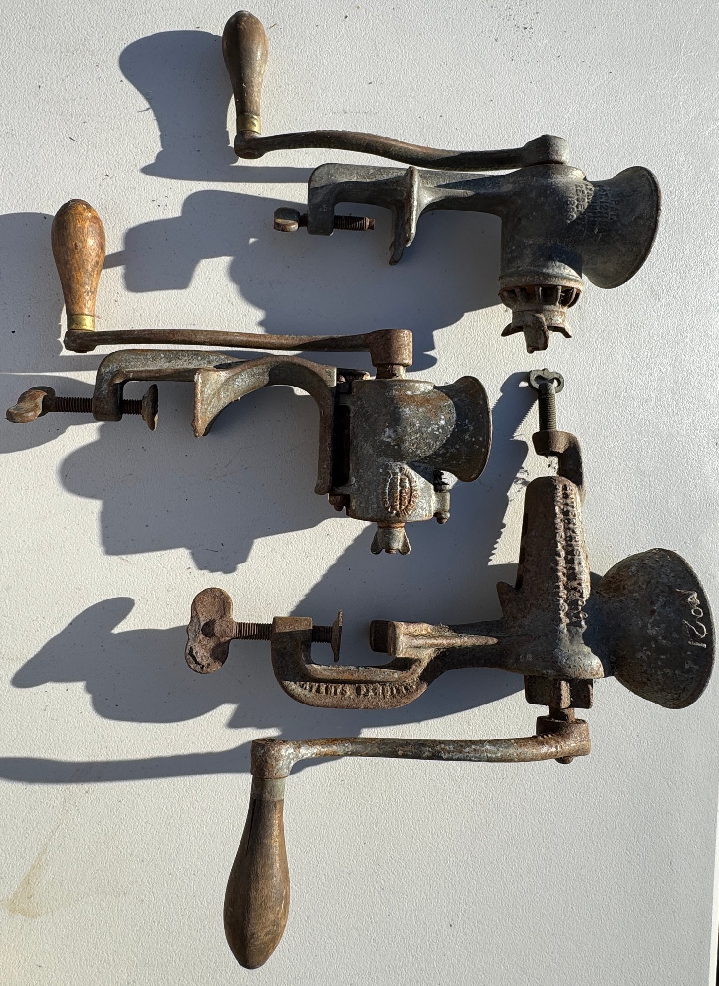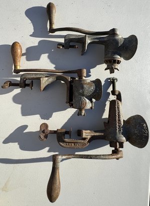 Lot of three antique hand-cranked cast iron kitchen grinder tools