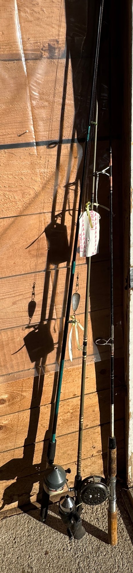 Lot of three vintage fishing poles including two freshwater fishing rods and one fly fishing rod
