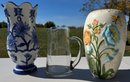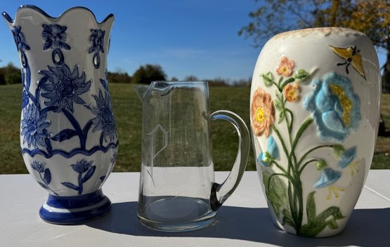 Lot of two vases and etched glass pitcher
