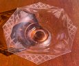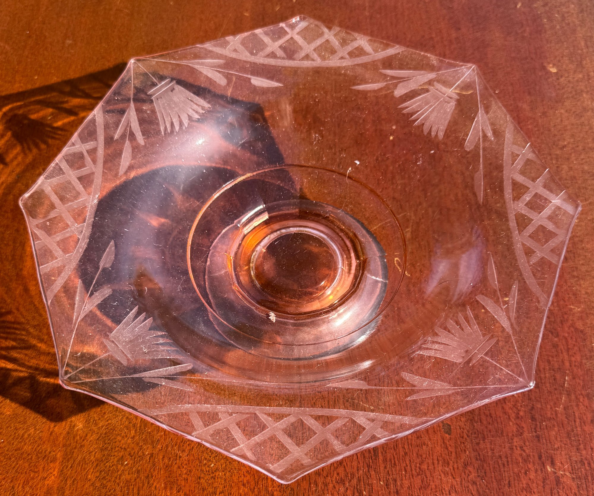 Vintage pink depression glass octagonal console bowl with floral etching