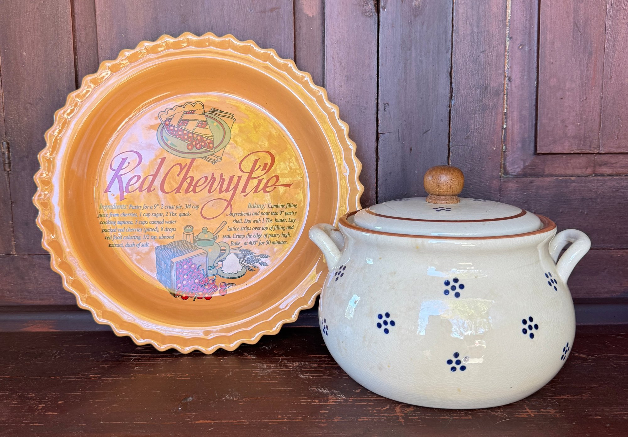 Lot of two vintage dishes- cherry pie dish and crock with lid