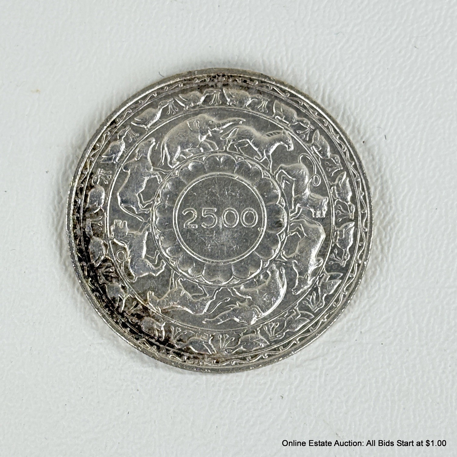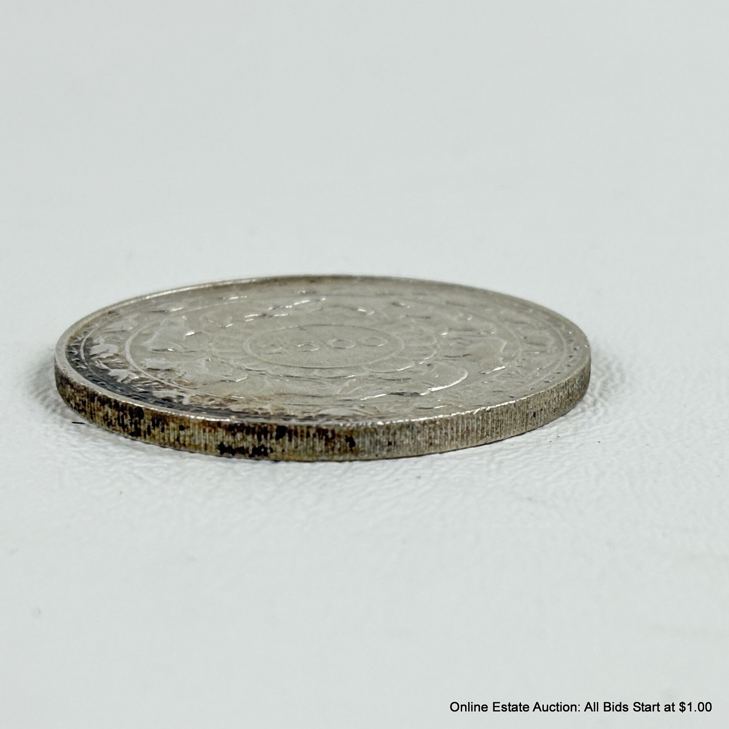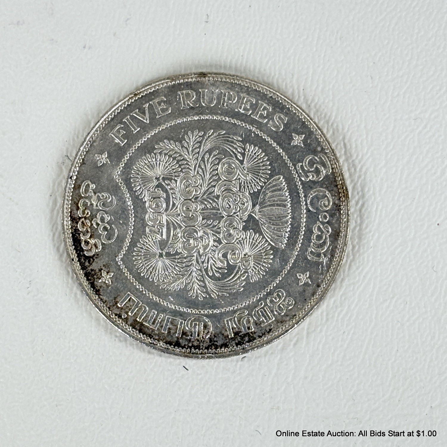 1957 .925% Silver Ungraded and Circulated Ceylon 5 Rupee Coin