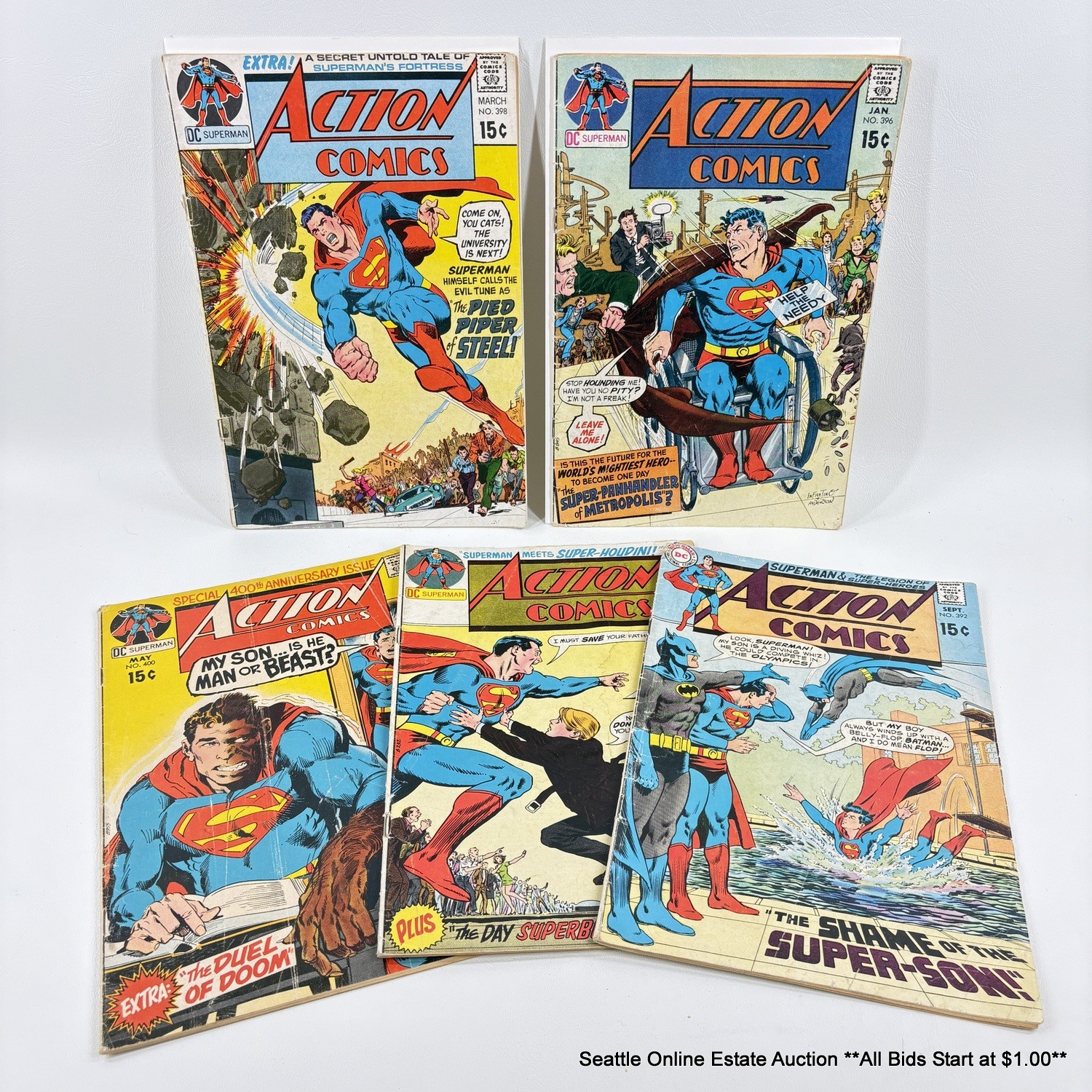 5 DC Action Comics Comic Book No. 392, 393, 396, 398, 400 With 15 Cent Price Cover