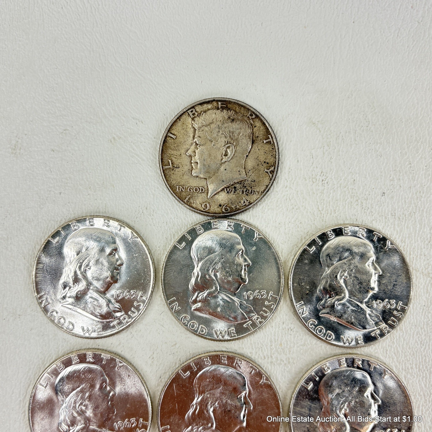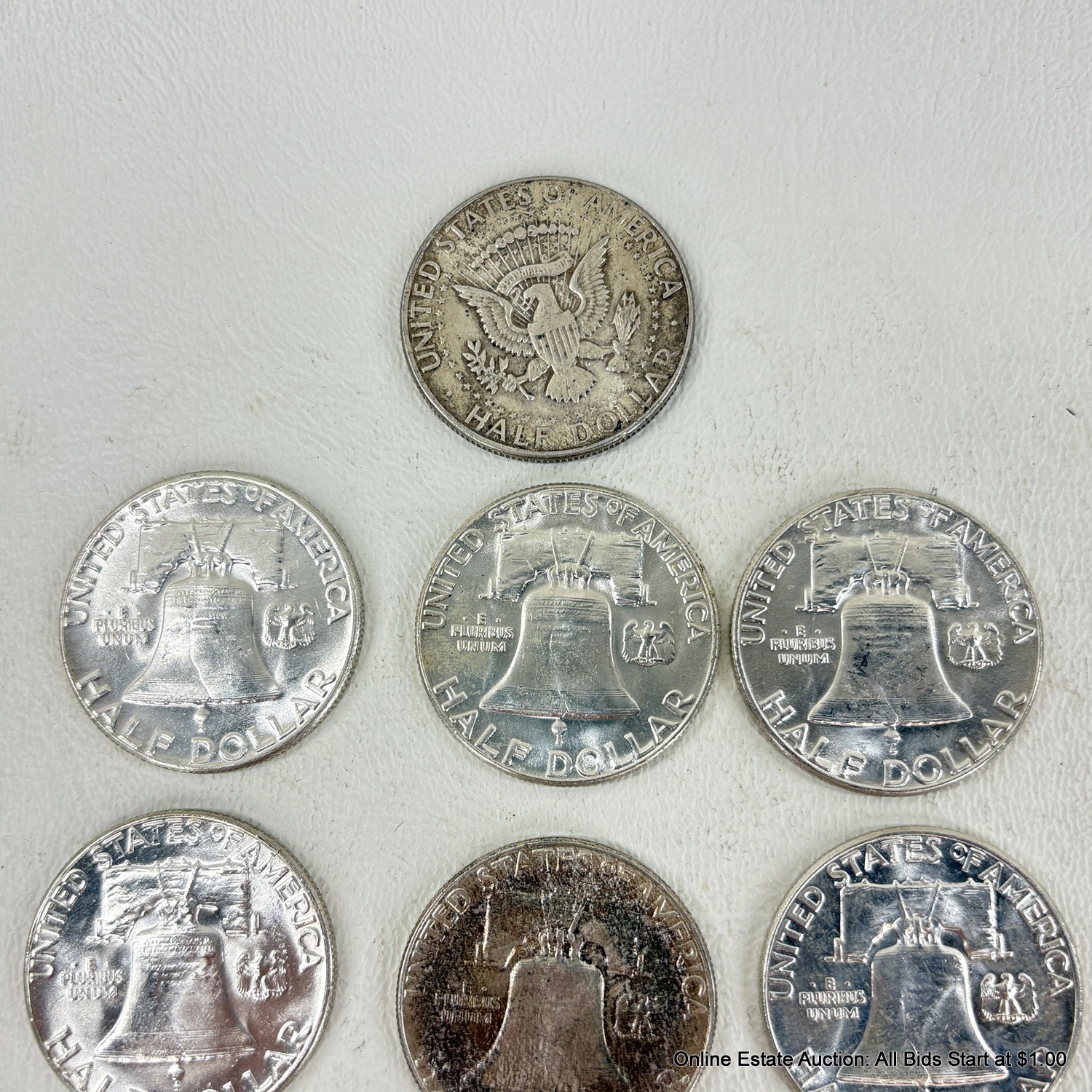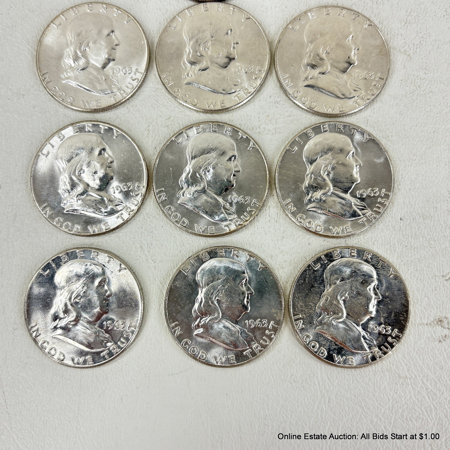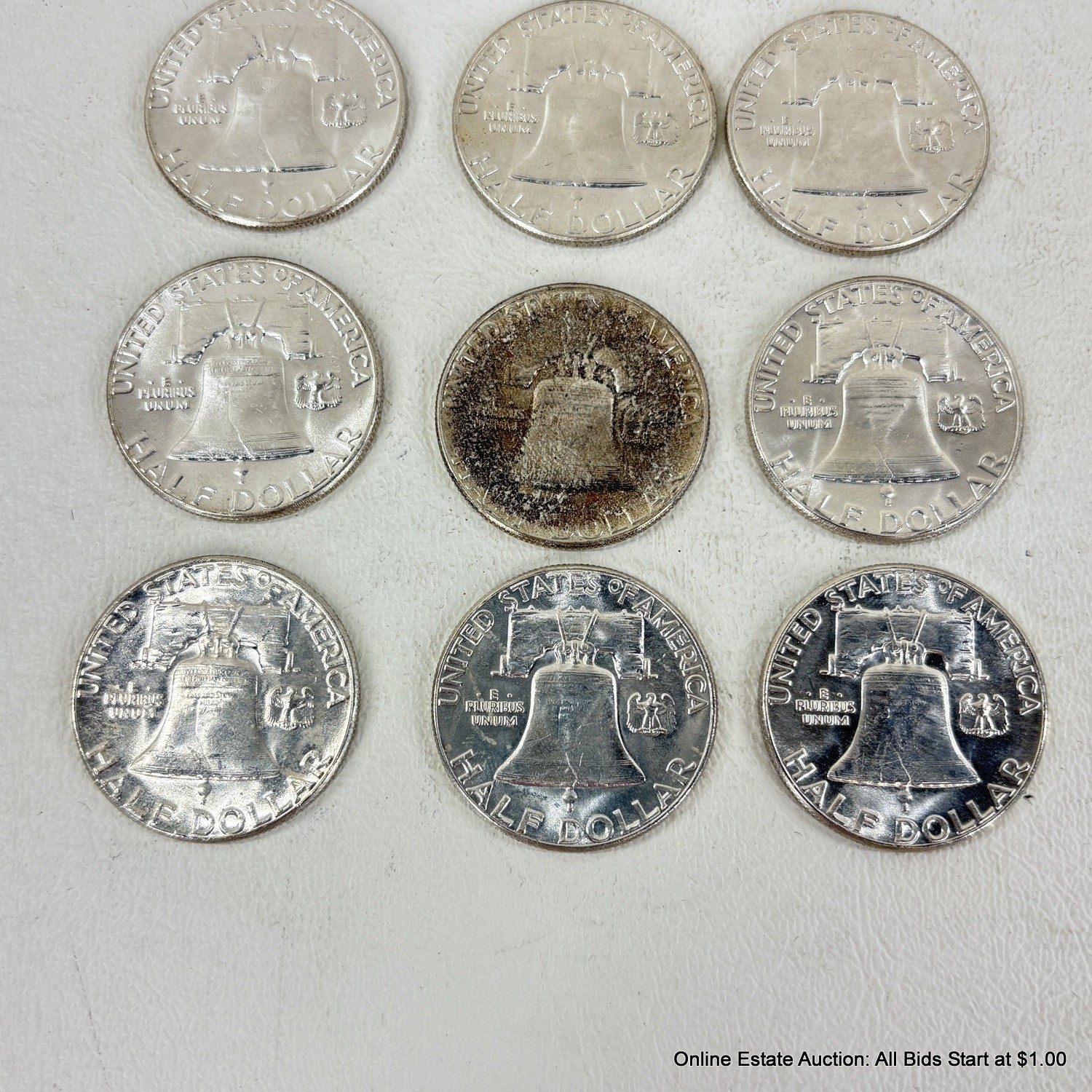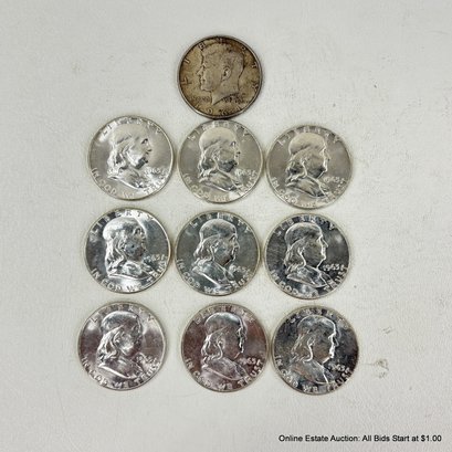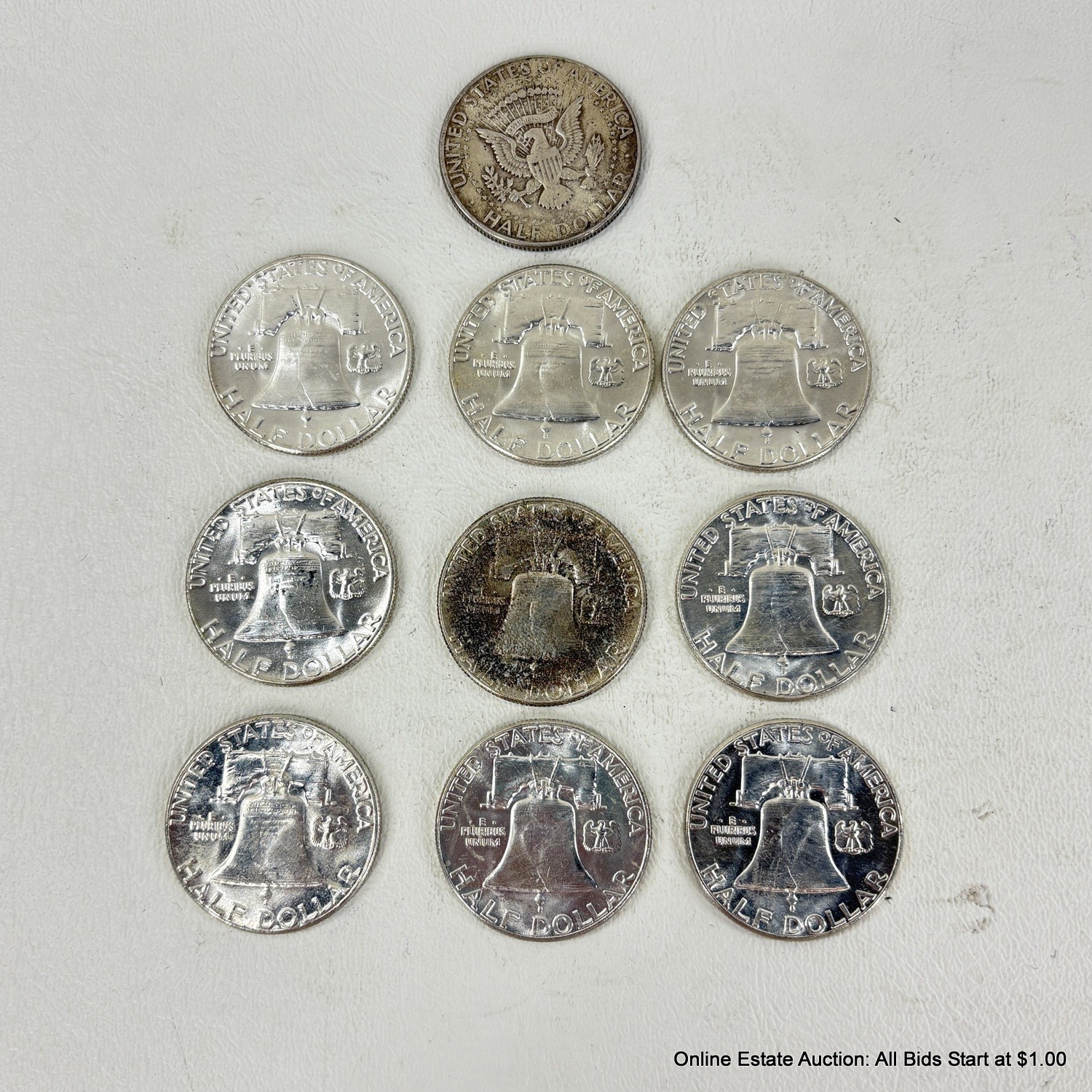 9 1963 Franklin and 1 1964 Kennedy U.S. Half Dollar Coins Ungraded and Circulated