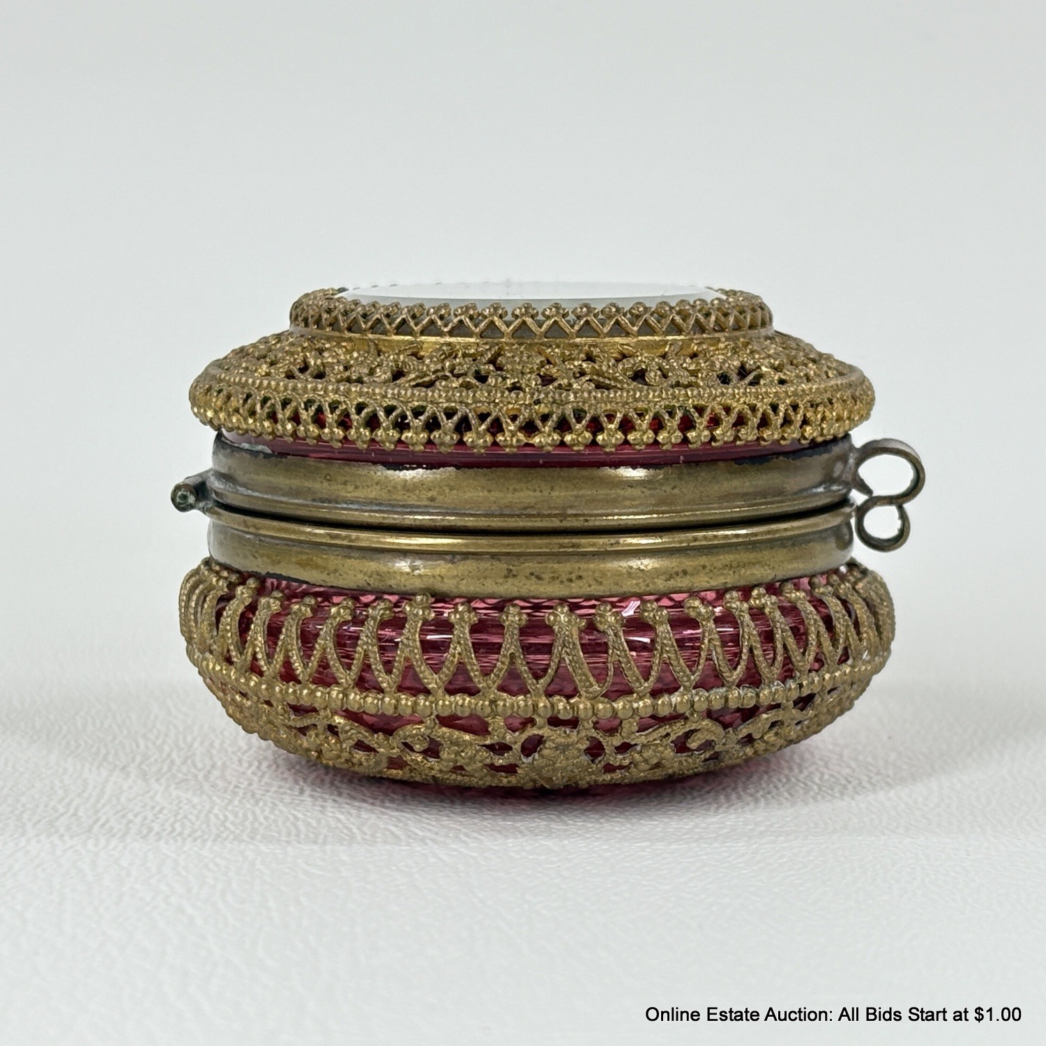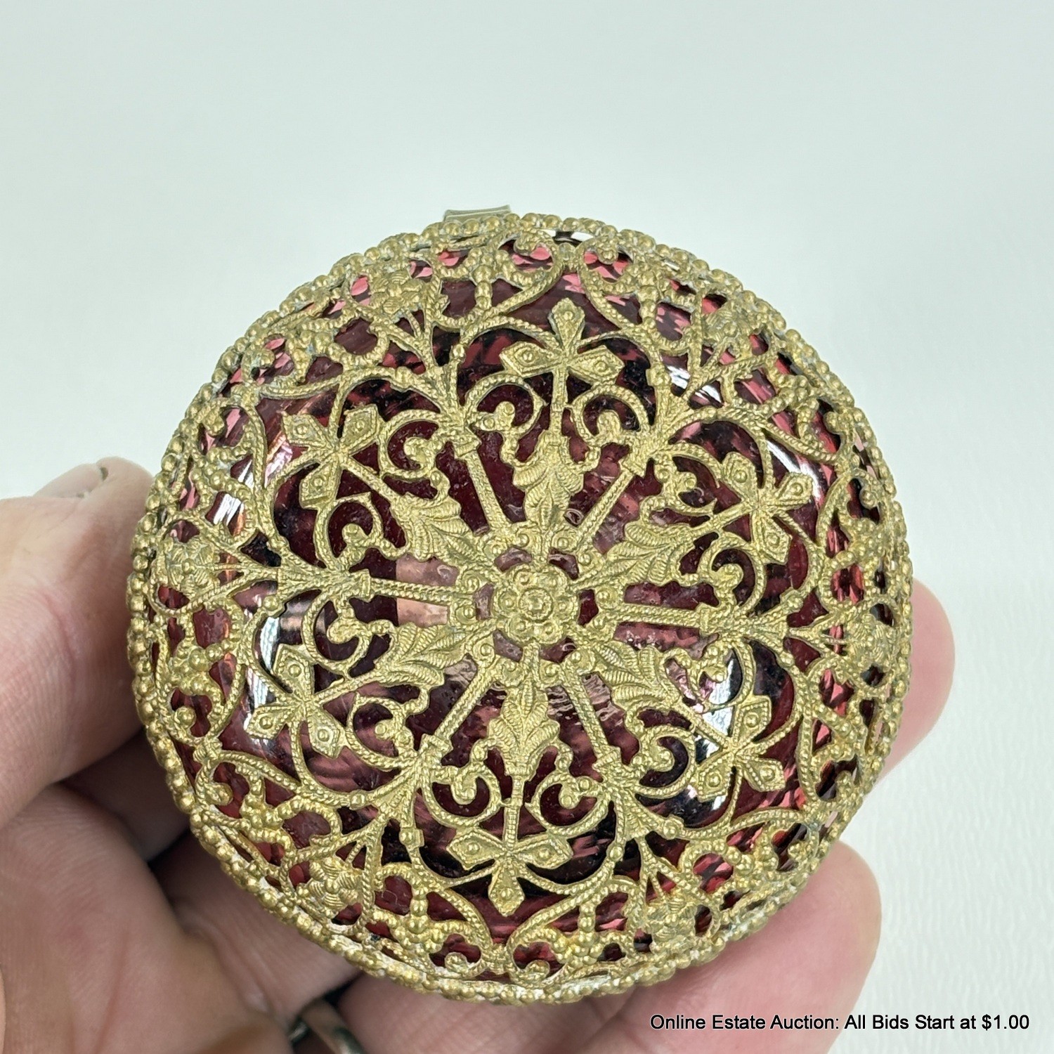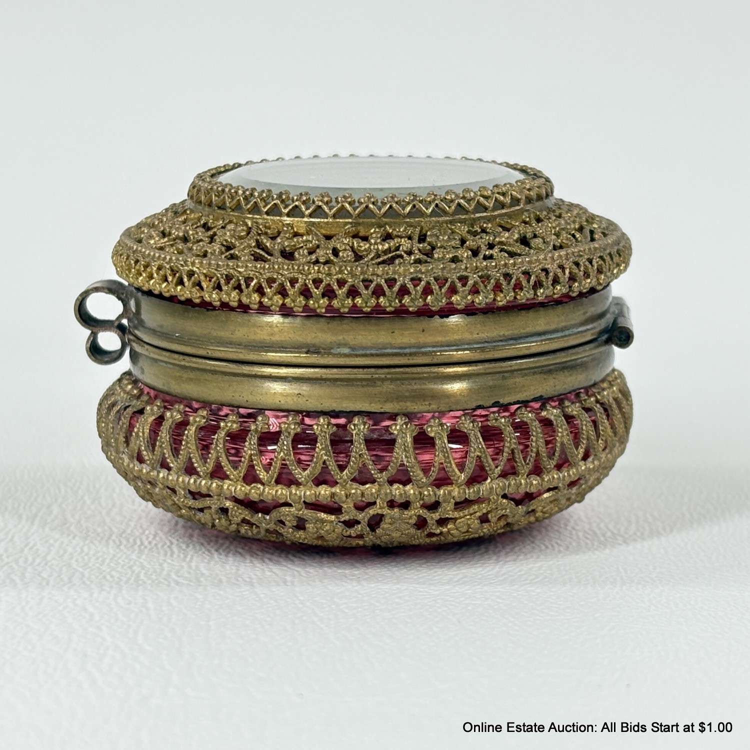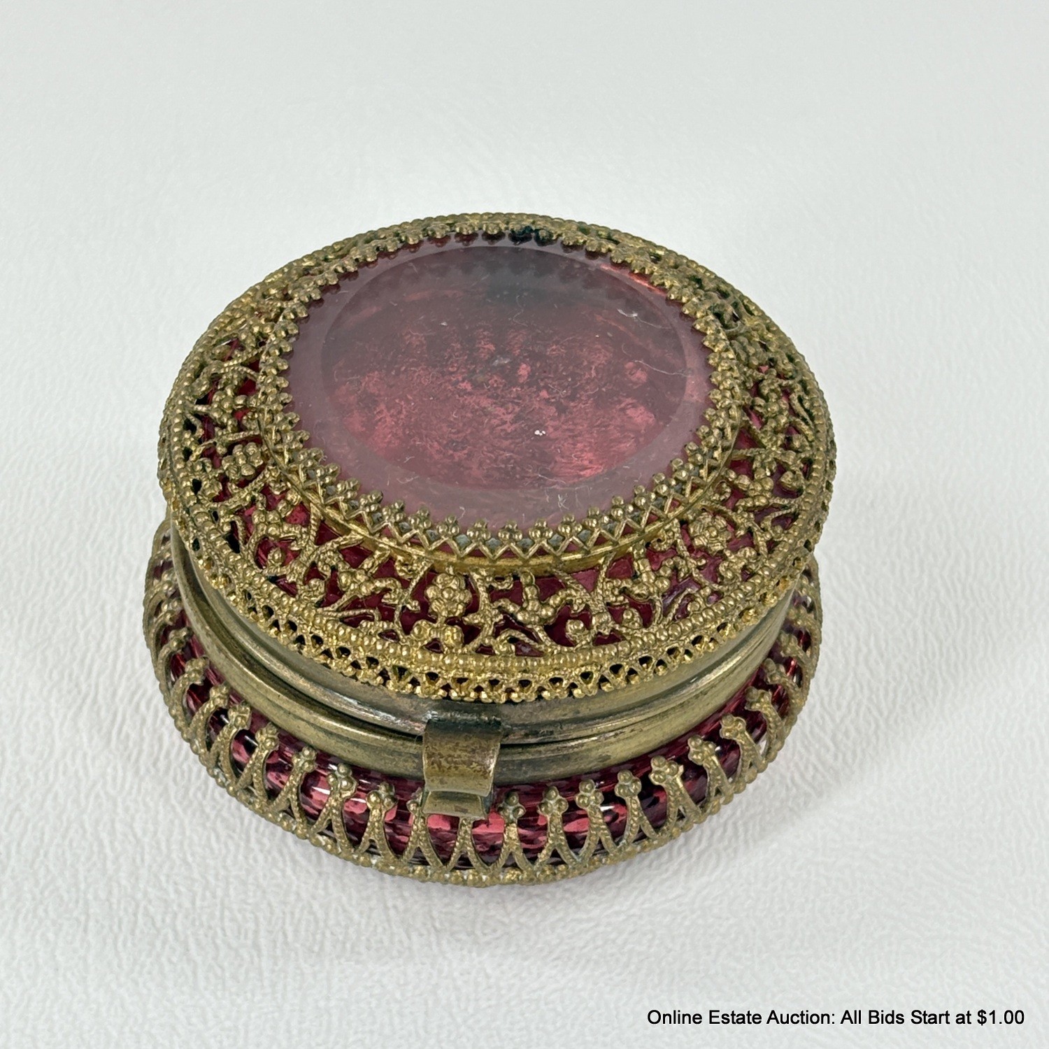 Antique Cranberry Glass Trinket Box with pierced Goldtone Lace Design