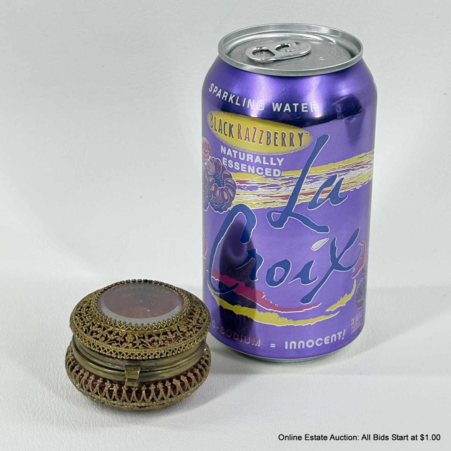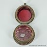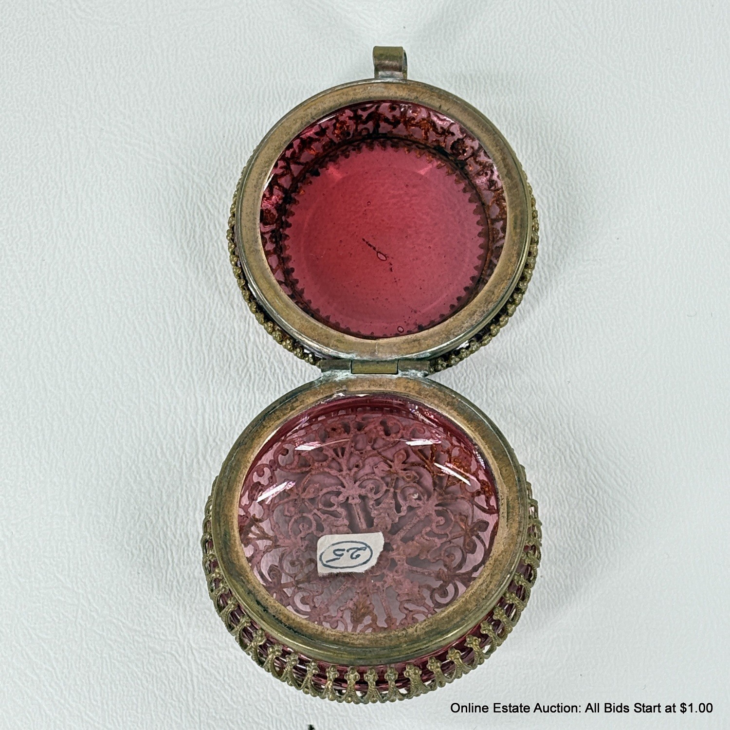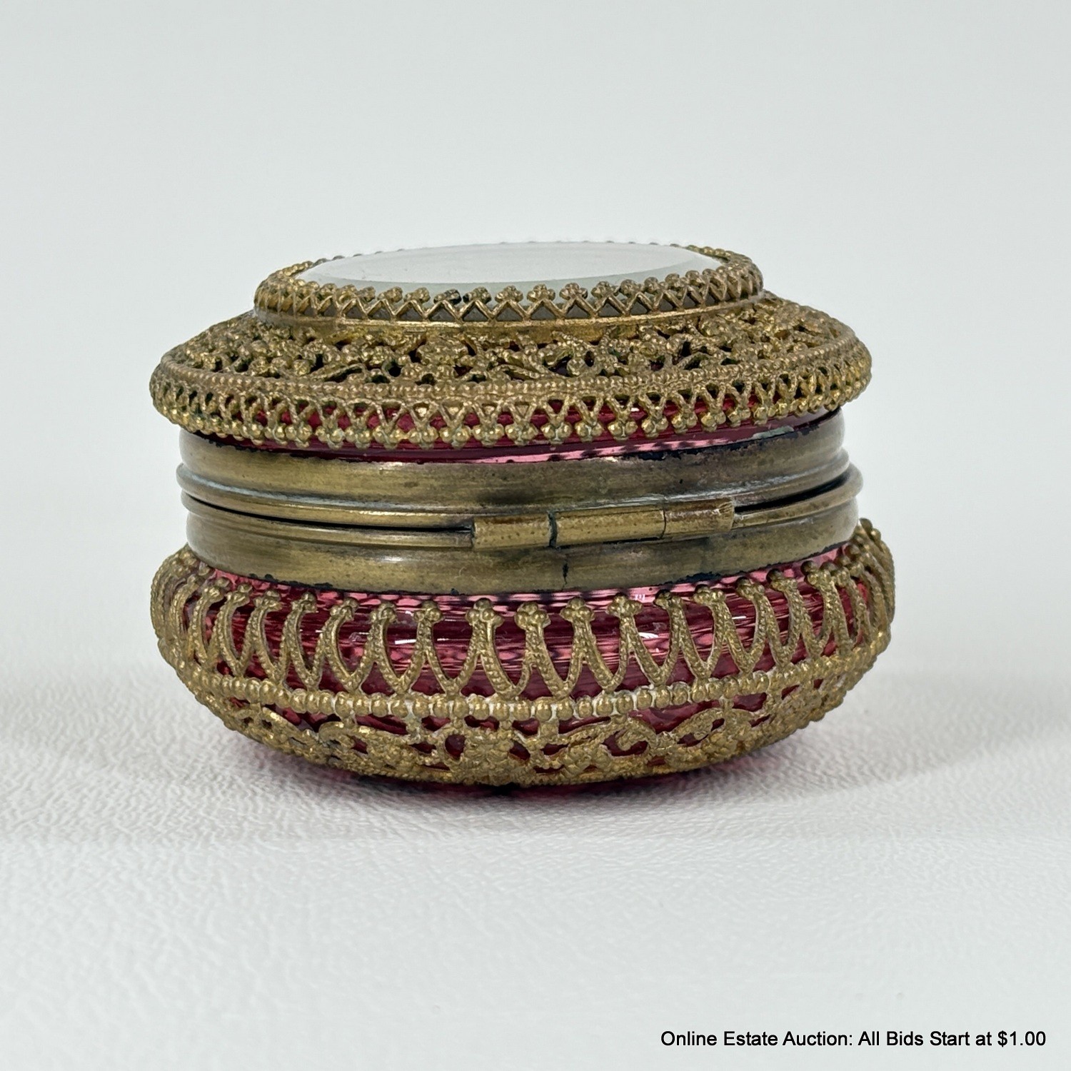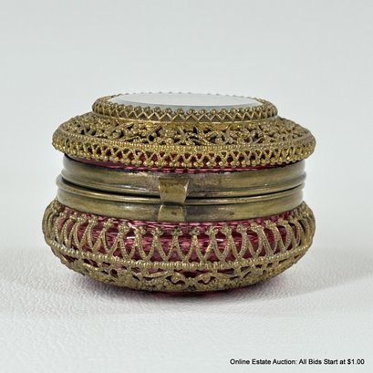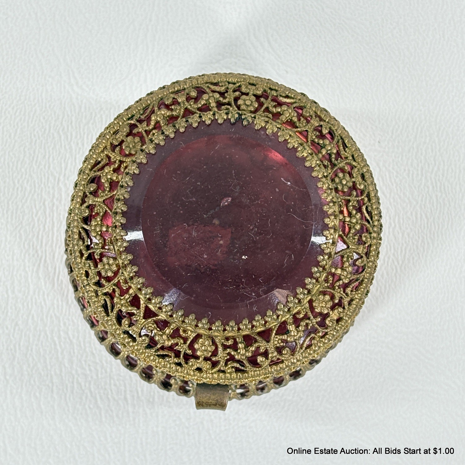 Antique Cranberry Glass Trinket Box with pierced Goldtone Lace Design