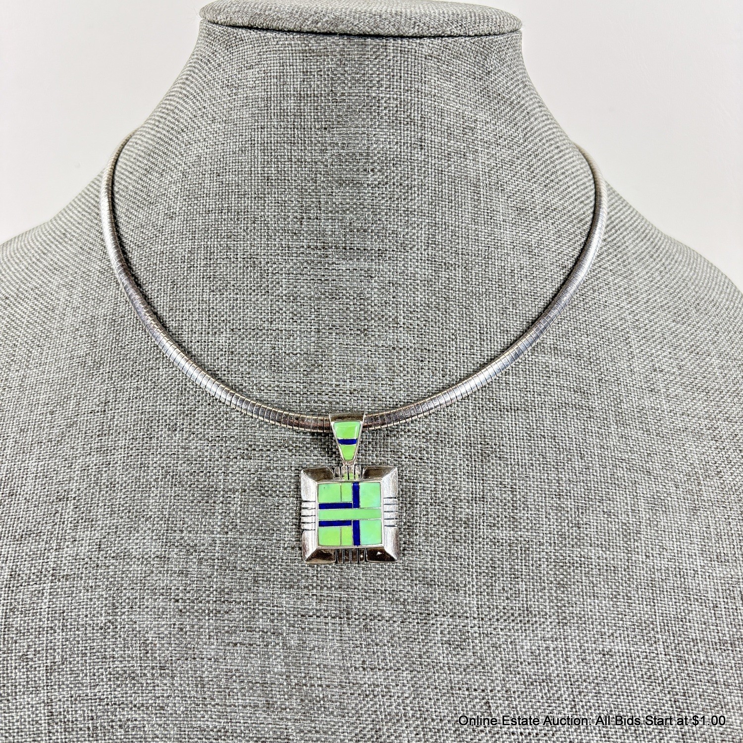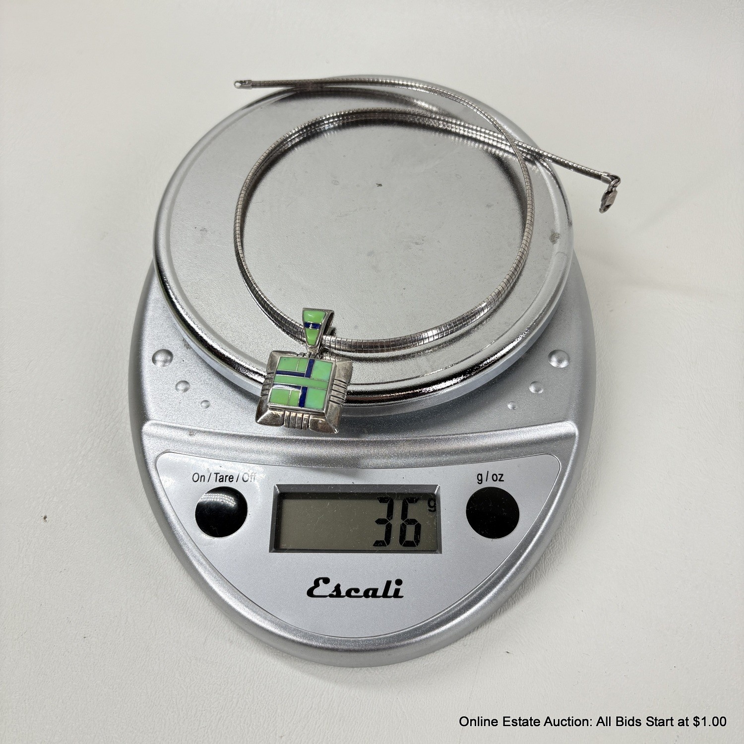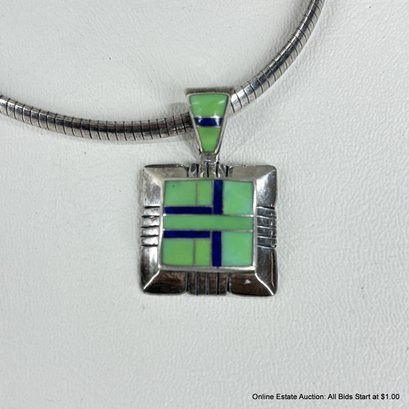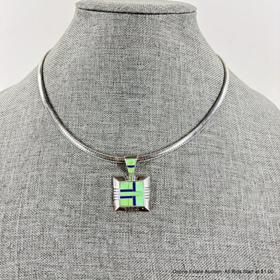 Sterling Silver Omega Chain Necklace And Pendant With Inlaid Stones Total Weight 36 Grams
