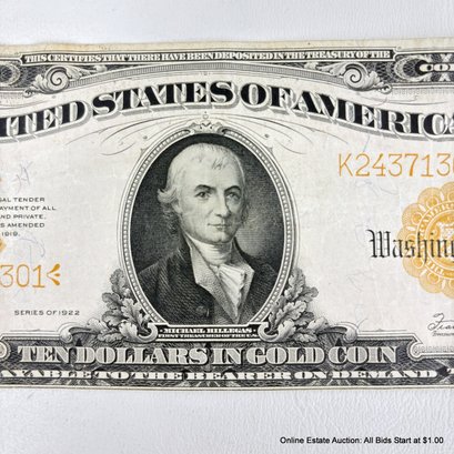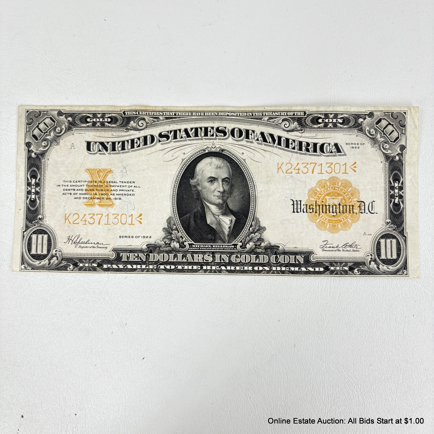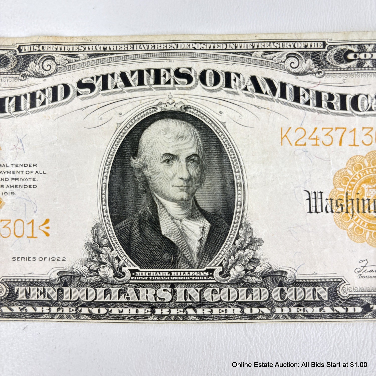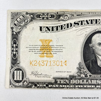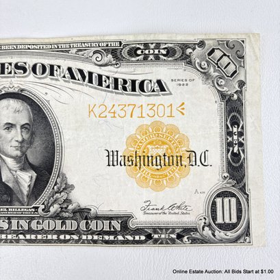 Ungraded Series 1922 U.S. $10 Gold Bank Note