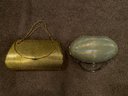2 Hard Shell Purses. 1 gold colored purse with a chain strap and a mirror on the inside. 1 compartment. Approximately 5”x 8”. 1 holographic puede with a faux jewel clasp. Approximately 5”x 7”. Both pre owned condition.