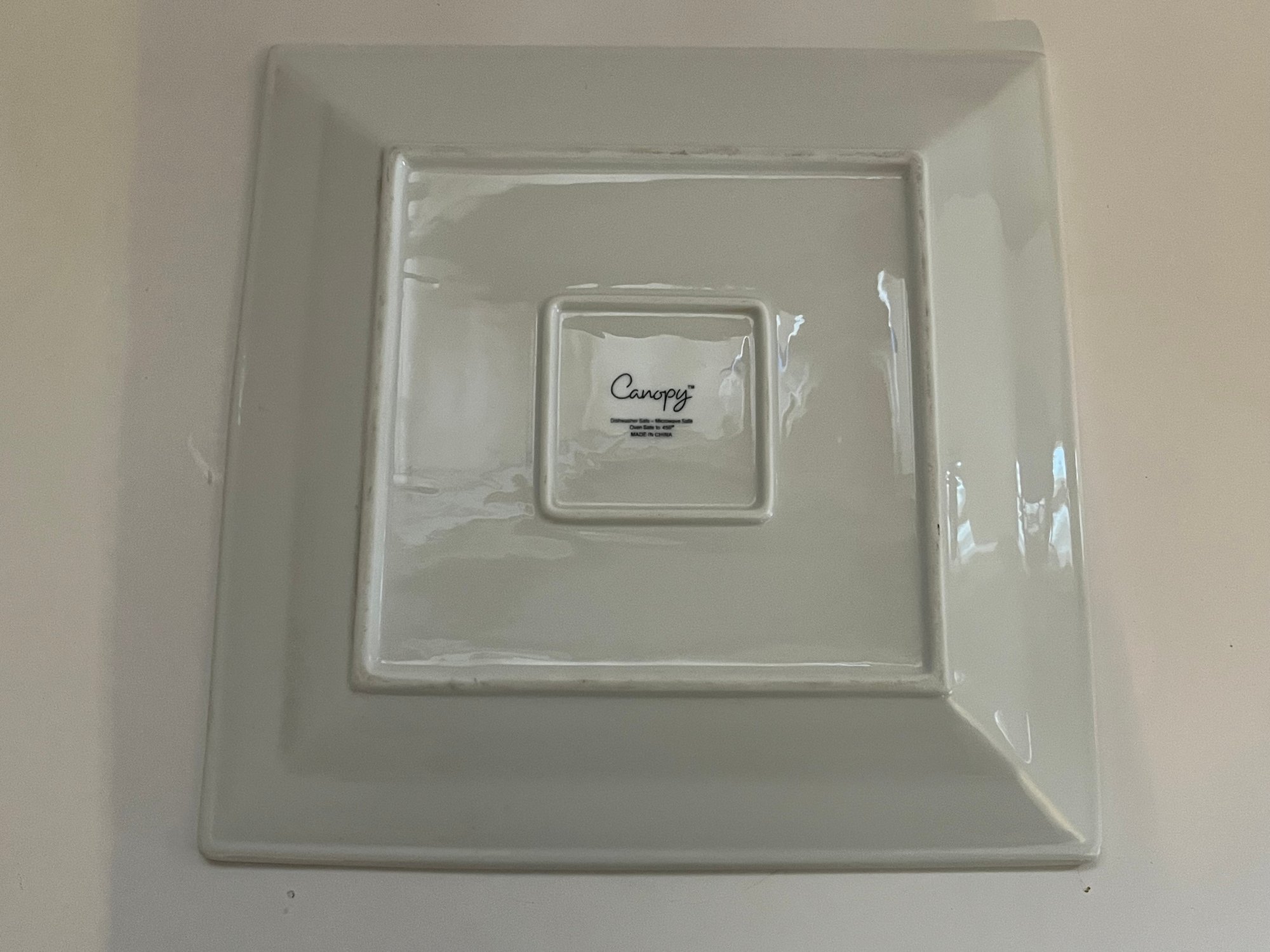 2 Large White Glass Platters including 1 Canopy brand platter measures approximately 12”x 12” and 1 Hole brand platter, measures approximately 14”x 14” and made of our porcelain. Both pre owned condition, may need to be cleaned.
