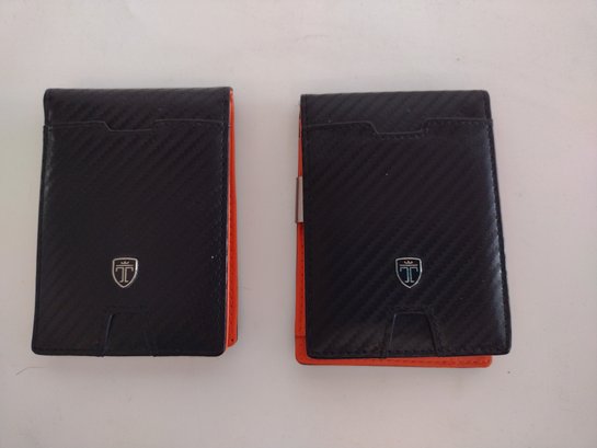 2 Travando Men's Slim Wallets With Money Clip. Black exterior with orange interior and pockets. Money Clip is on the inside of the wallet with brand logo. Very good pre-owned condition.