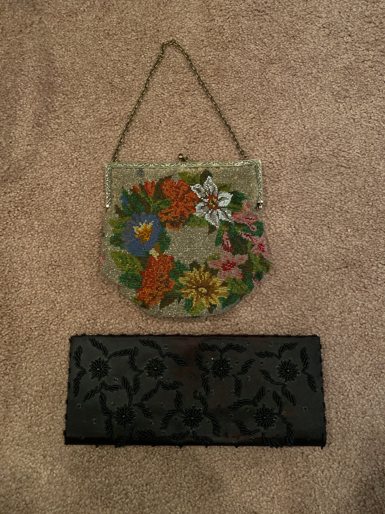 2 Vintage Beaded Hand Bags. 1 black wallet purse with a button clasp and 1 compartment with a sleeve. Approximately 4”x 10”. 1 multicolor purse with floral beading and a flat bottom. Lined with red velvet feeling material and has 1 compartment. Approximately 7”x 7”. Both pre owned condition.