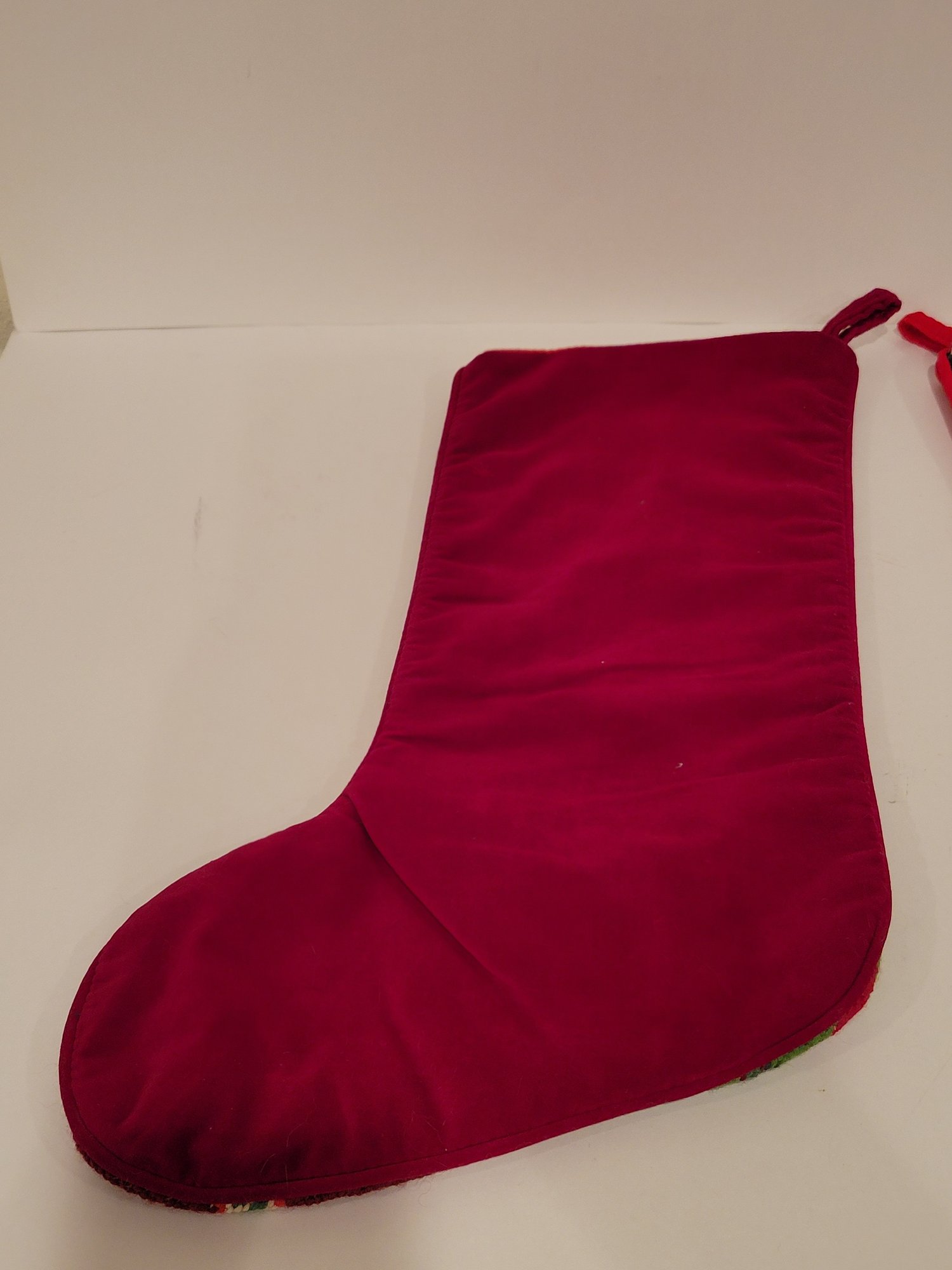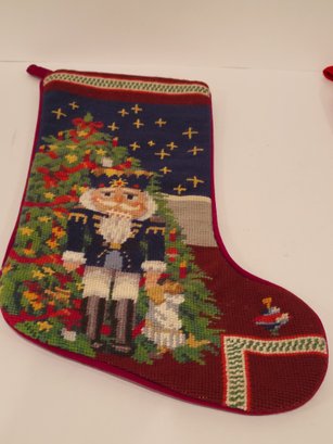 2 Vtg Handmade Needlepoint Christmas Stockings. Measures approximately 16" long. Features a Nutcracker Soldier standing by a Christmas tree. Also Santa standing on the golf course with his clubs on his back. Both have a velvet back. Pre-owned condition.
