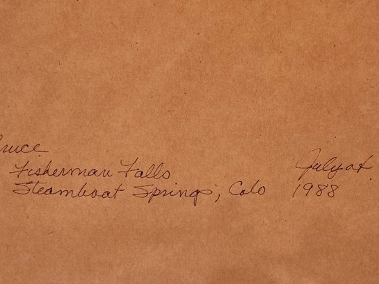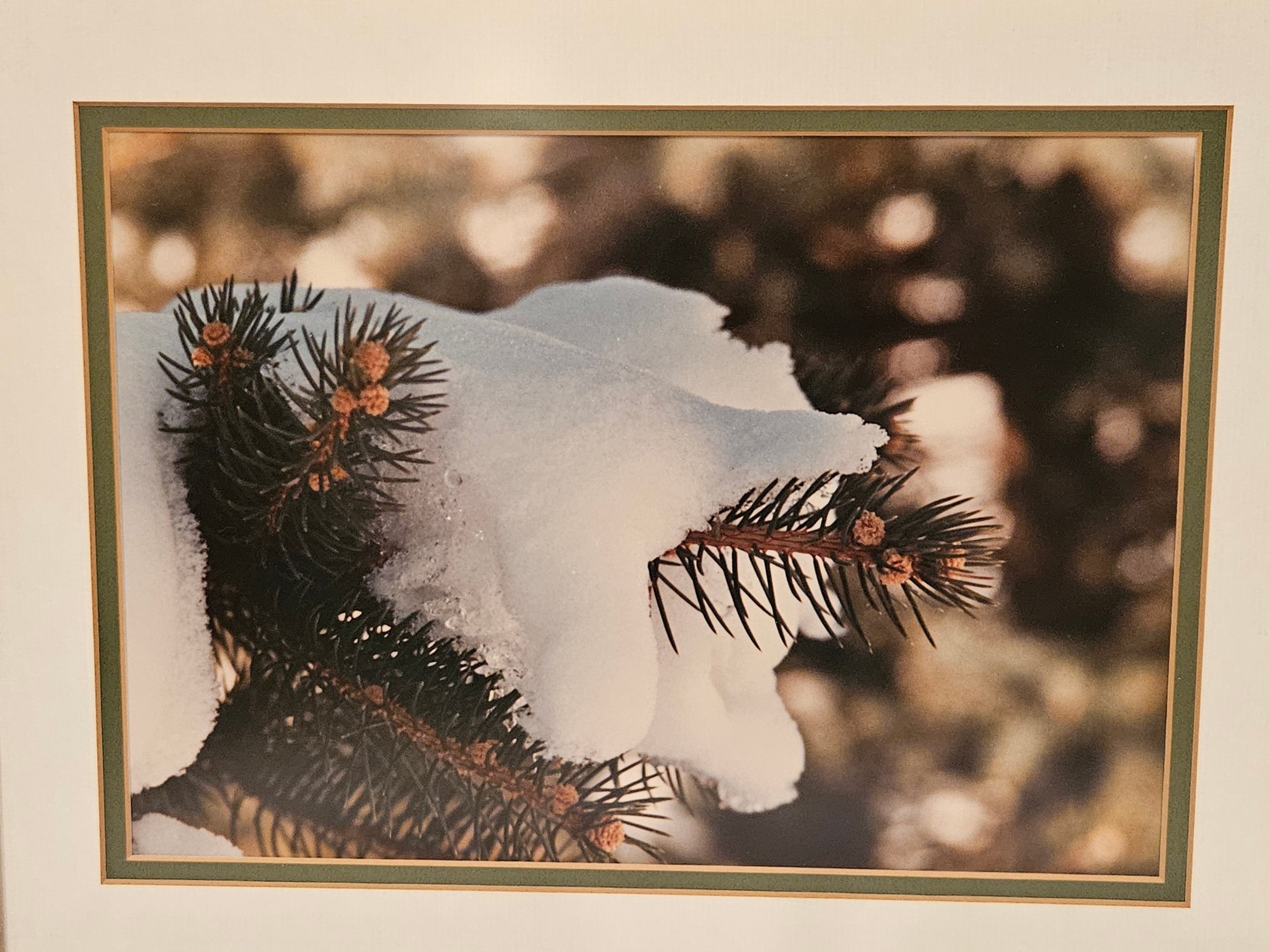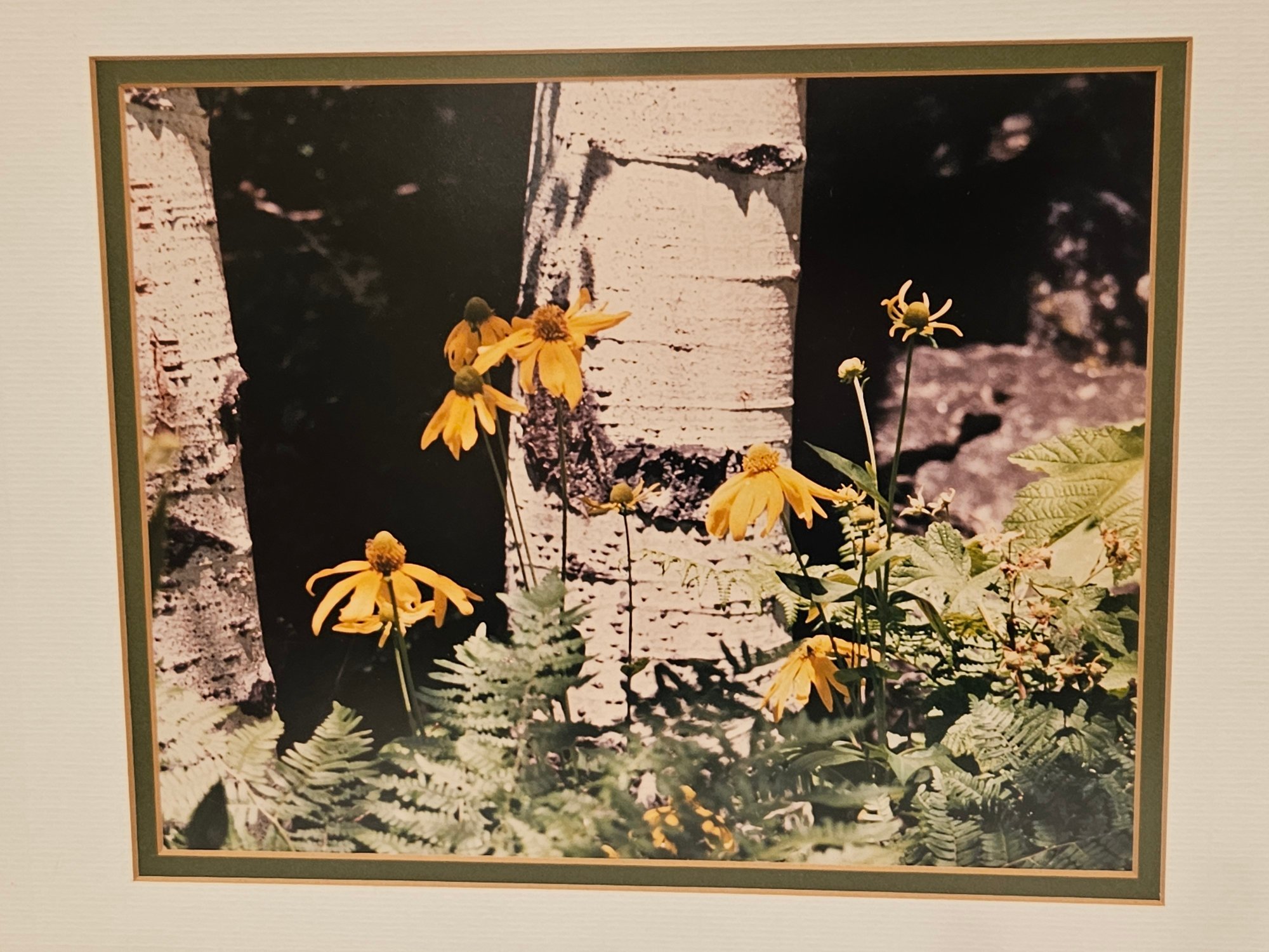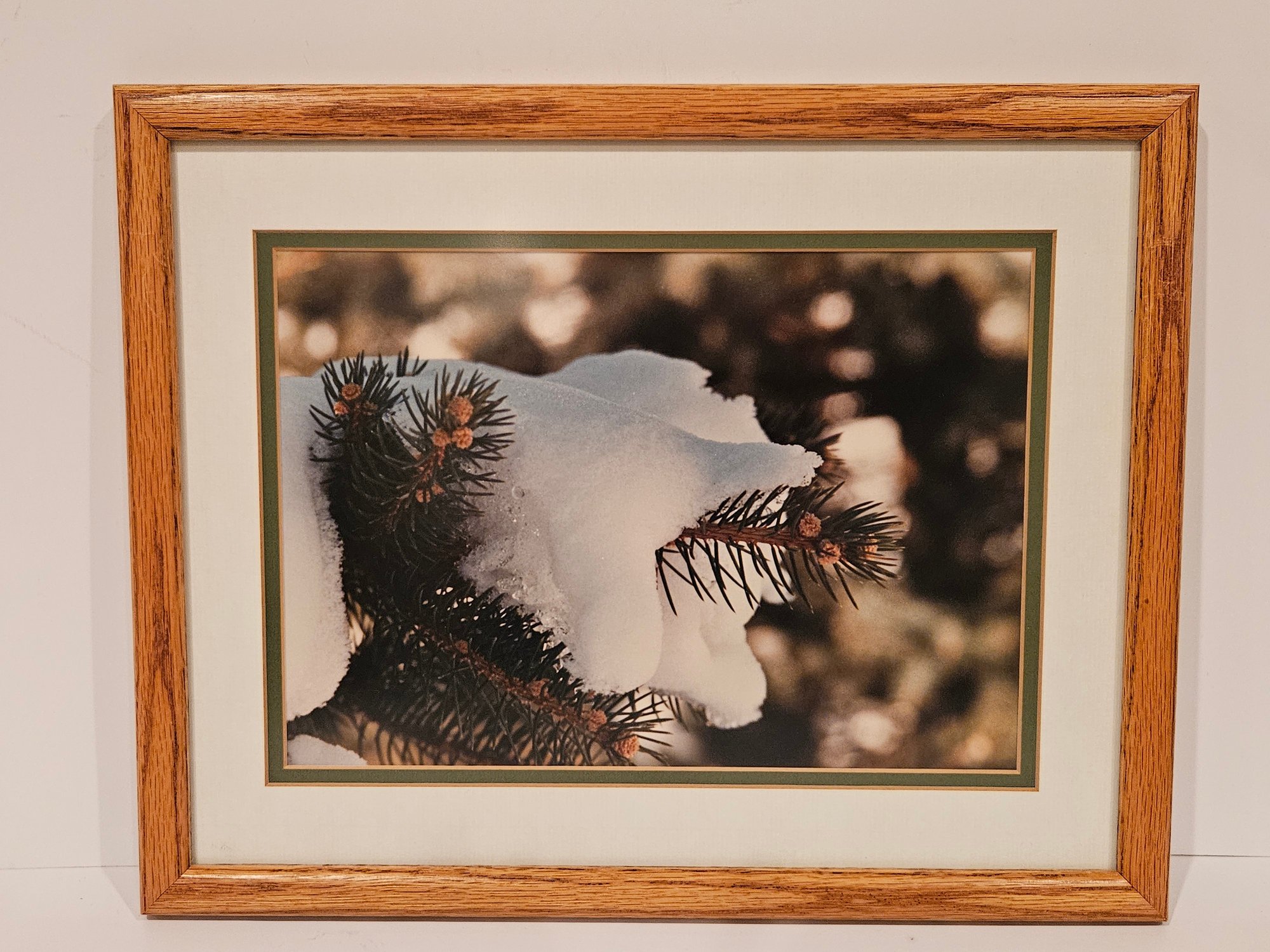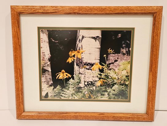 2 Wood Framed Nature Photography Scenes. Includes a picture of daisies and Aspen trees (15" x 12.5") and a pine tree with snow on the branch (15" x 12"). Has matching white and green matte. Pre-owned condition.