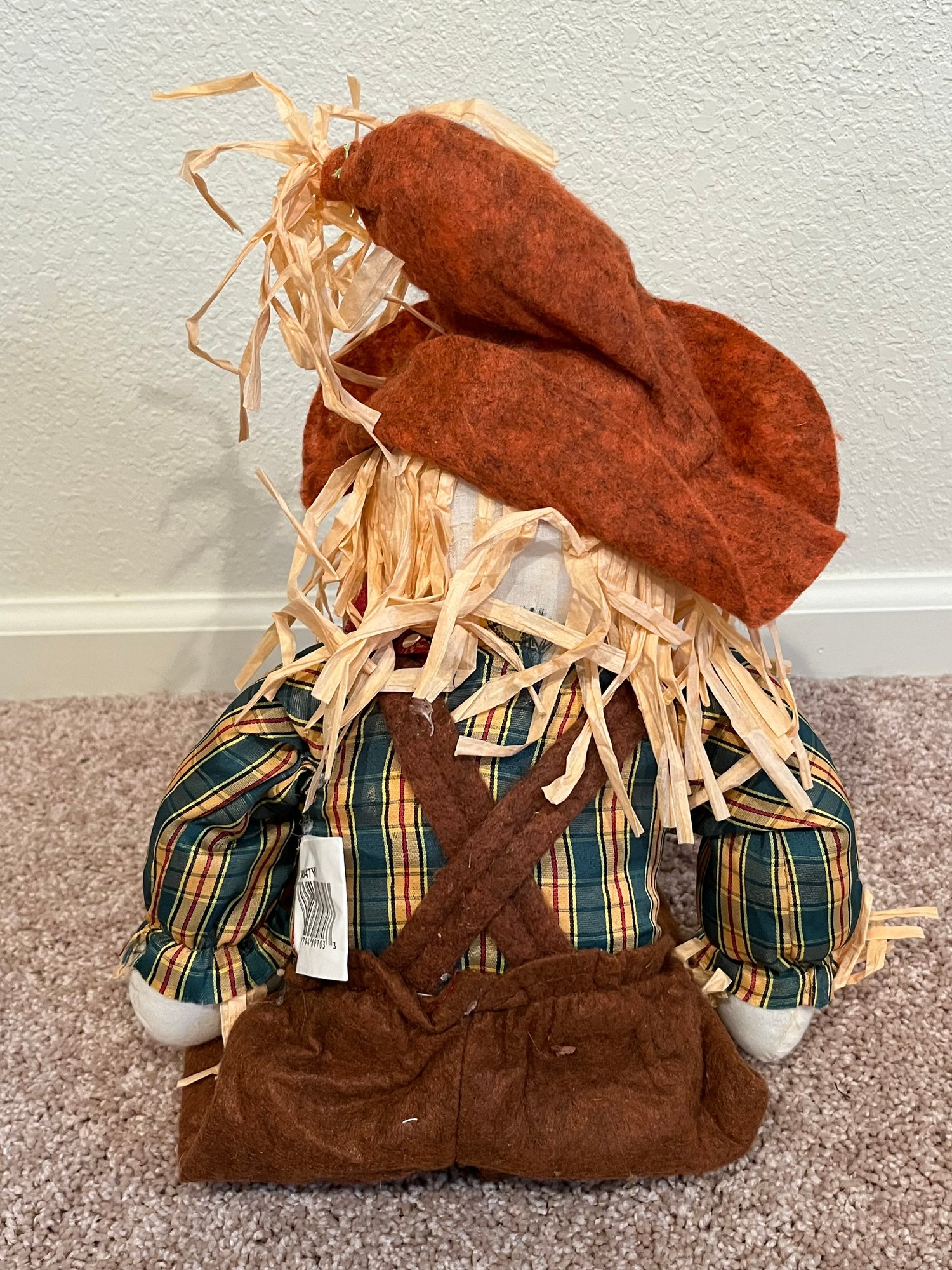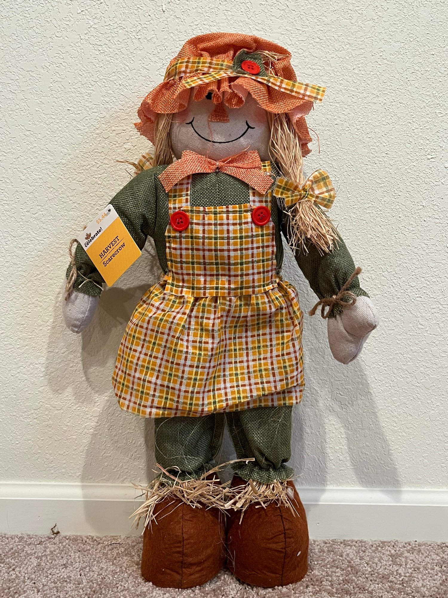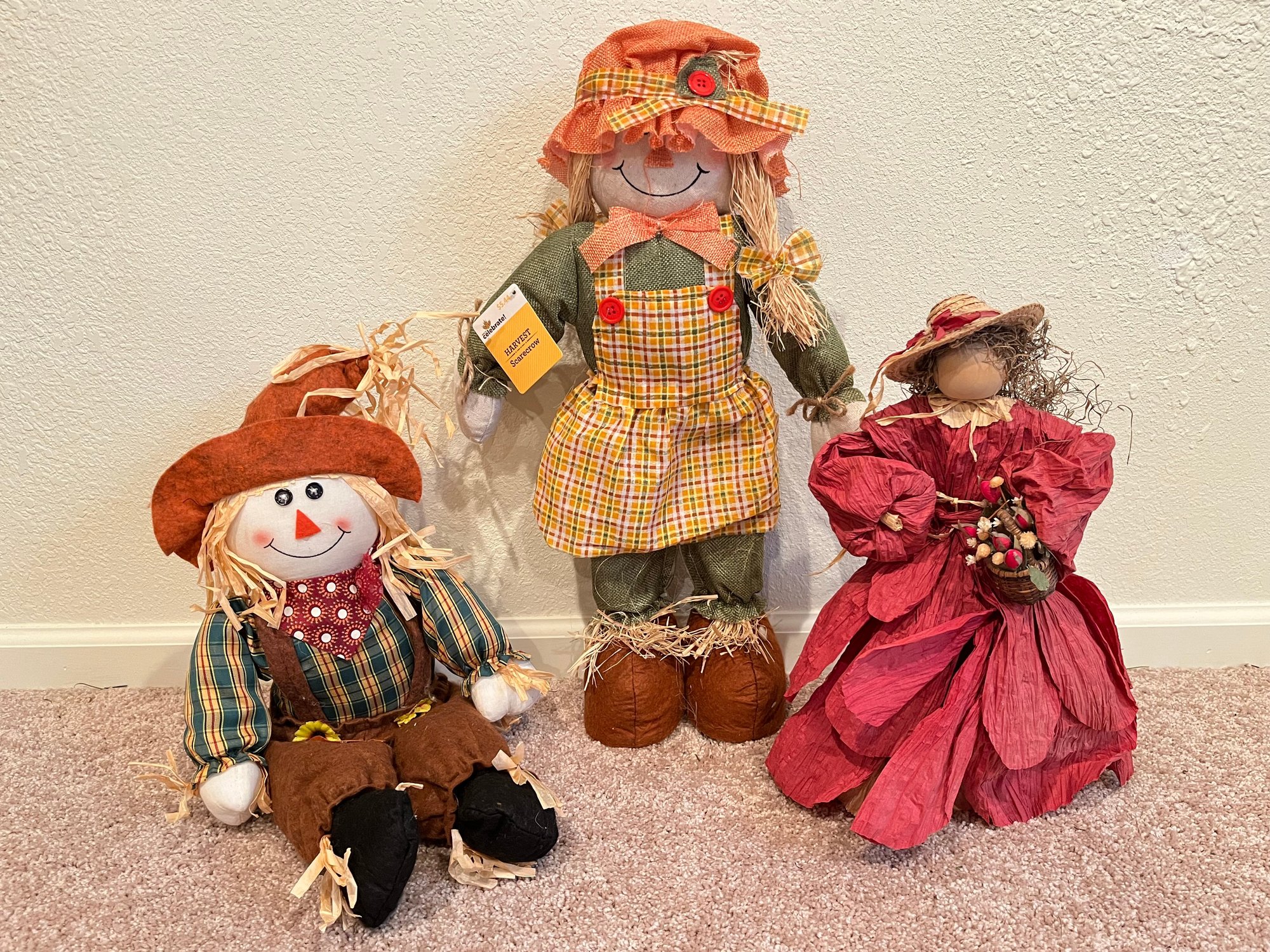 3 Fall Harvest Decorations including 1 standing lady scarecrow, 1 sitting boy scarecrow and 1 woman figure with a delicate paper “flower petal” dress. All pre owned condition, may have wear.