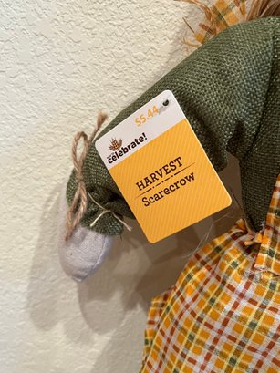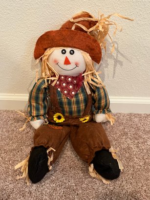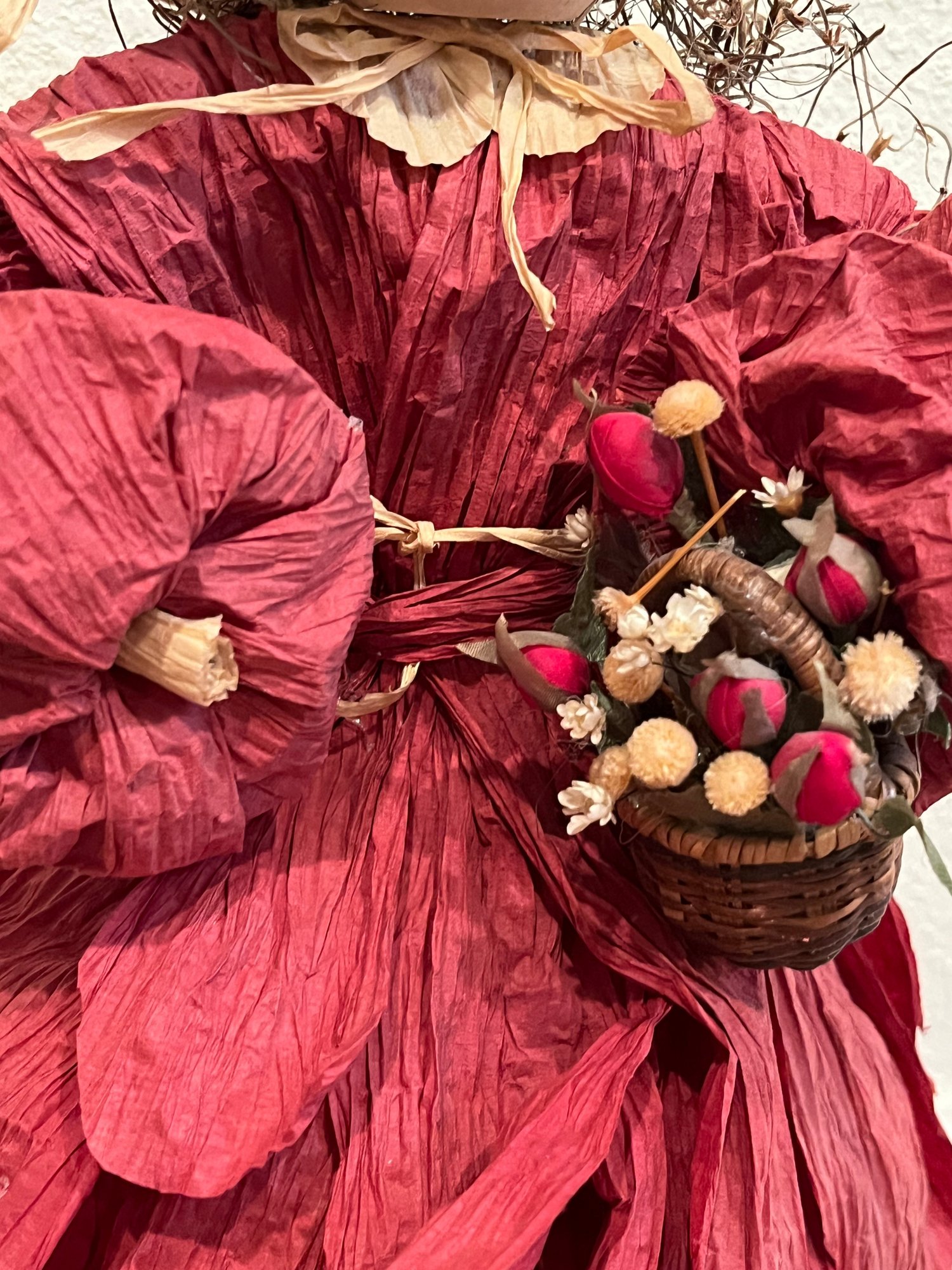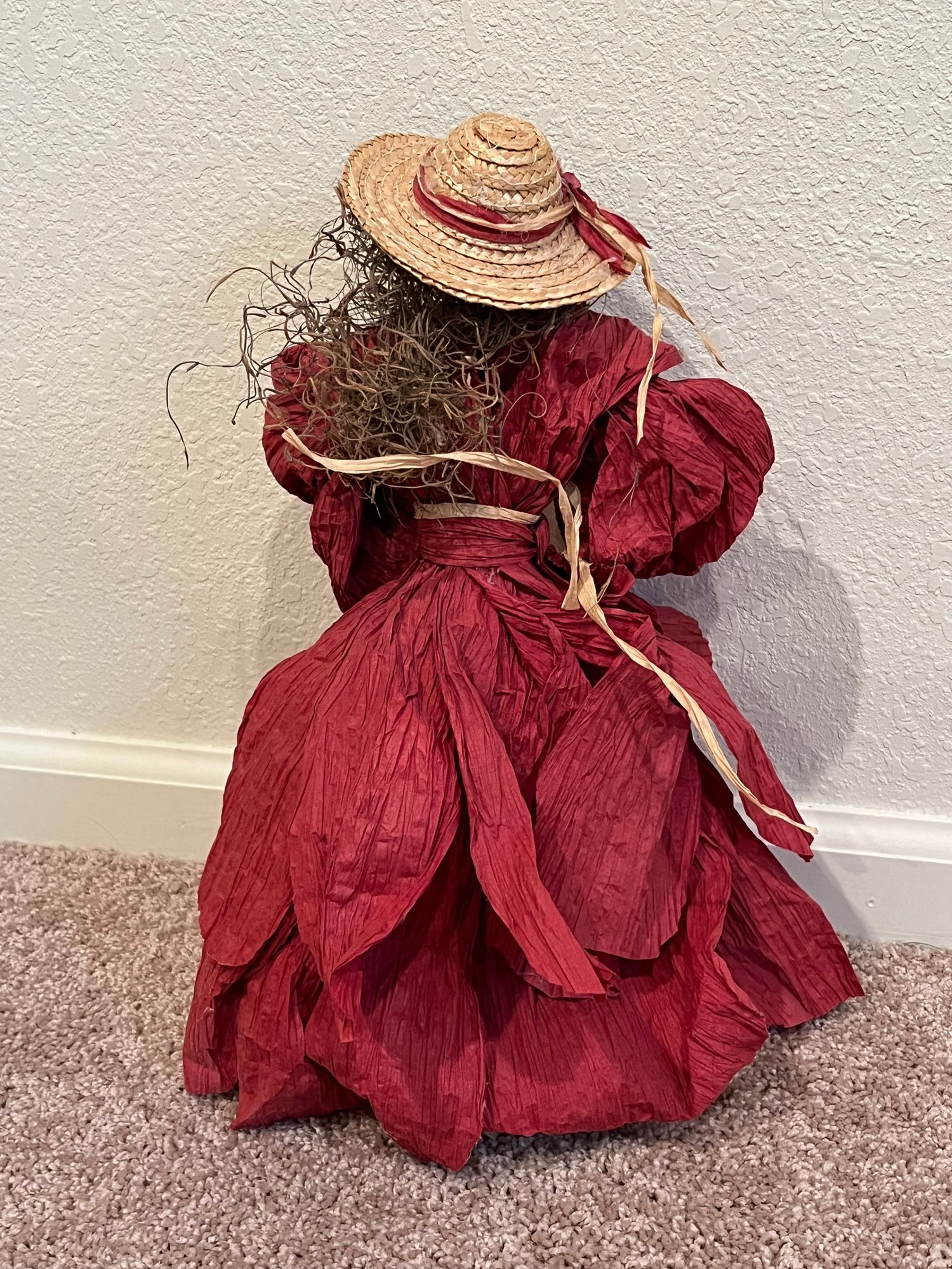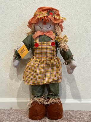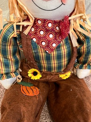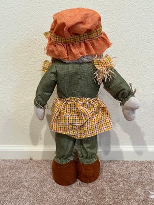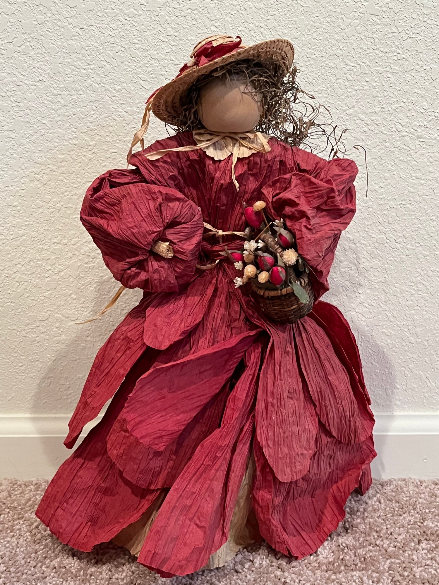3 Fall Harvest Decorations including 1 standing lady scarecrow, 1 sitting boy scarecrow and 1 woman figure with a delicate paper “flower petal” dress. All pre owned condition, may have wear.