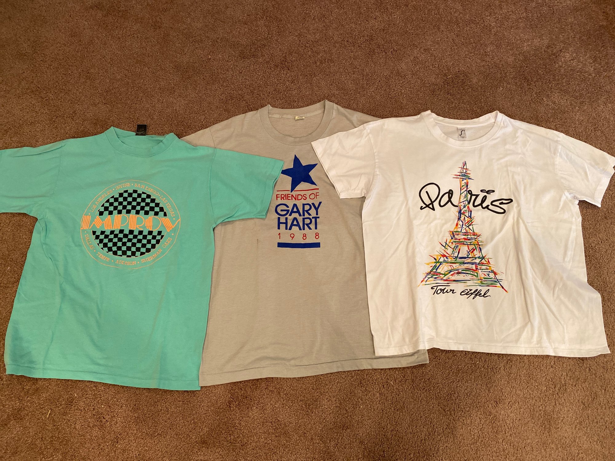 3 Vintage T Shirts, 1 teal Improv t-shirt, 1 grey Gary Hart t-shirt and 1 white paris t-shirt. All pre owned condition.
