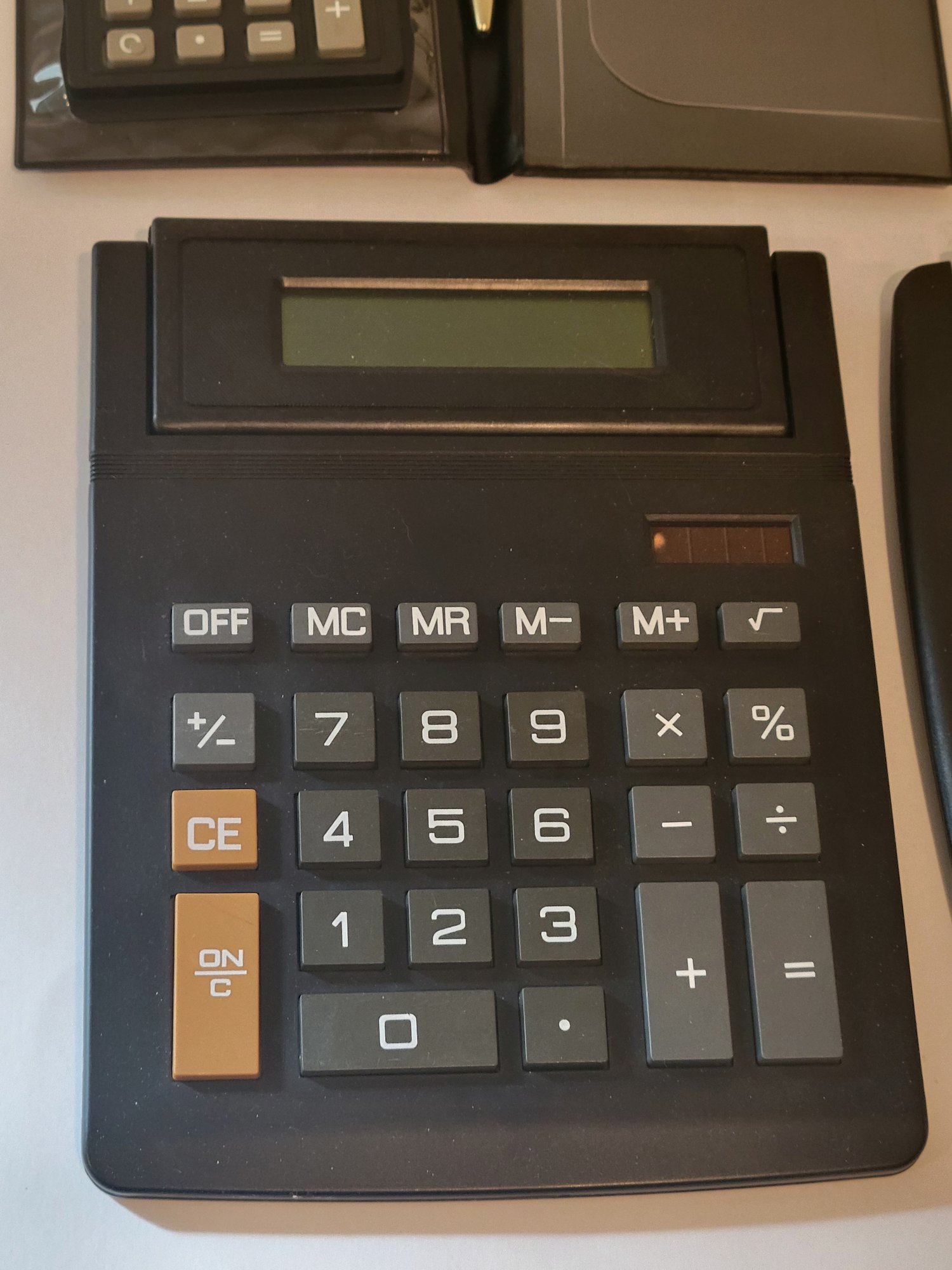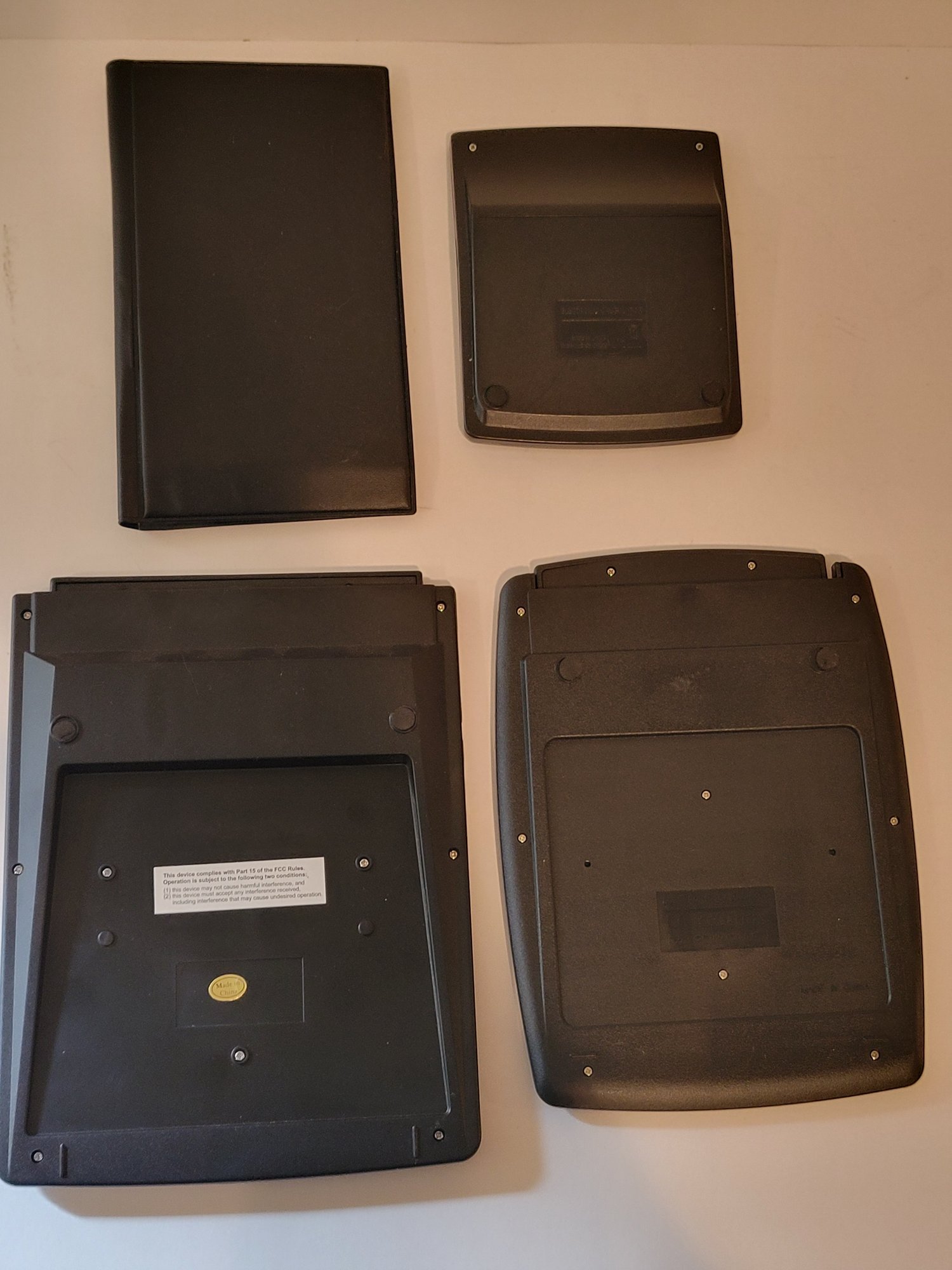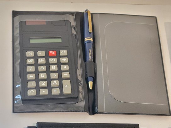 4 Desktop Solar Calculators. Sizes range from 4" x 5" to 6" x 8". One is in a pocket folder with a pen. Pre-owned condition. Not tested.