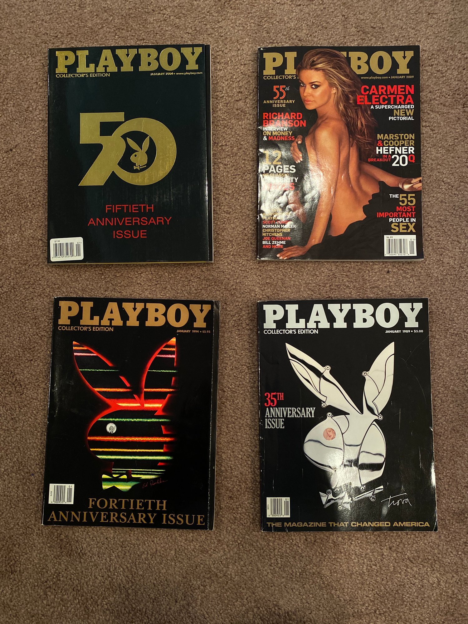 4 Playboy Magazines. 1 55th anniversary issue magazine. 1 35th anniversary issue magazine. 1 50th anniversary issue magazine. 1 40th anniversary issue magazine. All pre owned condition.
