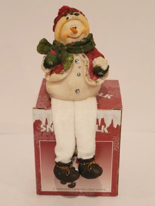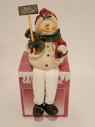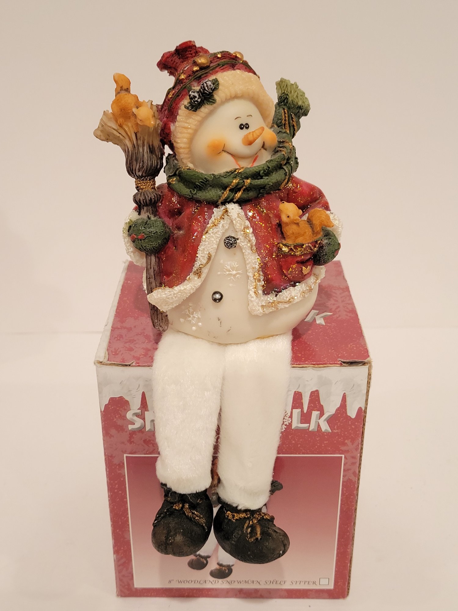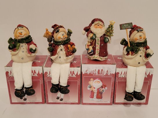 4 Snow Folk Collectible Figurines. Includes a 5" Santa. 3 shelf sitting snowman figurines. Made of resin. Measures approximately 8". One is missing let it snow sign. Pre-owned condition. Comes in original box.