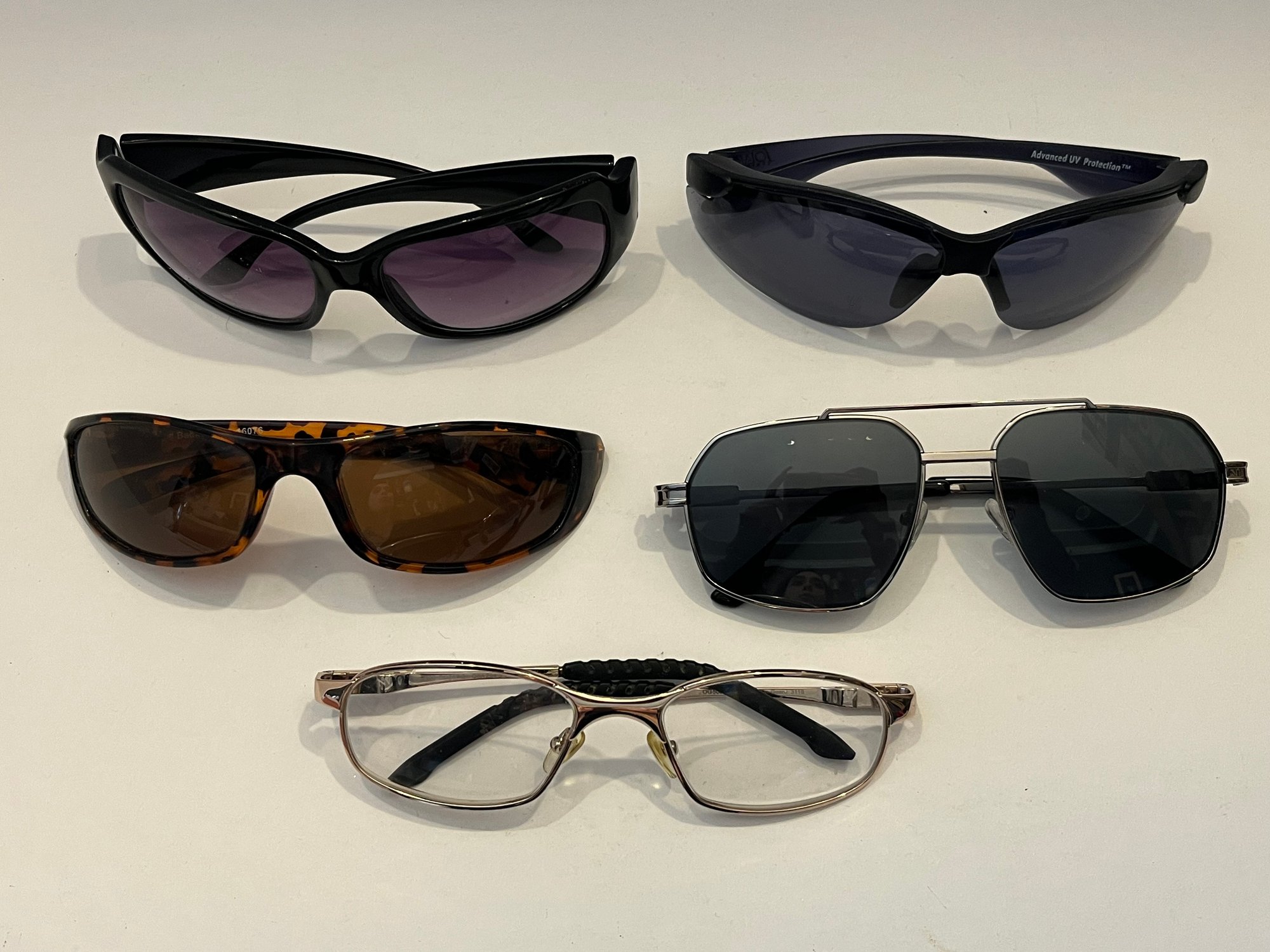 5 Pair Of Assorted Sun And Eye Glasses Lot. Including 1 pair of black Solar Comfort sunglasses, 1 pair of Prive Revaux polarized sunglasses. 1 pair of large frame and purple lenses sun glasses, 1 pair of ONE polarized backwoods sunglasses and 1 pair of gold toned prescription eyeglasses. All pre owned condition, may have wear.