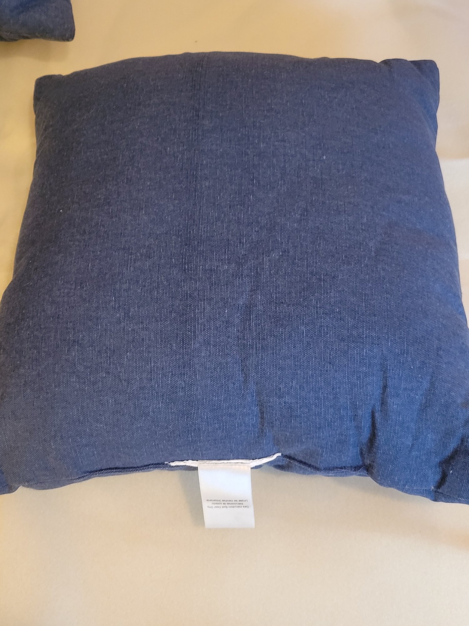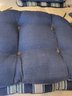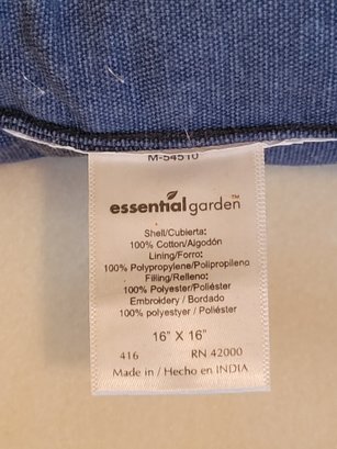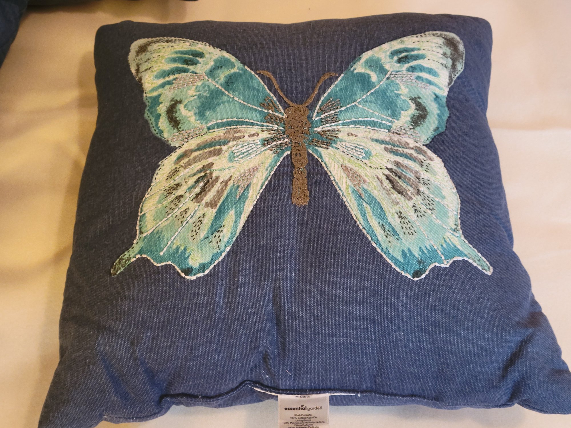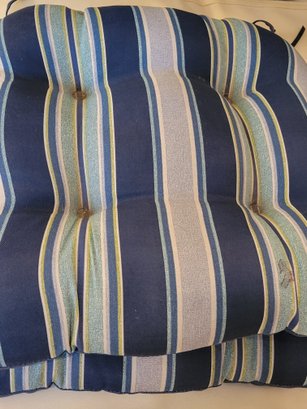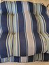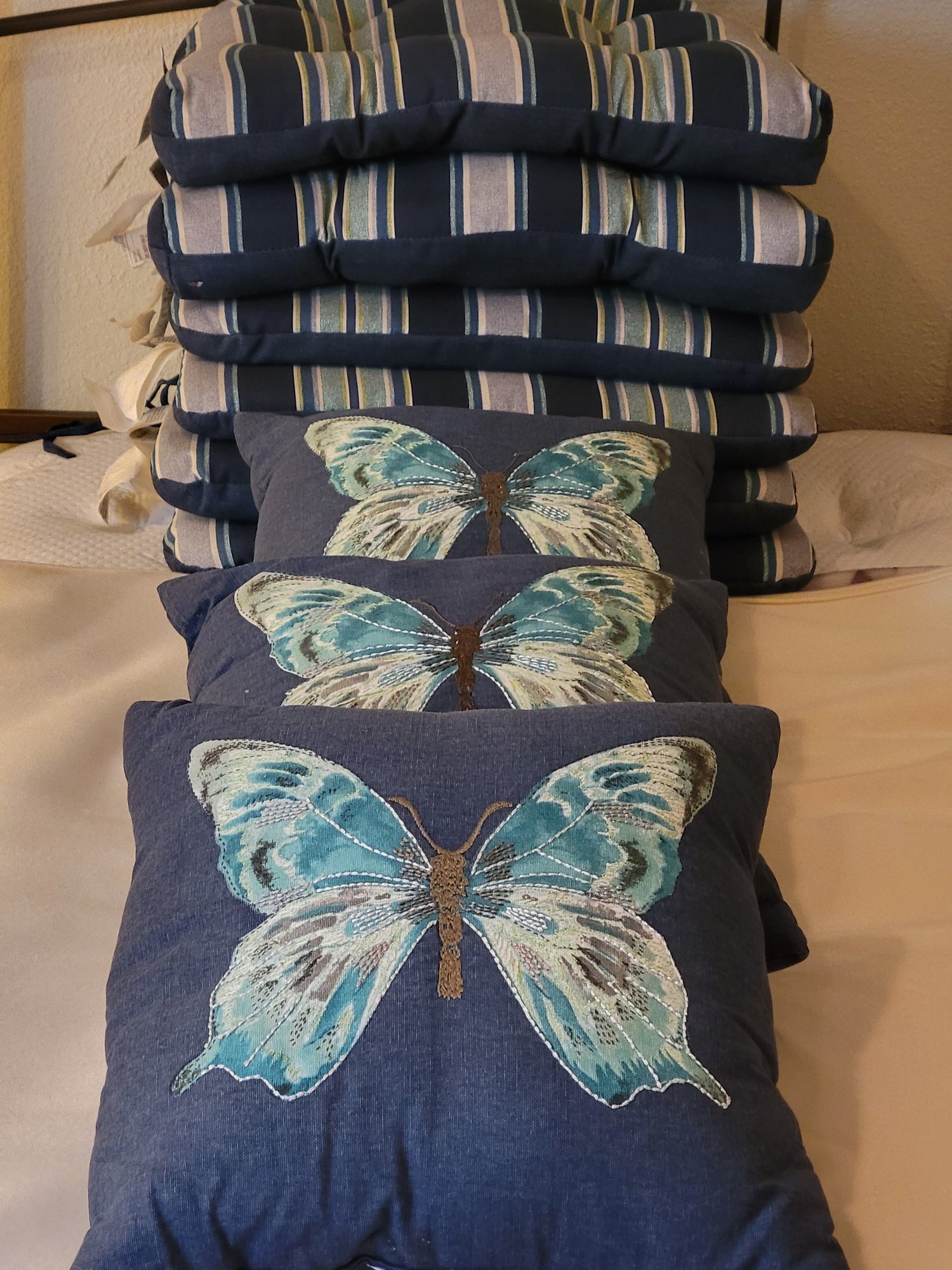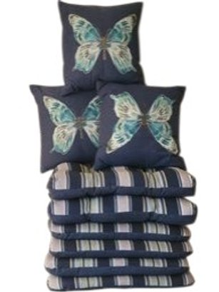 6 Outdoor Seat Cushions And 3 Butterfly Design Throw Pillows. Includes 3 Essential Gardens 16" x 16" Throw Pillows. Also 6 Striped 19" x 19" Outdoor Seat Cushions. Pre-owned condition. May need cleaning.