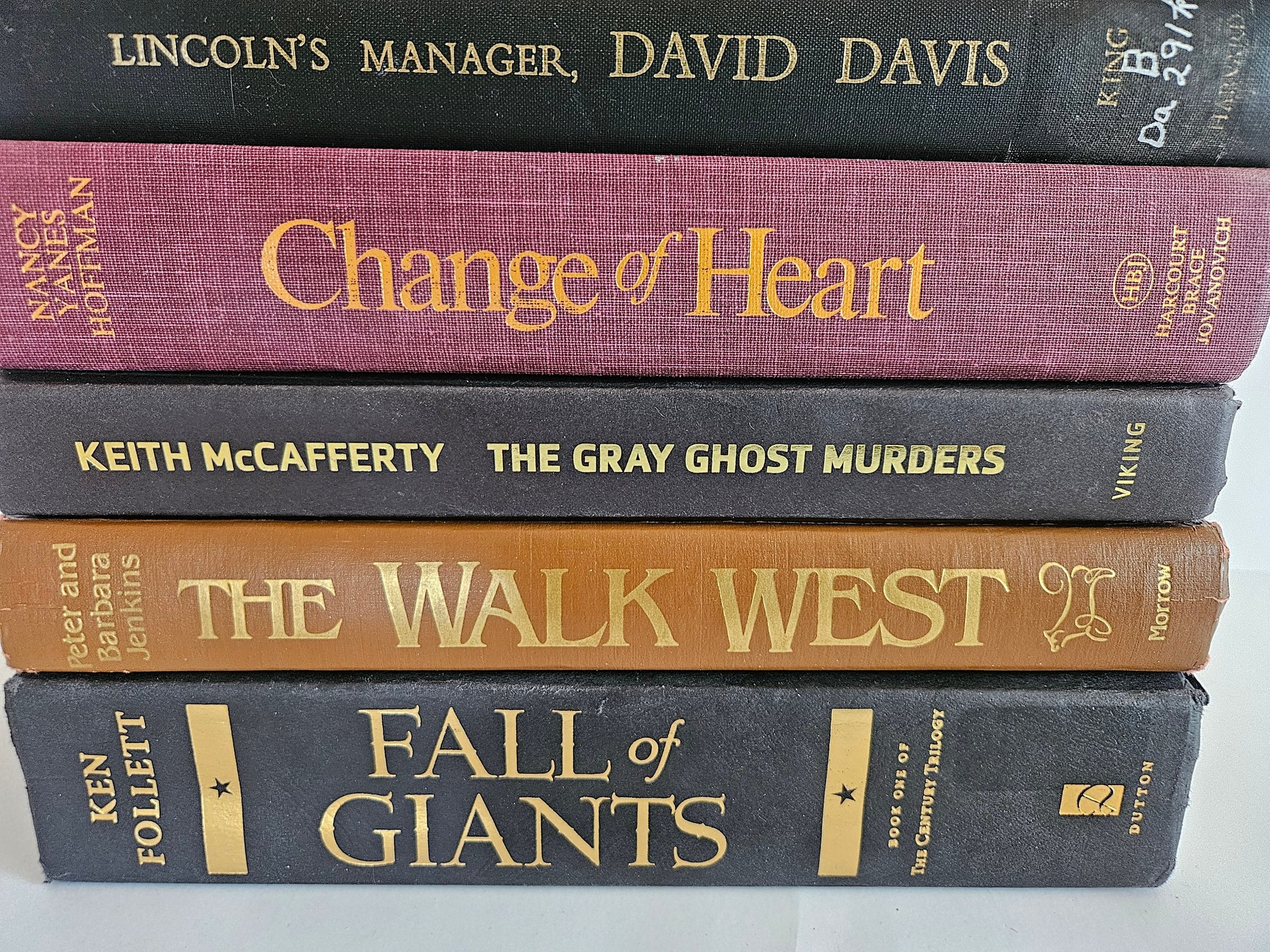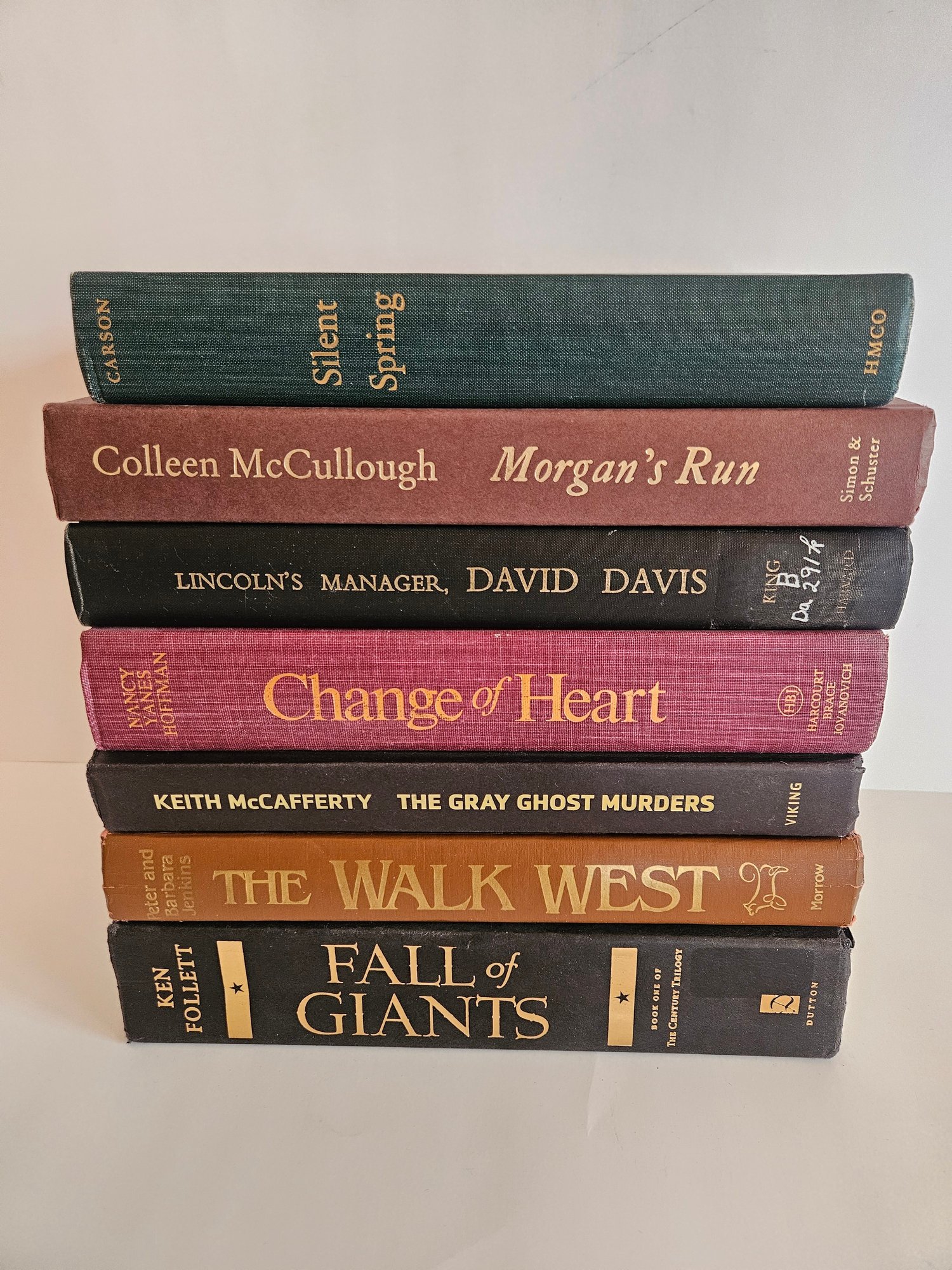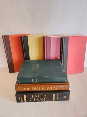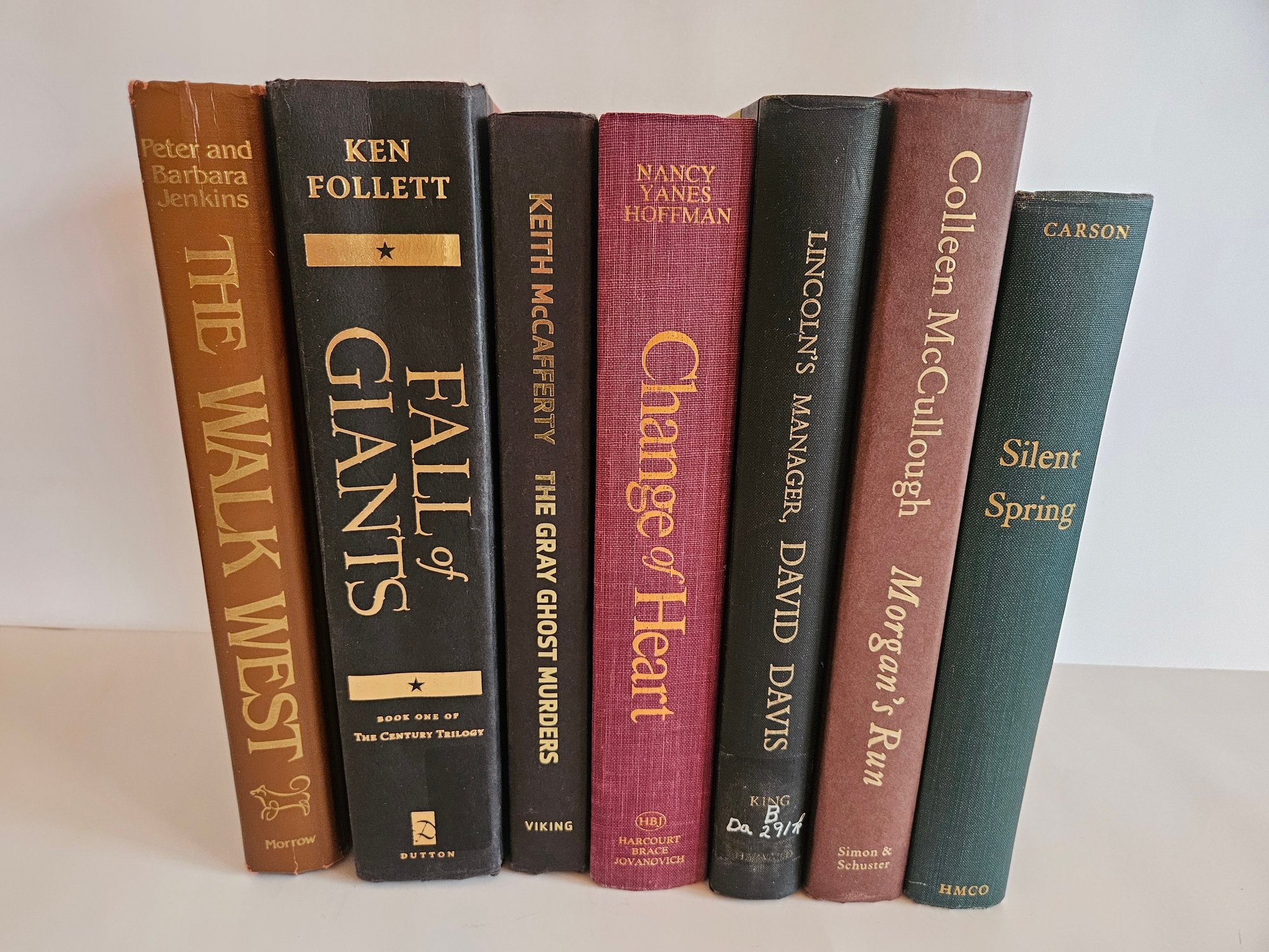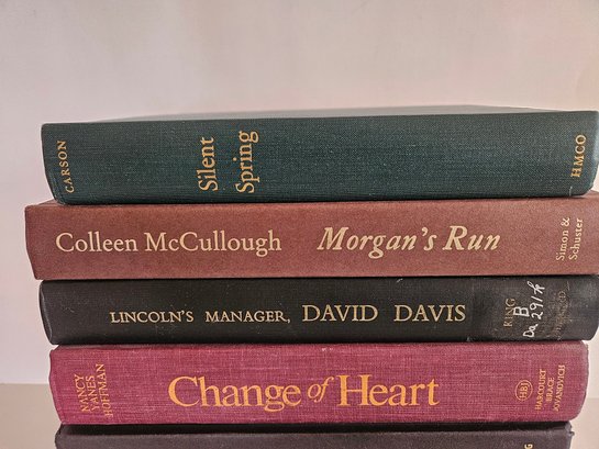 7 Embossed Novels Hardcover Books. Includes The Walk West, Fall of Giants, The Ghost Murders, Change of Heart, Lincoln's Manager, Morgan's Run, and Silent Spring. From various decades. Each has a gold tone embossed title on the spine. Pre-owned condition. May have wear.