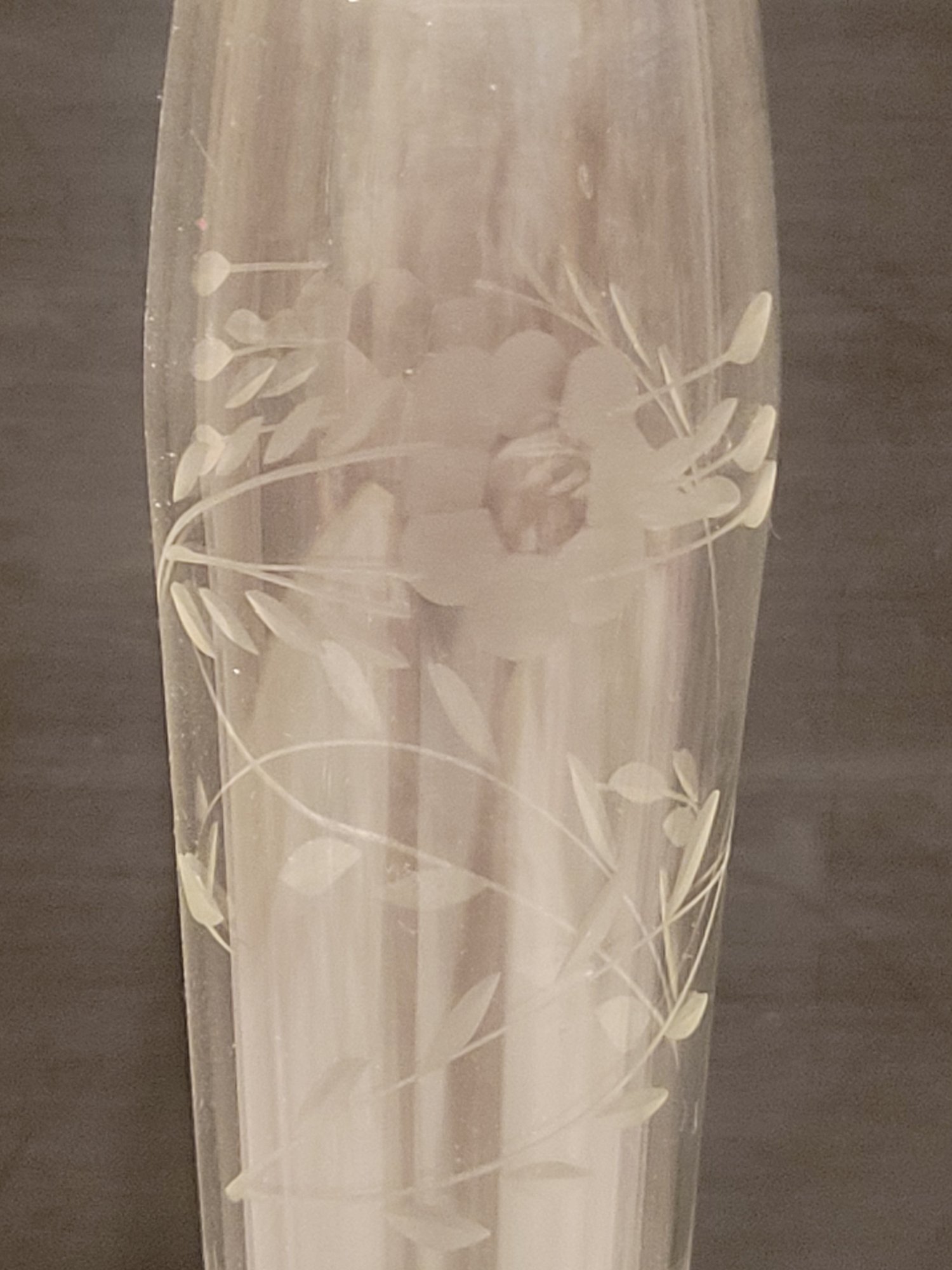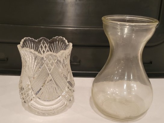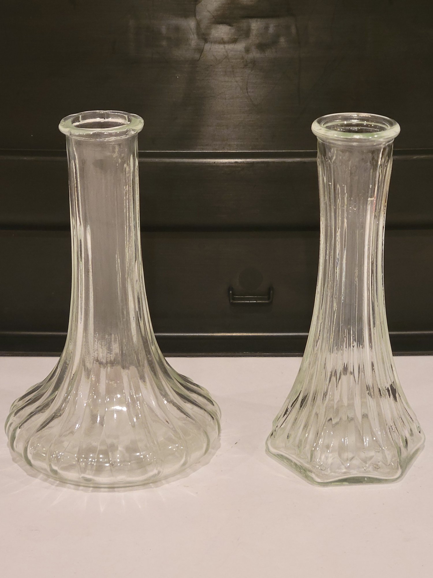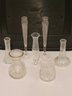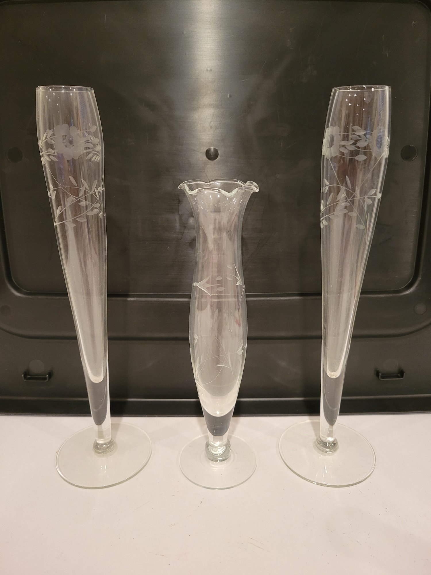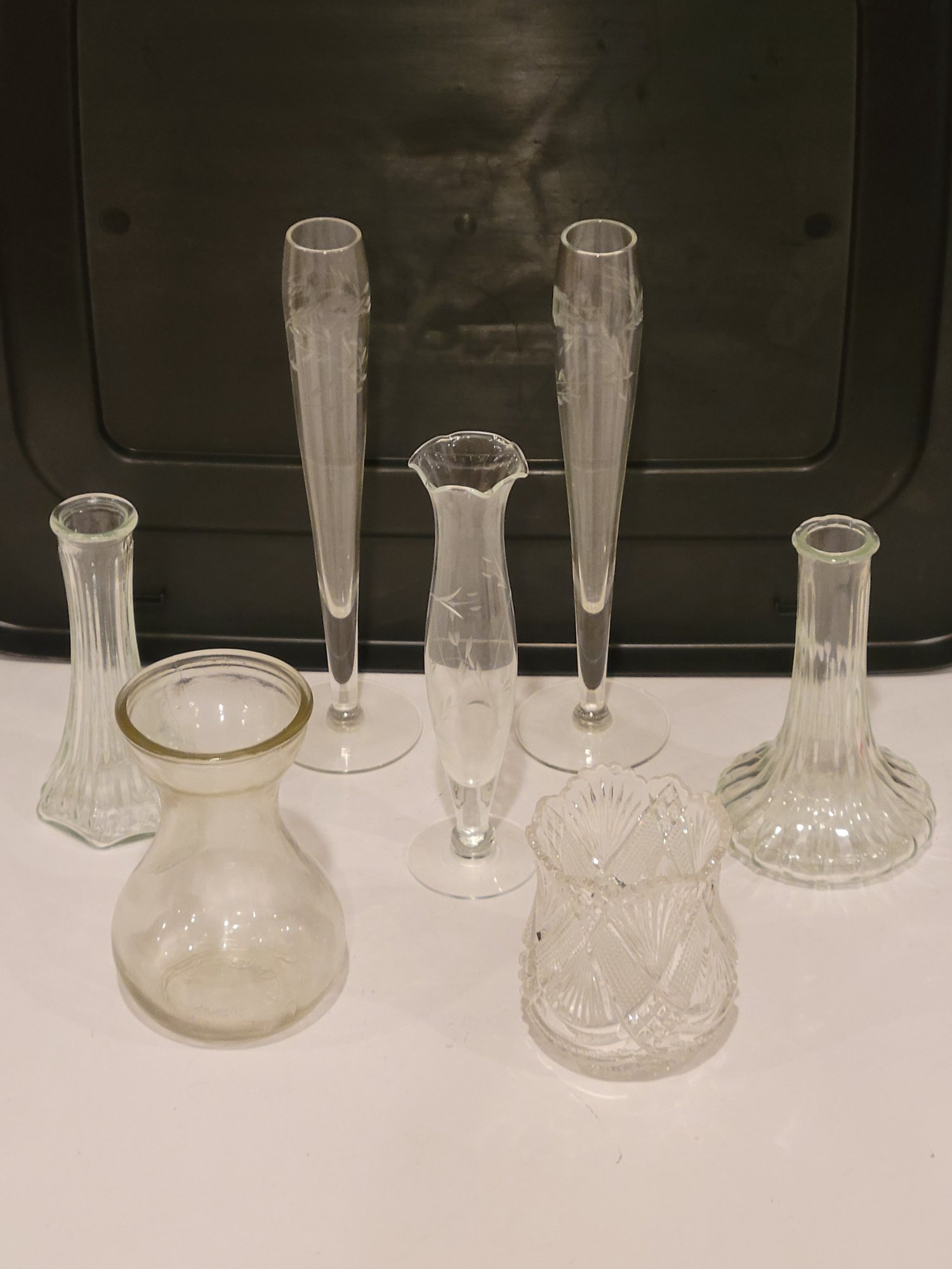 7 Vtg Clear Glass Vases And Bud Vases. Size ranges from 4" to 10". The bud Vases have a etched floral design. 2 have a ribbed design and one is cut glass. Pre-owned condition.