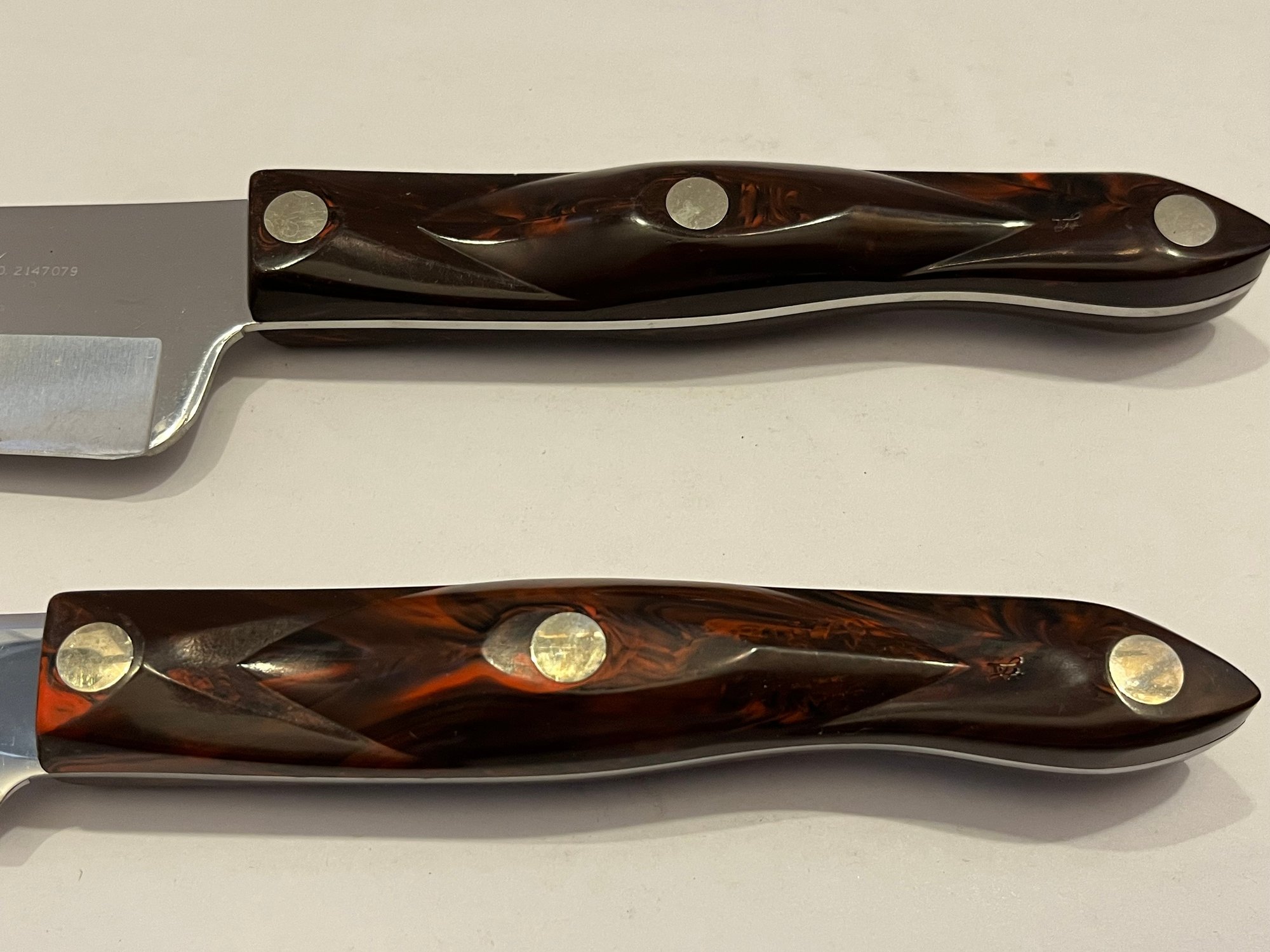 come with red tone wooden handles. Pre owned condition, may have wear.