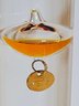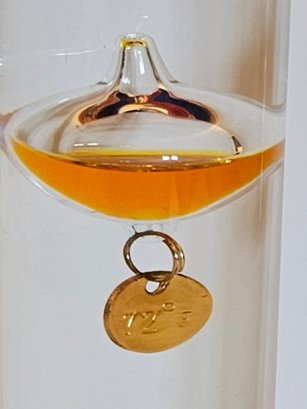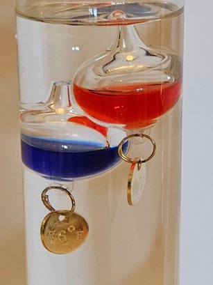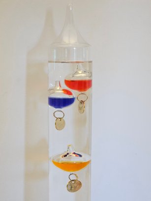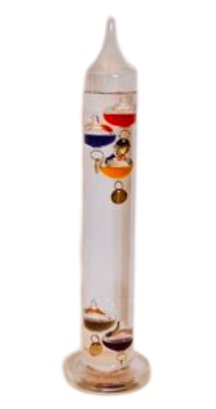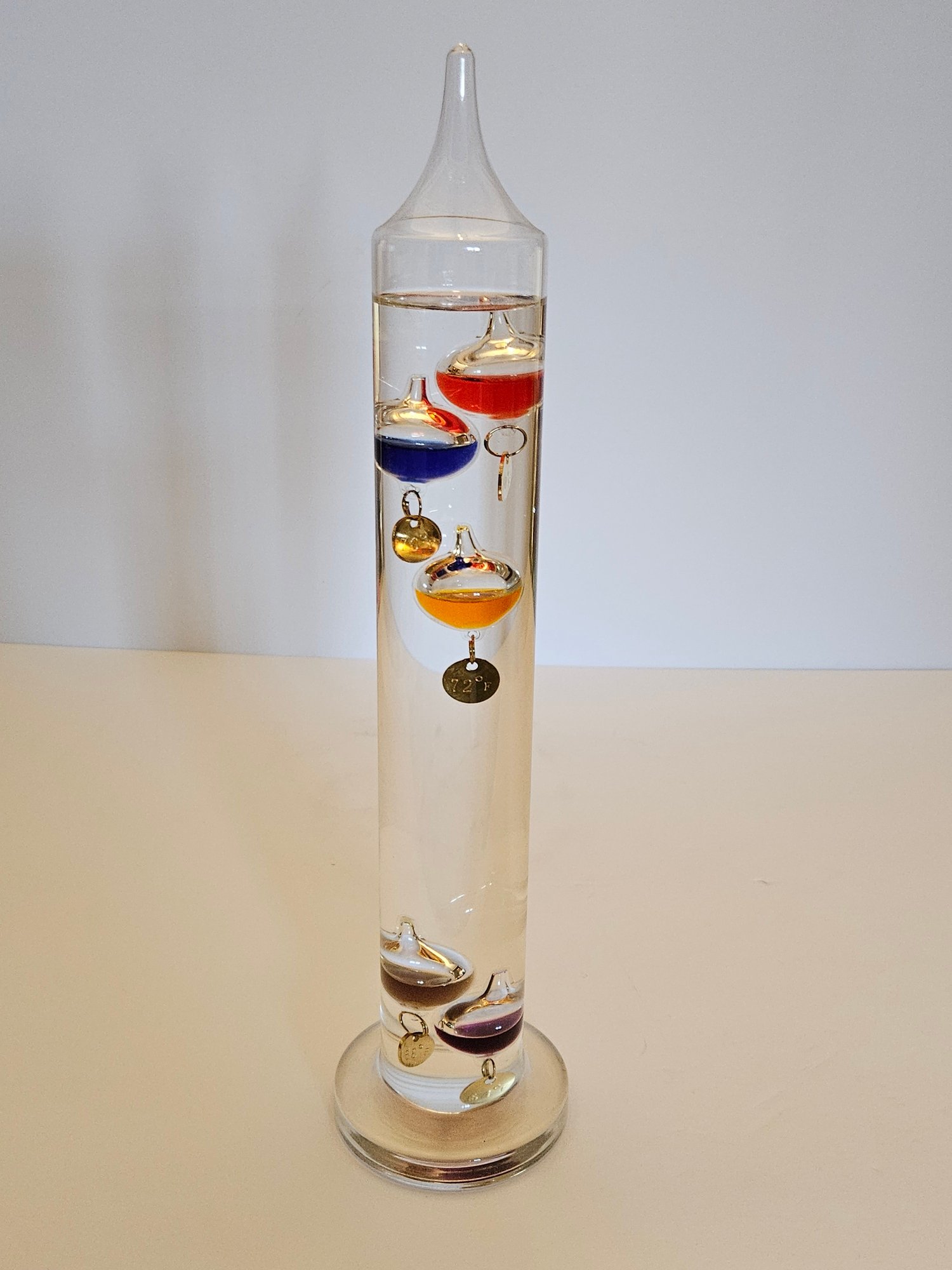 It consists of a sealed glass cylinder filled with a clear liquid and several glass spheres (floats) of varying densities.