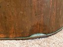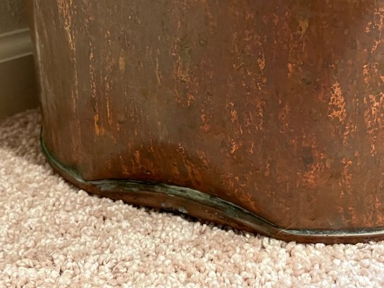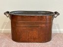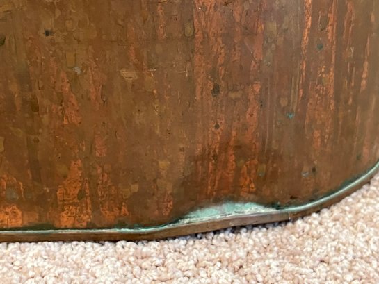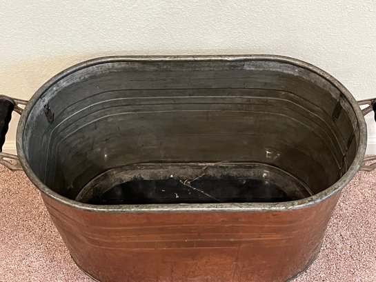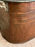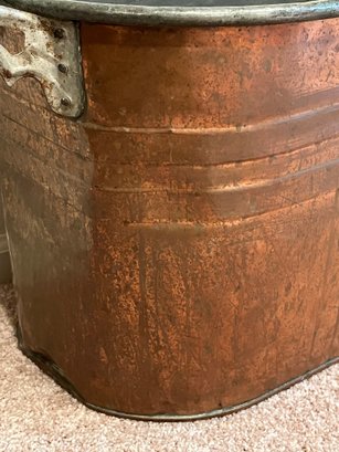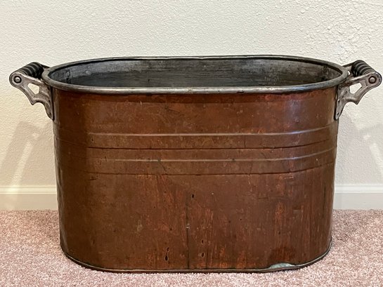 antique copper wash boiler, Historically utilized for laundry, canning, or plucking poultry. Popular today as rustic decor or planters. Comes with wooden handles and a copper metal body. Measures approximately 25”L x 12”D x 13”H. Pre owned condtion, has wear.