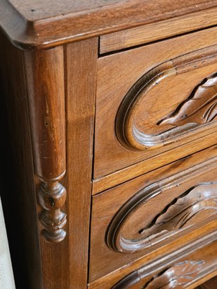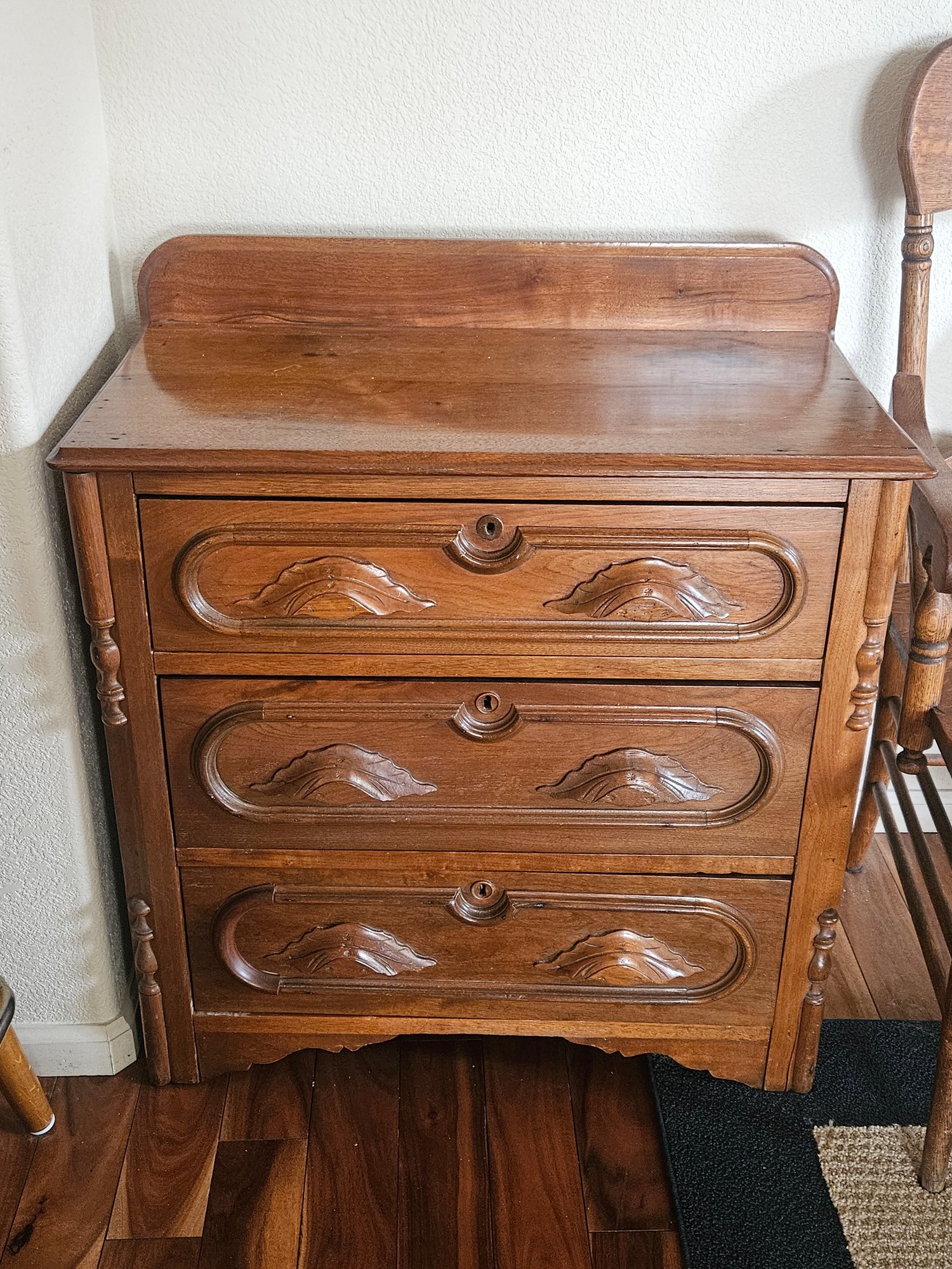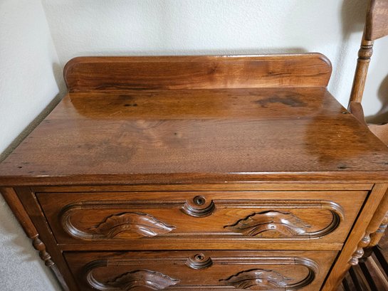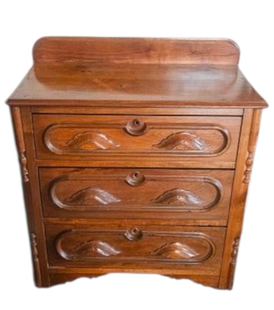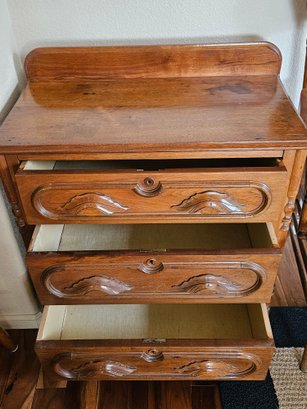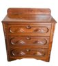 This item is a Victorian-era solid walnut antique chest of drawers, likely dating from the late 19th century. The chest features distinct "racetrack" moldings around the drawers and ornate, carved wooden drawer pulls and includes a small back gallery or splash board on the top surface, designed to prevent items from falling behind the chest. Measures approximately 29"w x 31"h x 15.5"d. Pre-owned condition.