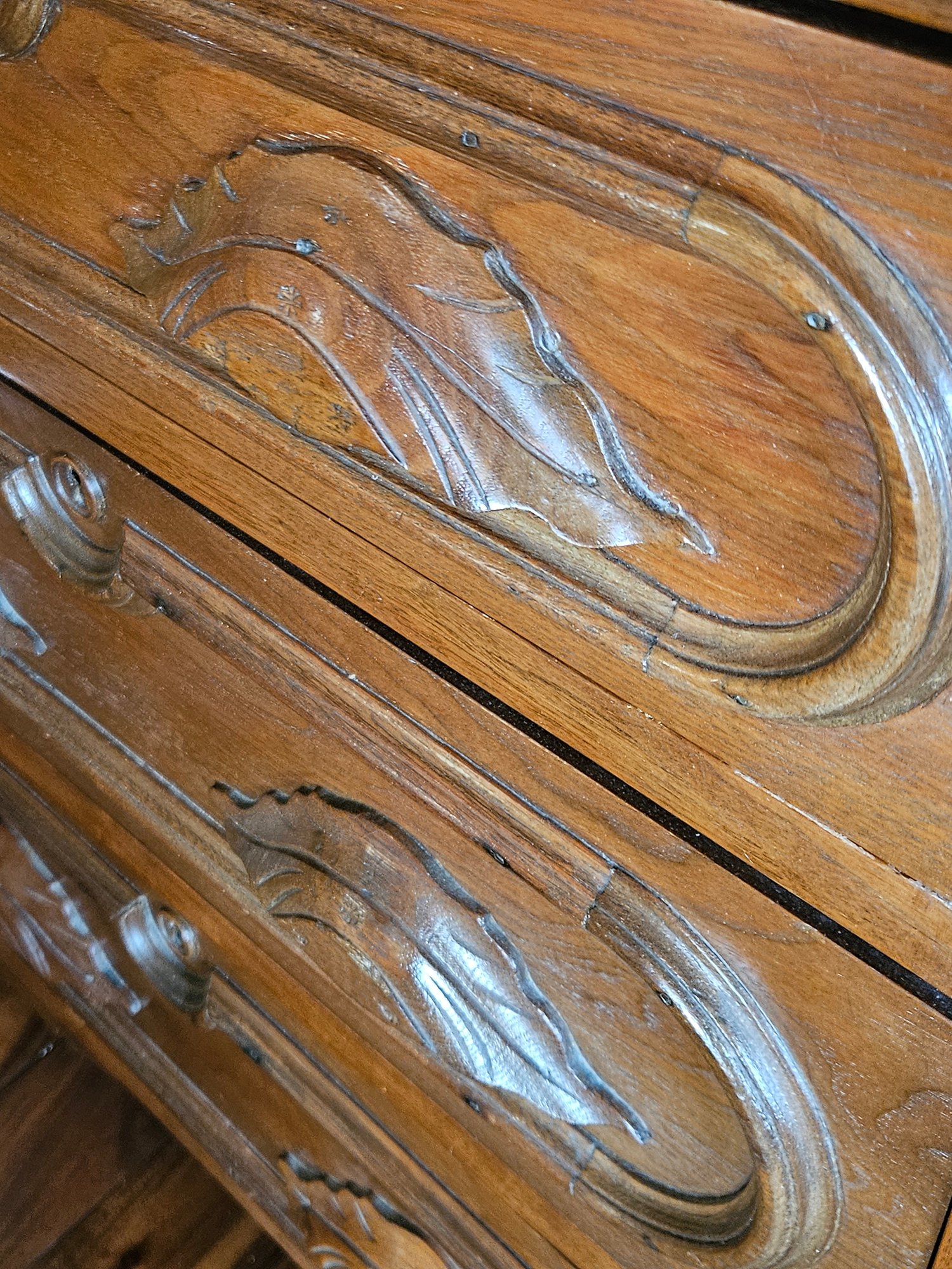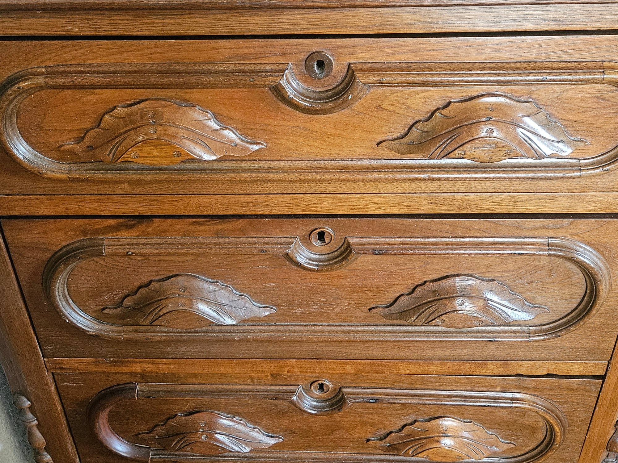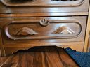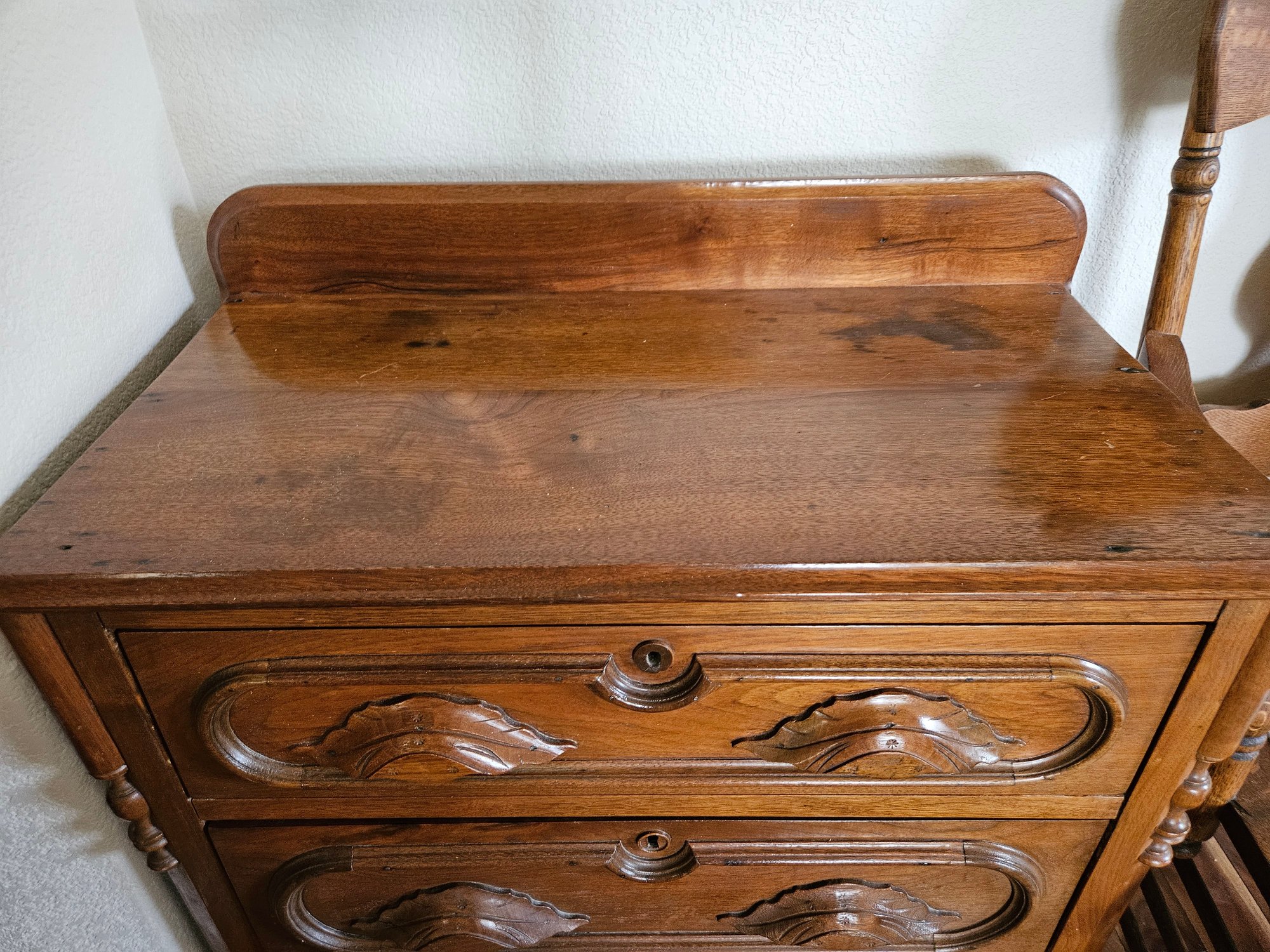 This item is a Victorian-era solid walnut antique chest of drawers, likely dating from the late 19th century. The chest features distinct "racetrack" moldings around the drawers and ornate, carved wooden drawer pulls and includes a small back gallery or splash board on the top surface, designed to prevent items from falling behind the chest. Measures approximately 29"w x 31"h x 15.5"d. Pre-owned condition.