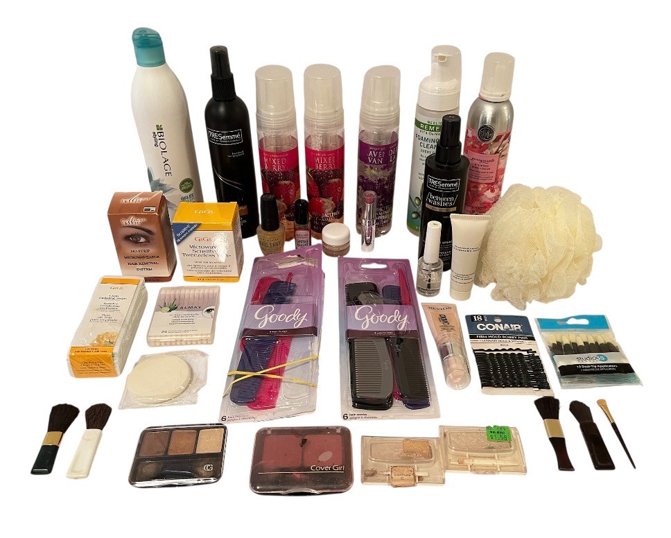 Assorted Beauty And Bathroom Lot inclduing Biolage styling gel, hair spray, body lotion, wax, eye shadow, combs, a loofa and more ! All pre owned condition.