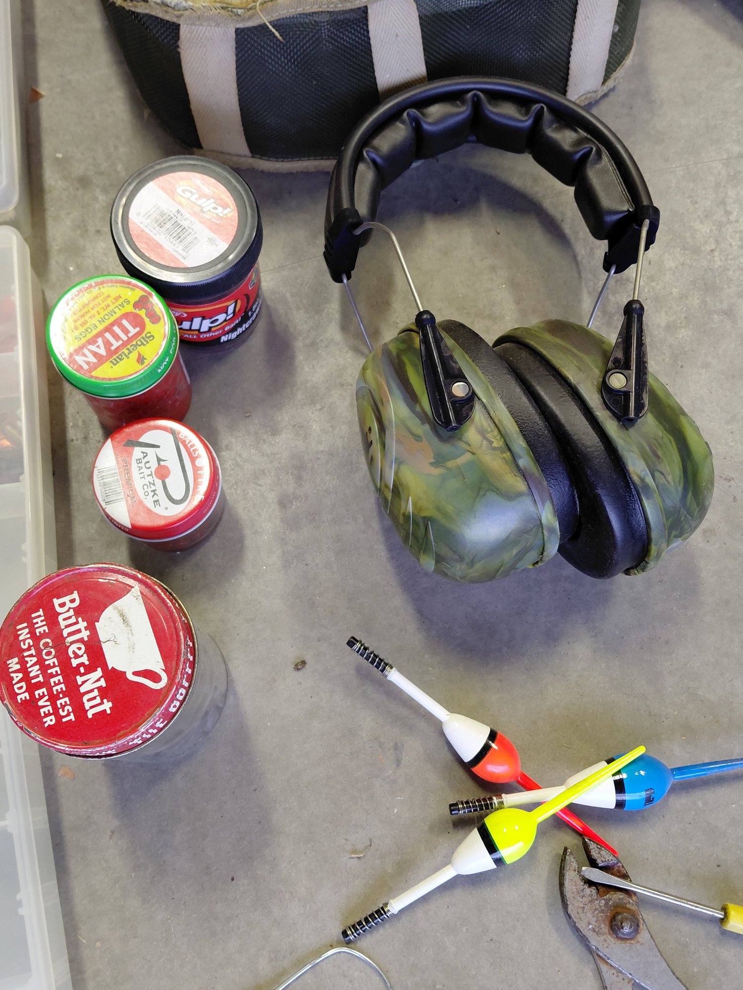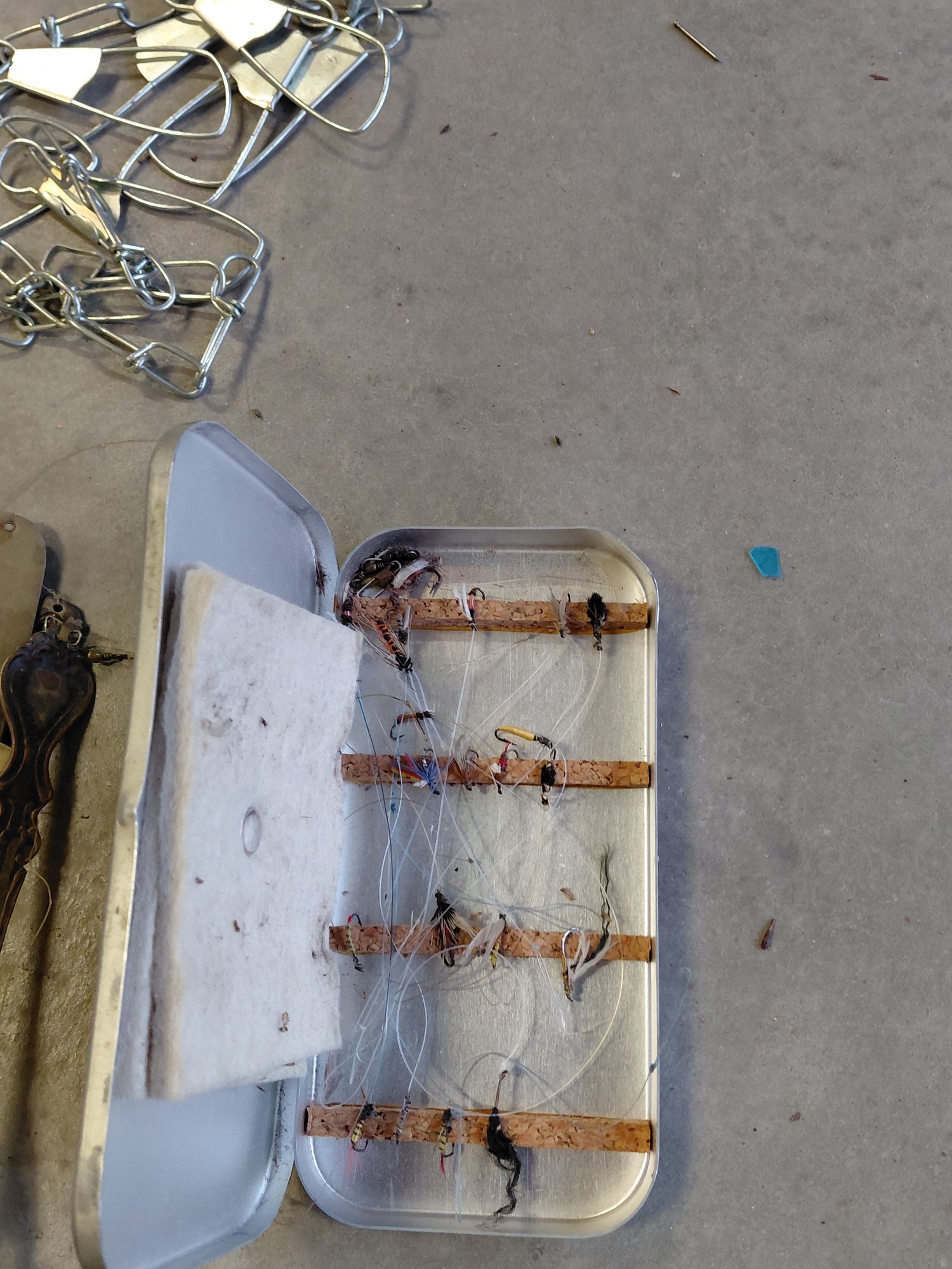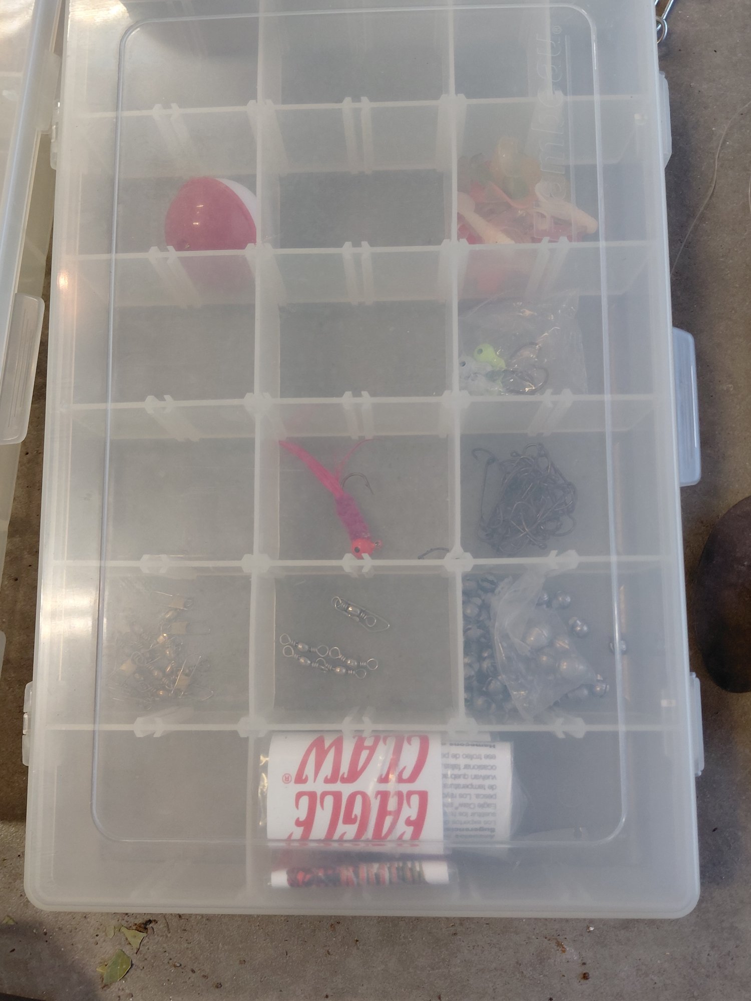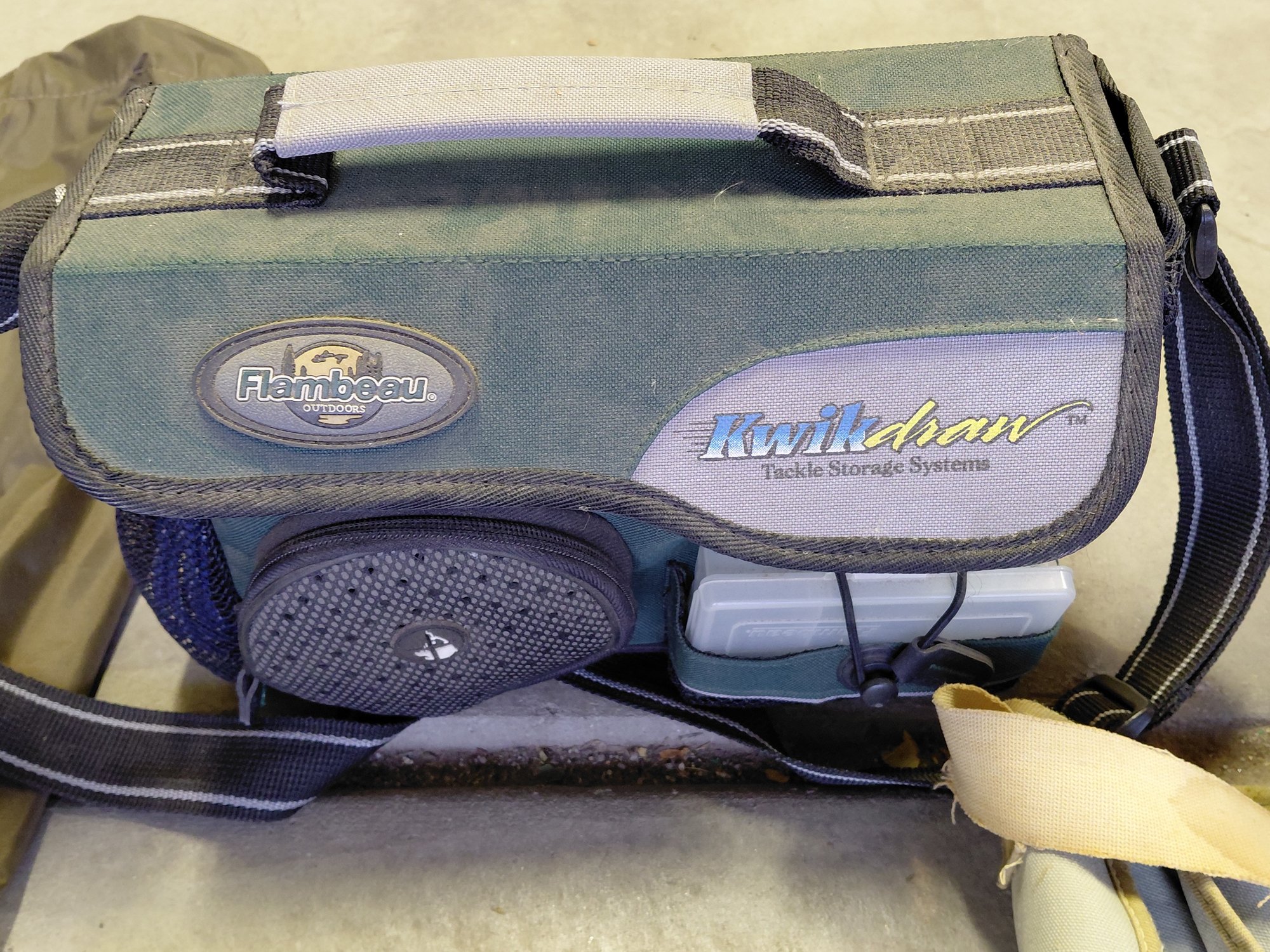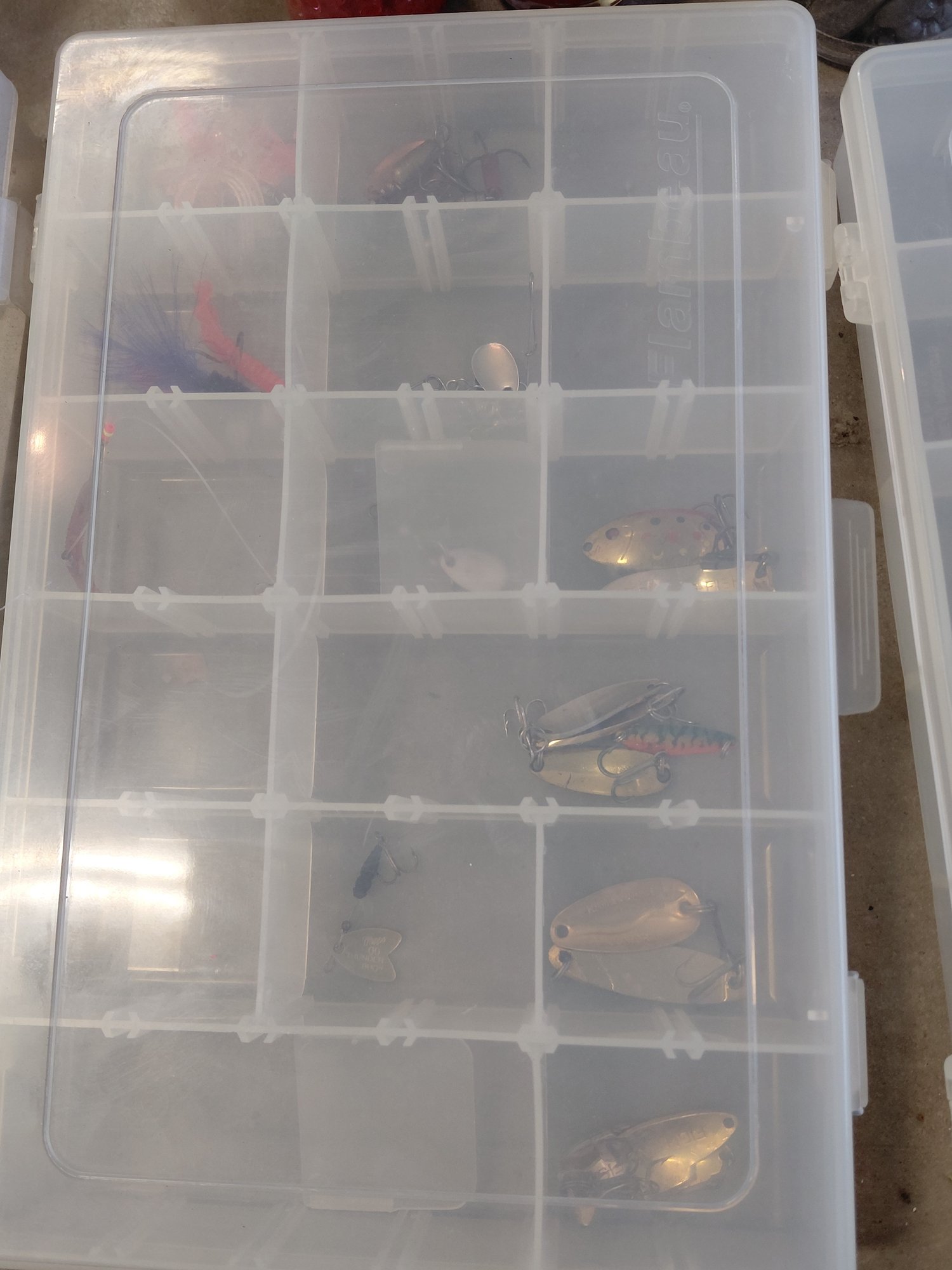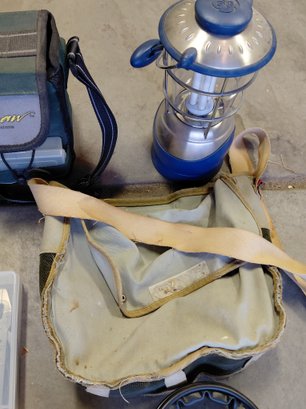 Assorted Fishing Lot fishing lures Tackle boxes Waders size10 or 11 misceallenous items .