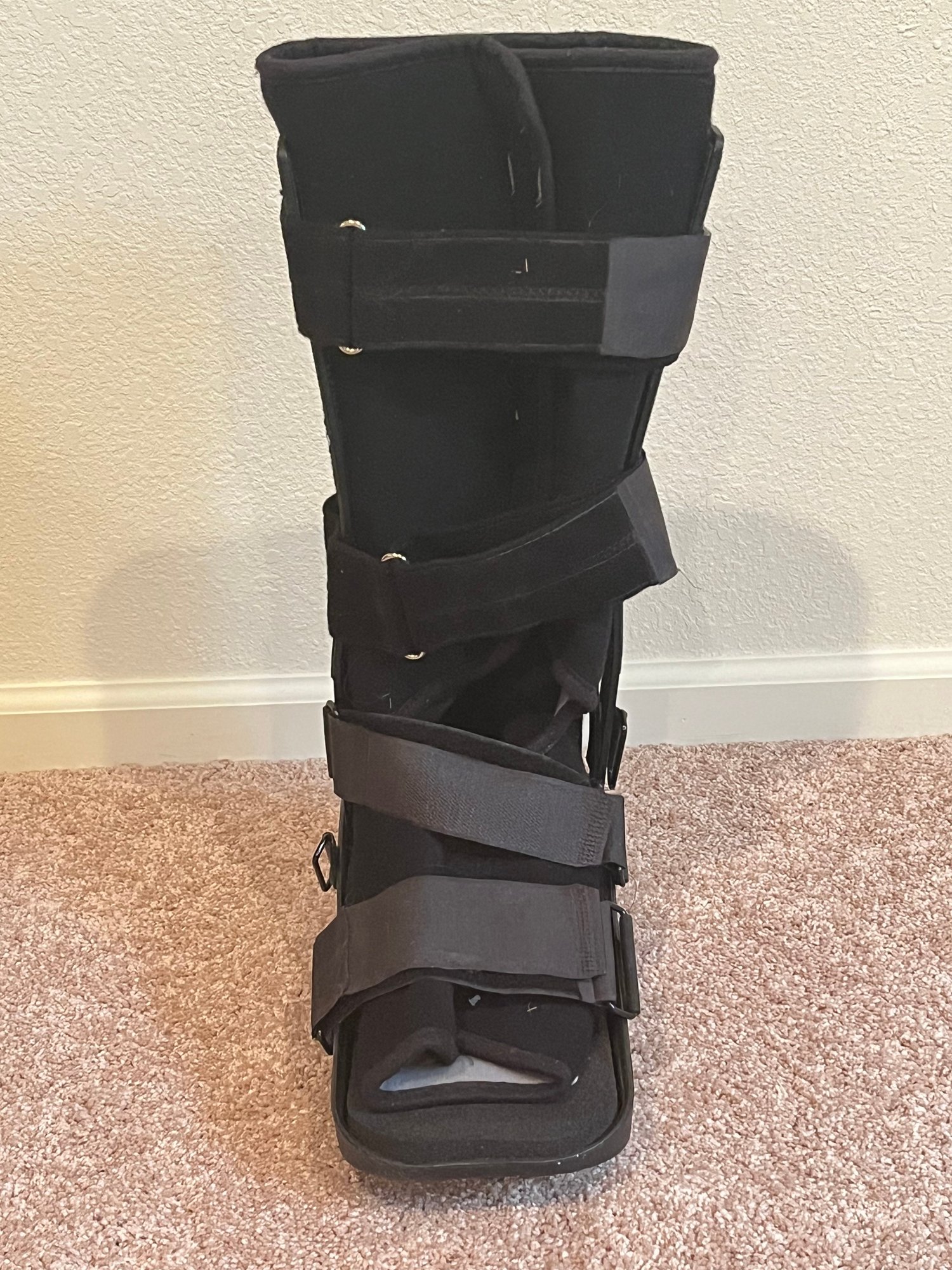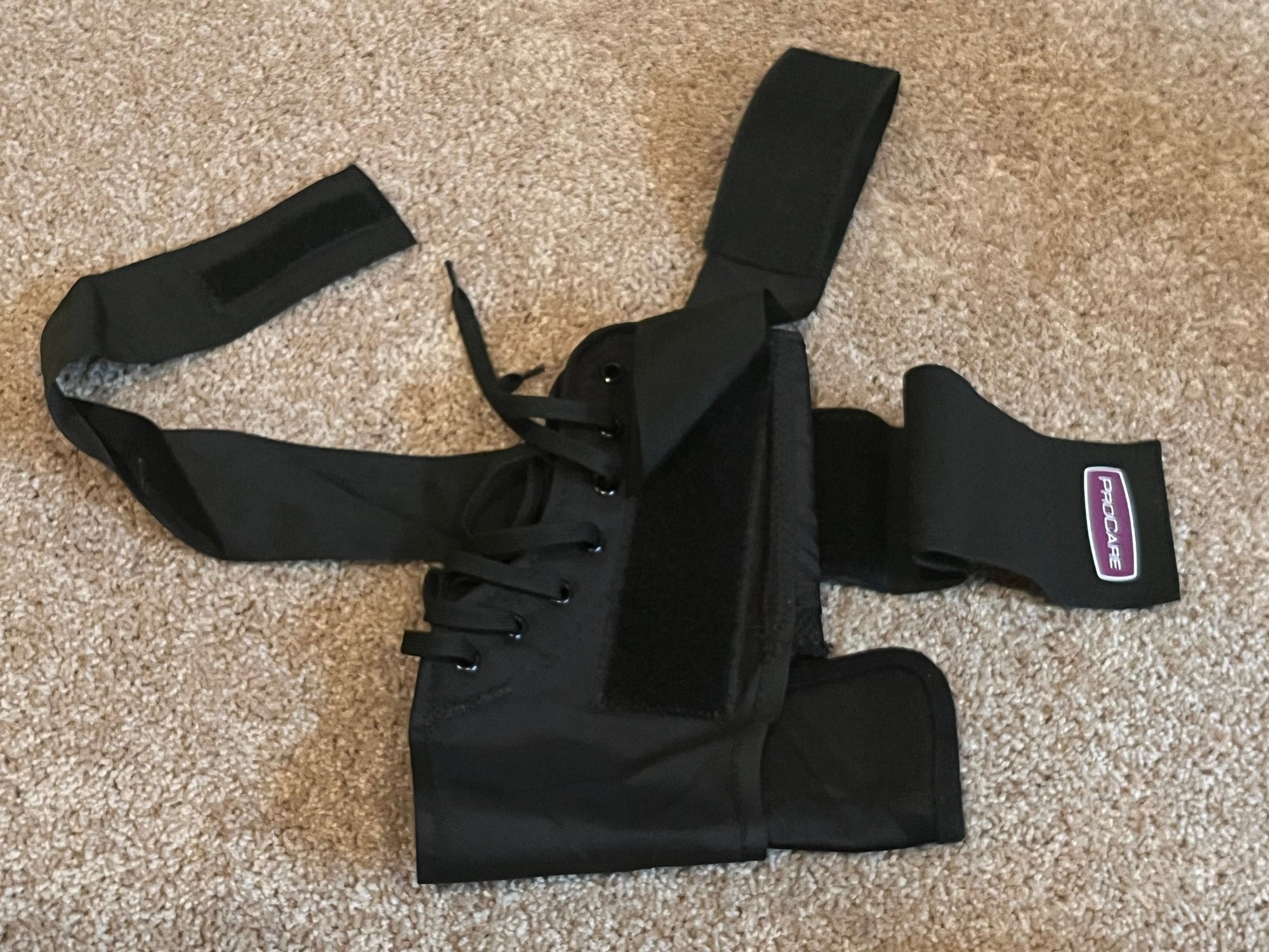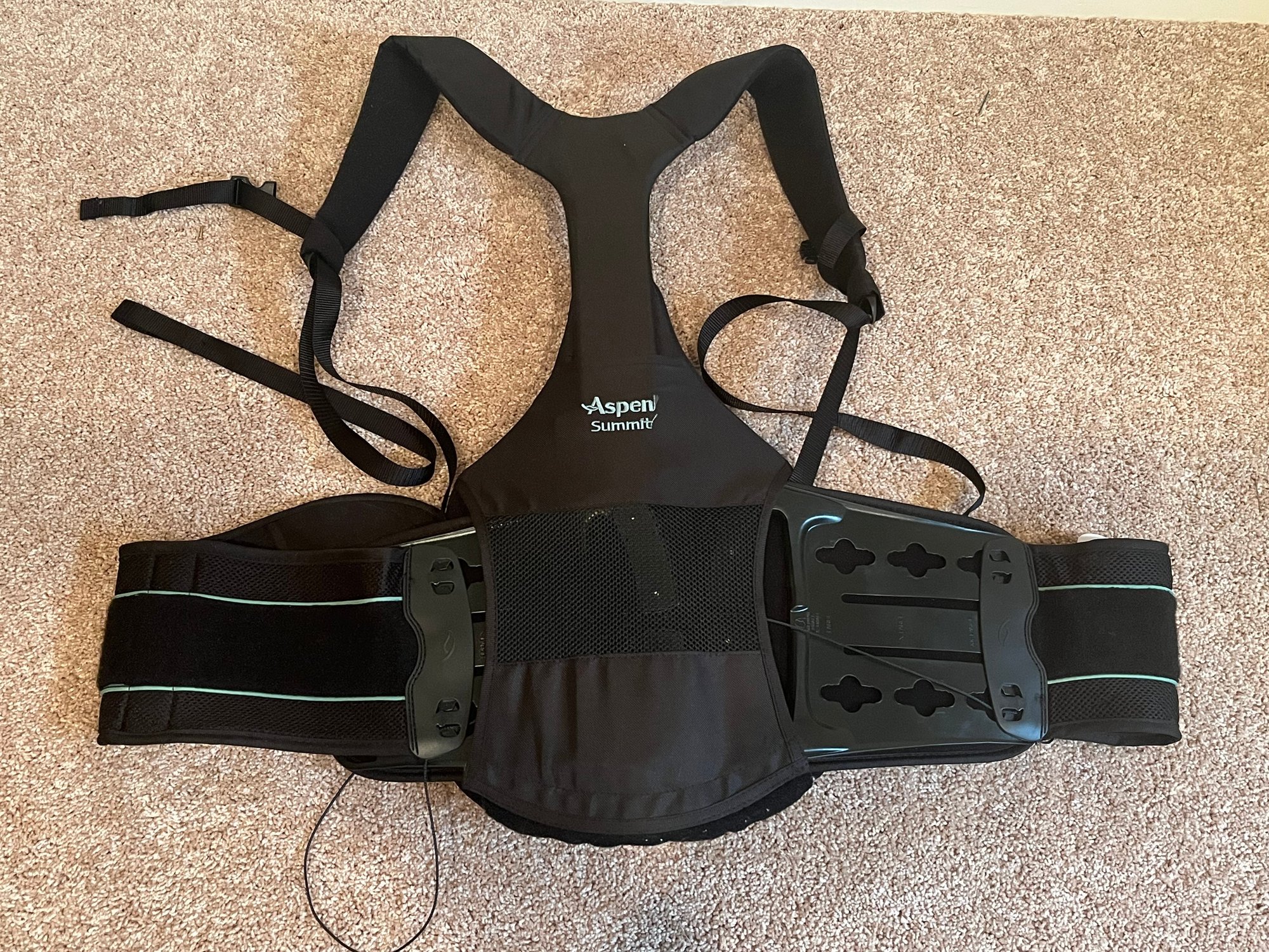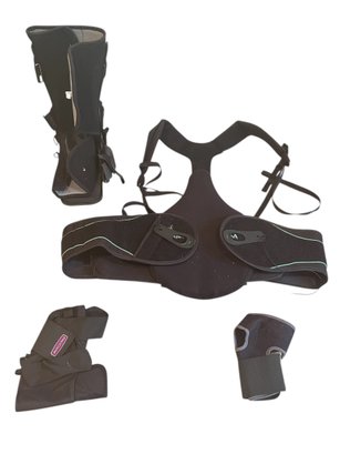 Assorted Support Brace Lot inclduing a Maxtrax Orthopedic boot sz medium, 2 velcro elbow and or knee braces and 1 Aspen Vista 464 TLSO back brace. All pre owned condition, may need to be cleaned.