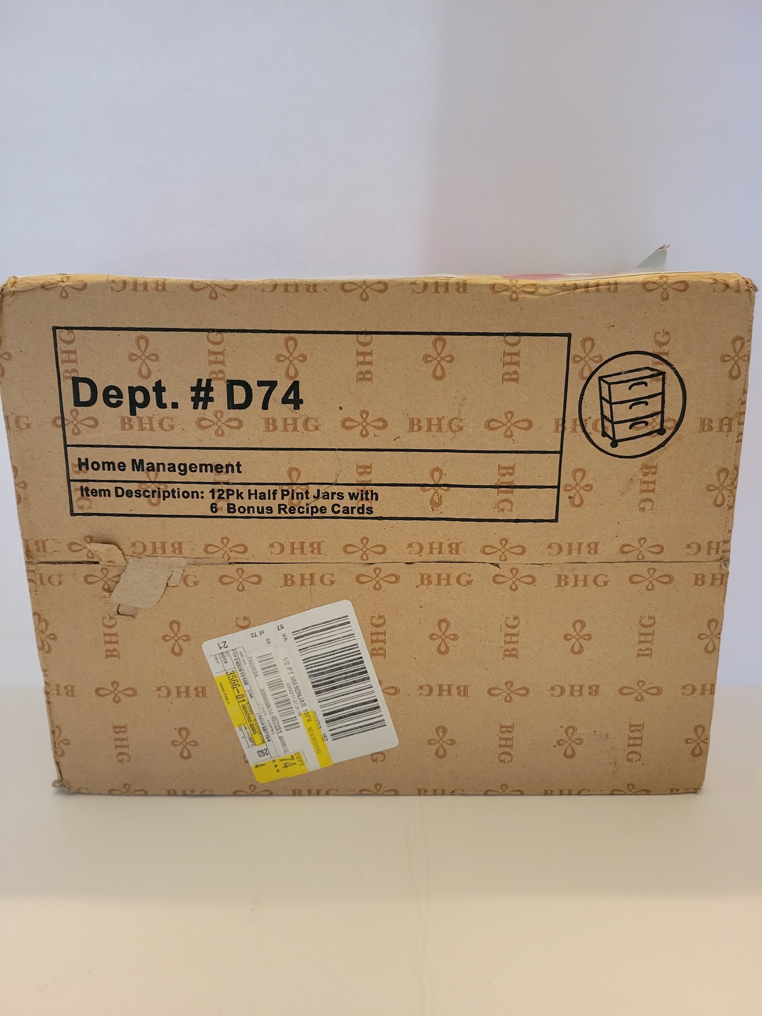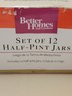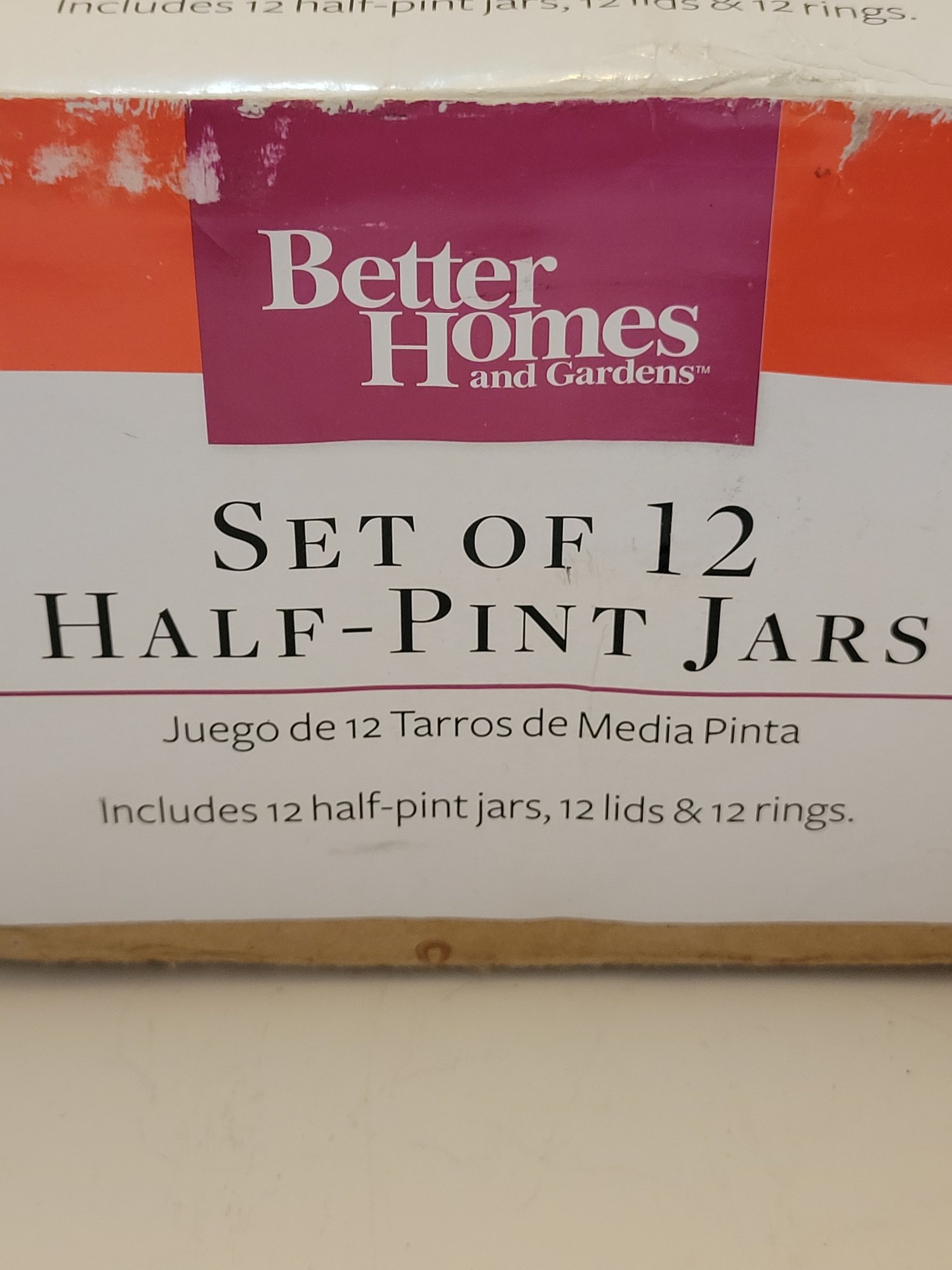 Better Homes and Garden Set of 12 Half Pint Jars. Includes 12 half pint jars, 12 lids and 12 rings. The box is sealed. Box may have wear.
