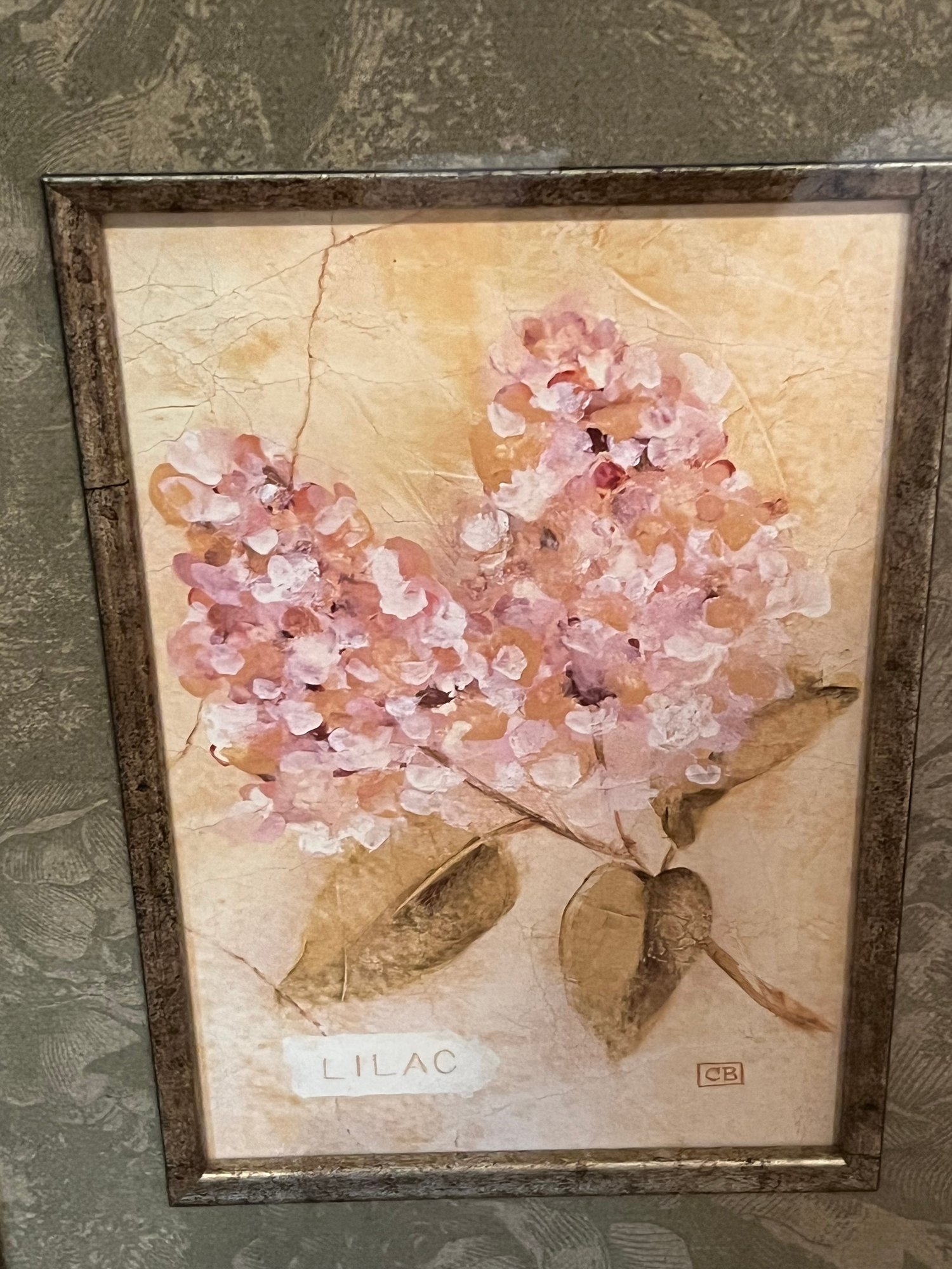Botanic Wall Art Print By Cheri Blum featuring floral prints of a creme colored Magnolia and a Light Pink Lilac flower. Comes in a champagne tone ornate decor frame with green floral print mating. Measures approximately 12”x 24”. Pre owned condition.
