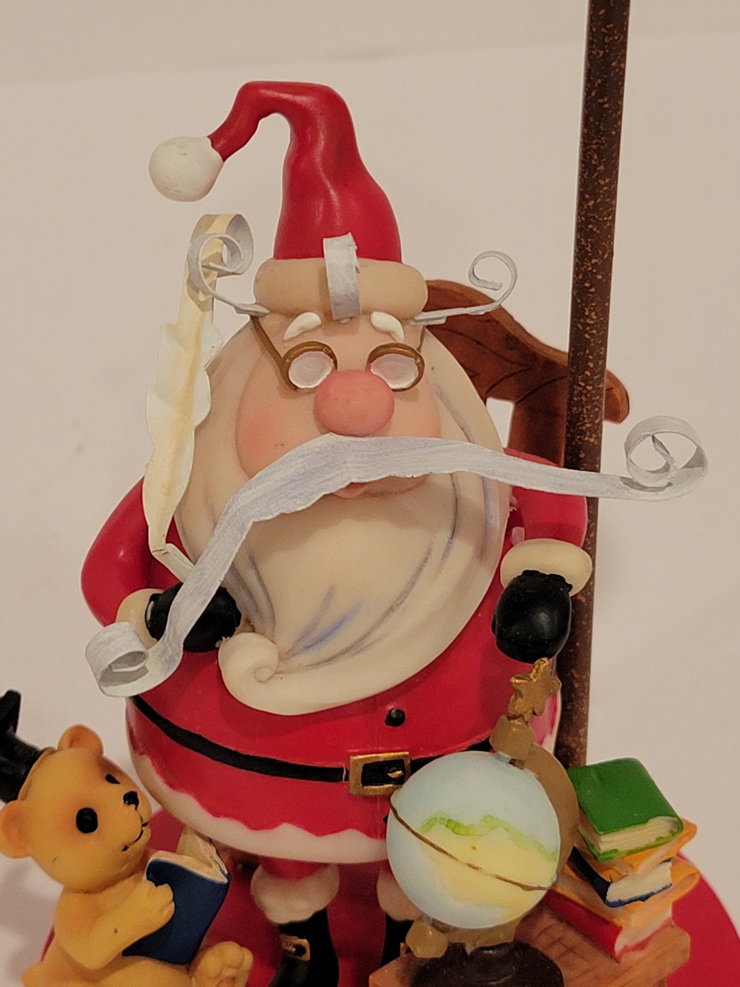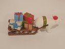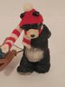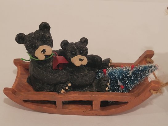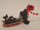 Christmas Figurines and Blackbear Family Ornament. Includes the Black Bear Family Ornament depicting a bear with a scarf and hat pulling a sled. Measures 5". A polar bear pulling a sled approximately 5". Also a Santa Claus tealight holder approximately 6". Pre-owned condition.