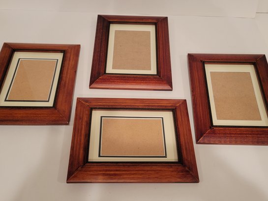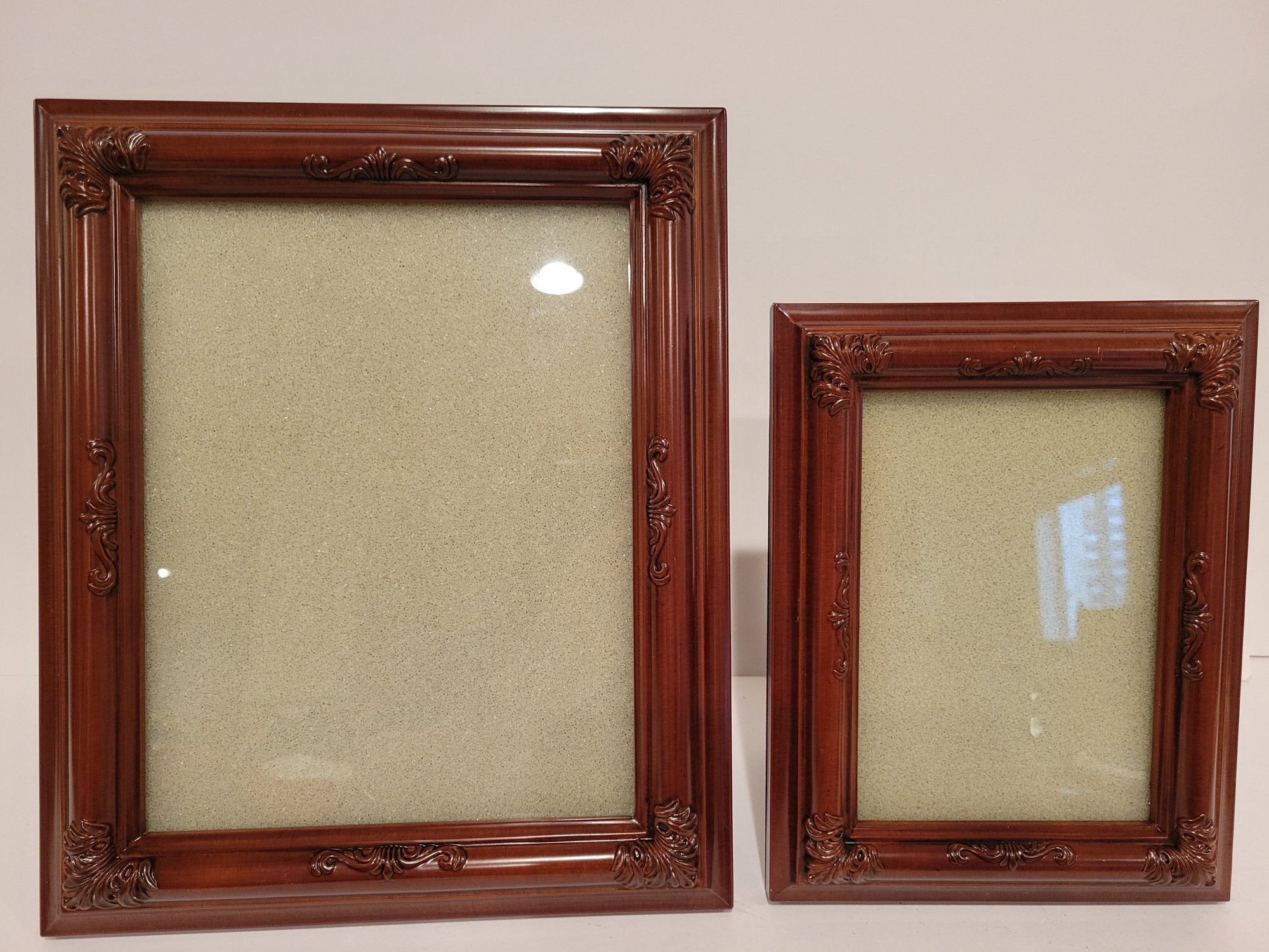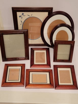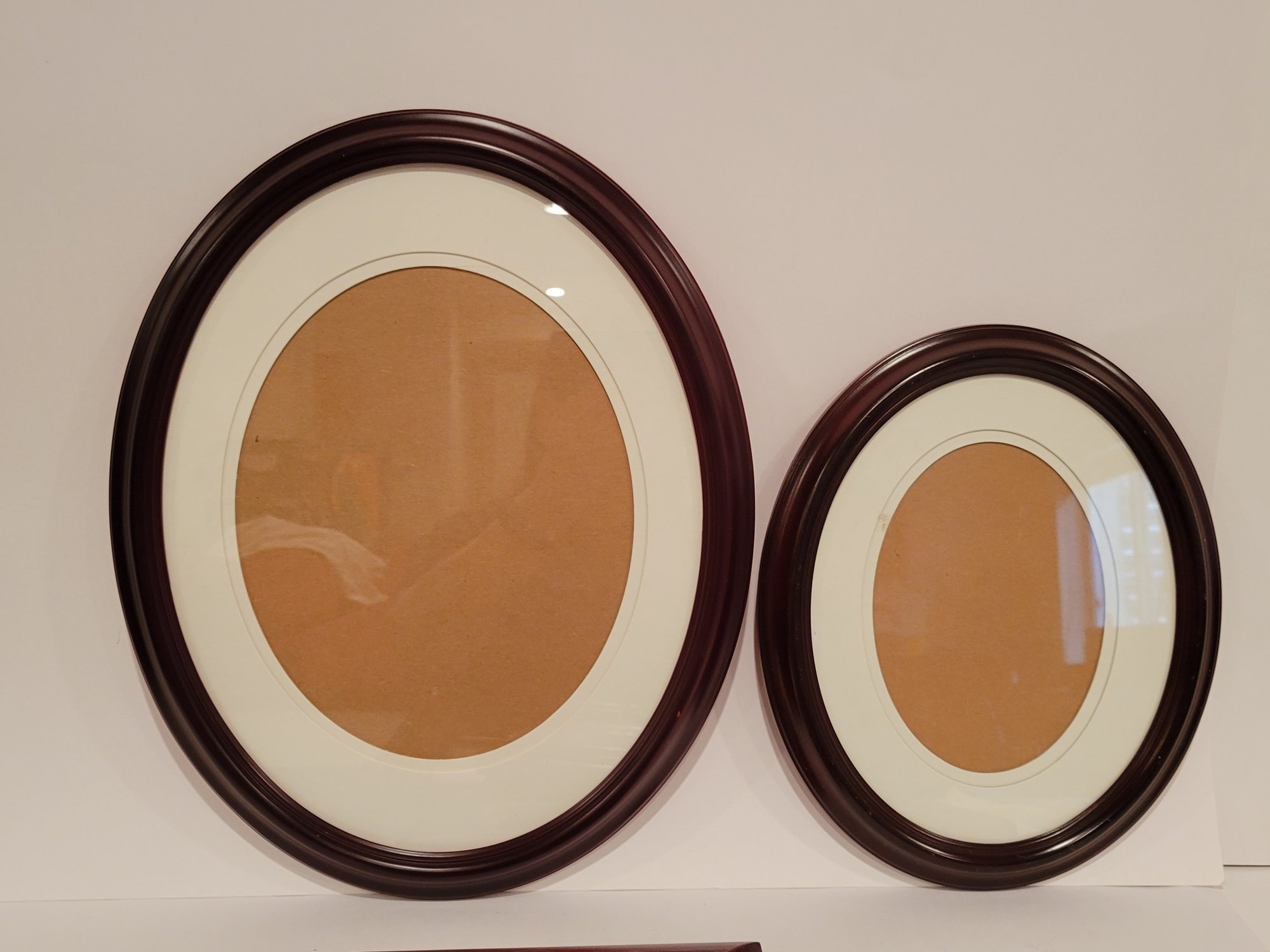 Dark Walnut And Mahogany Finish Picture Frames x 9. They have beveled edges and have ornate design. Most of them are wood and have a matte under the glass. Includes a large 13" x 16". 2 matching oval frames 11" and 15". 2 matching frames 7" x 9" and 10" x12". Also 4 wood frames 7" x 9". Pre-owned condition.