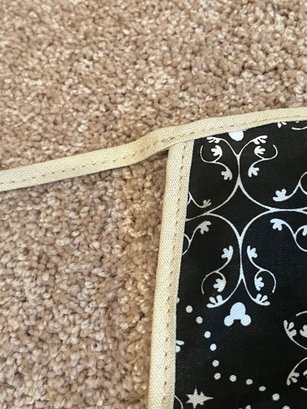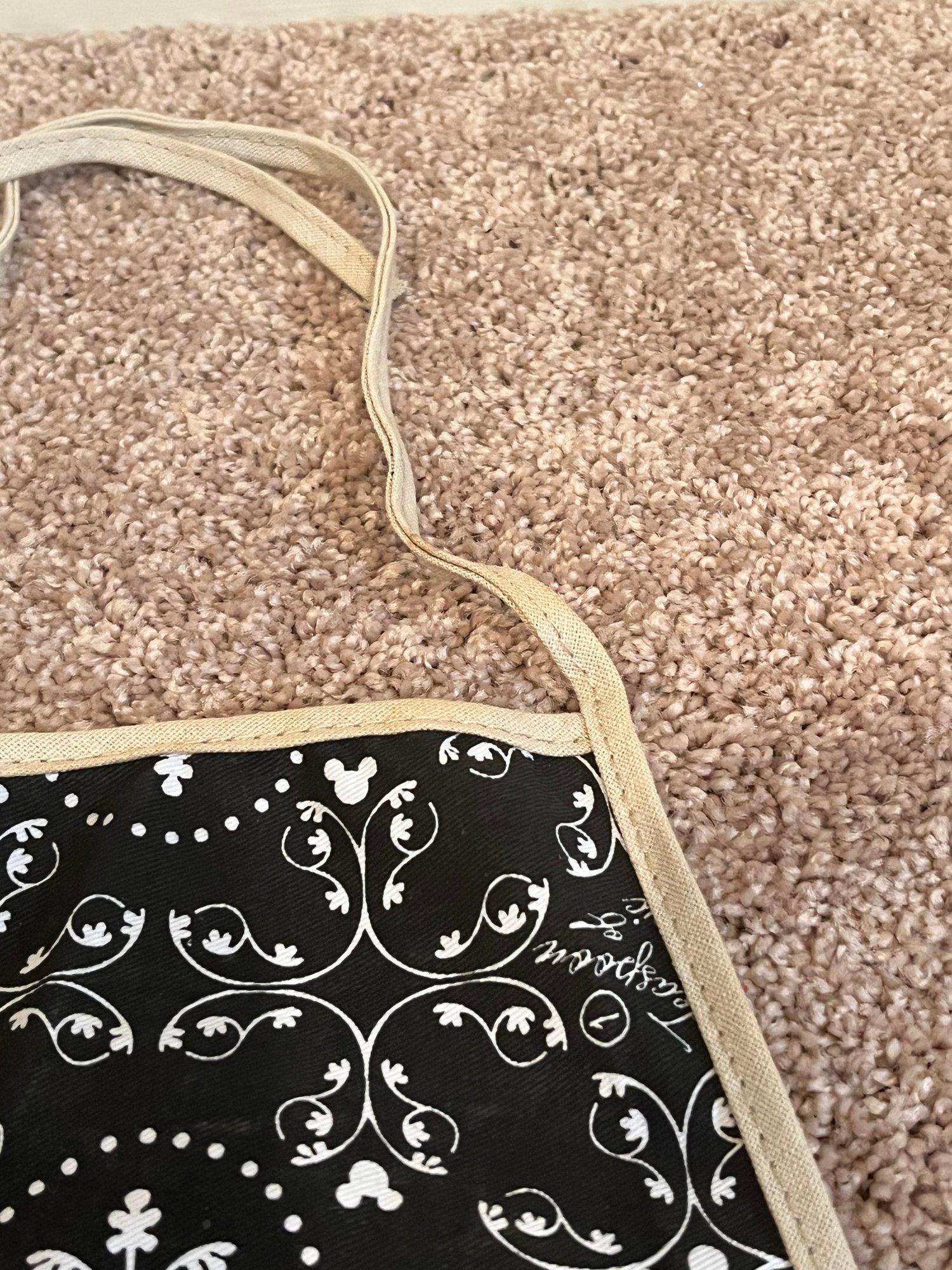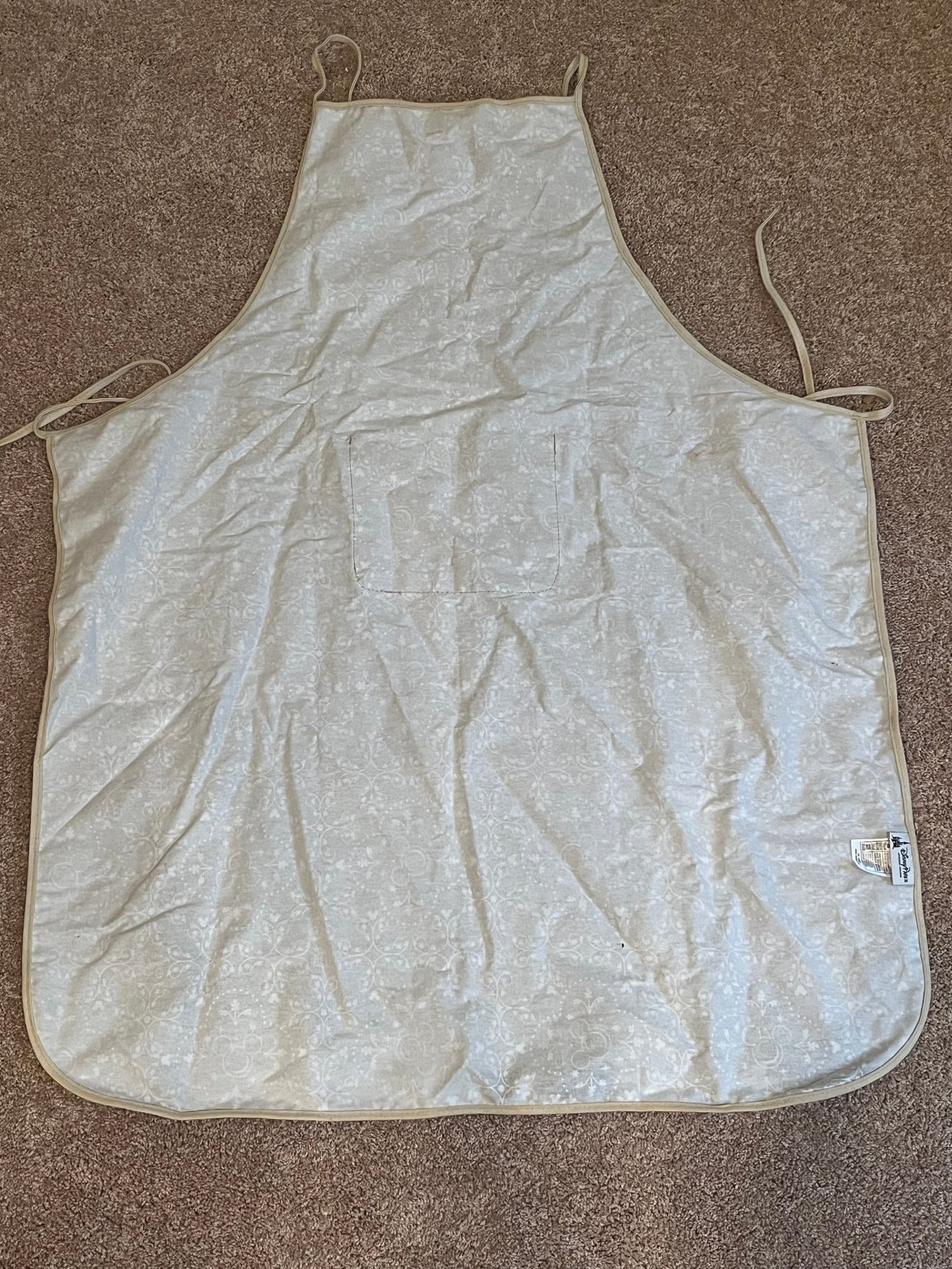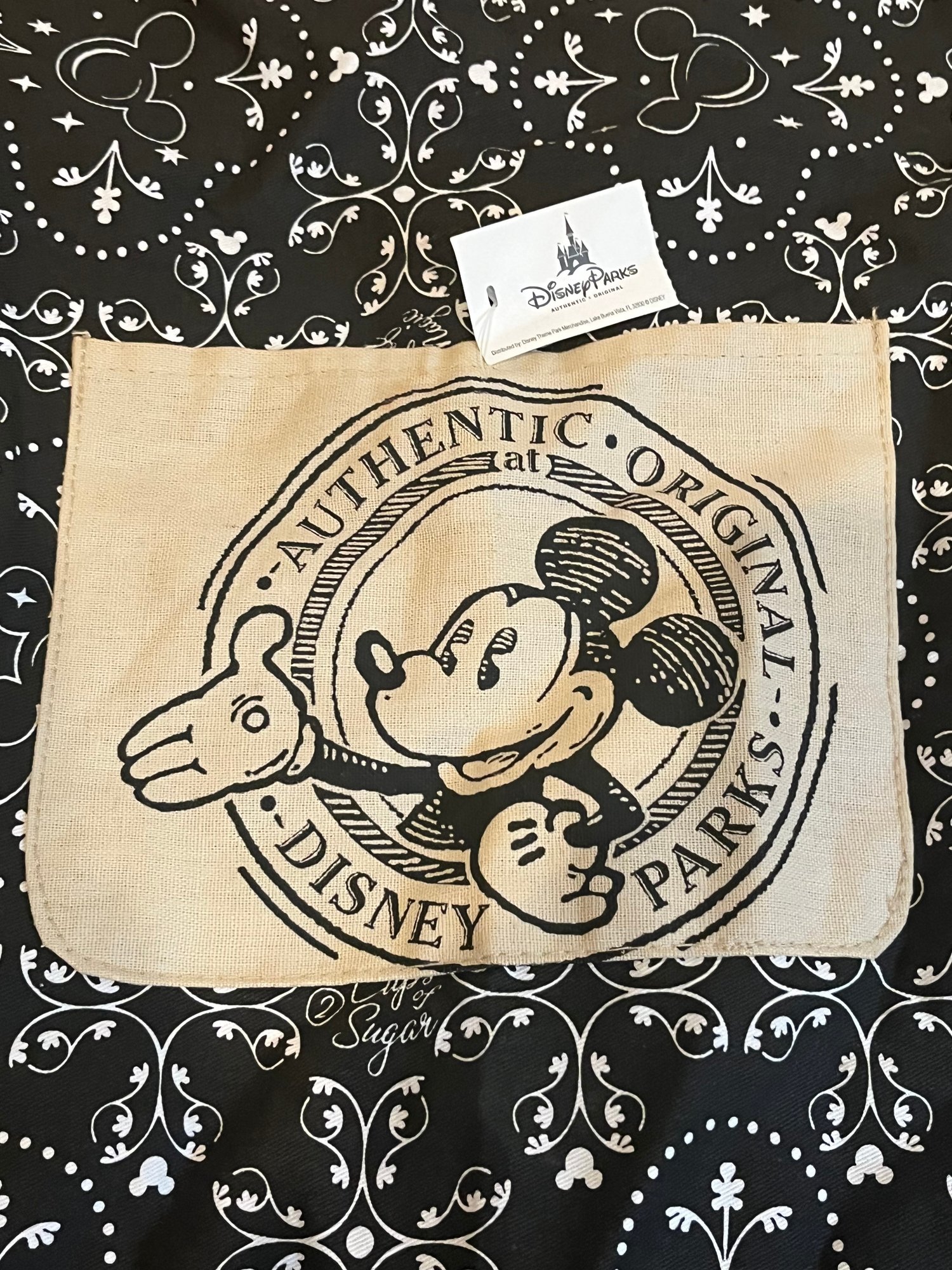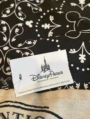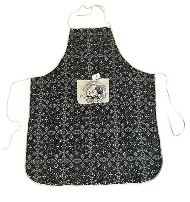 Disney Parks Mickey Mouse Icon apron, featuring a black and white rustic mouse icon pattern with a central screen art pocket. Comes with the original tag. One Size, made of 100% cotton. Pre owned new condition.
