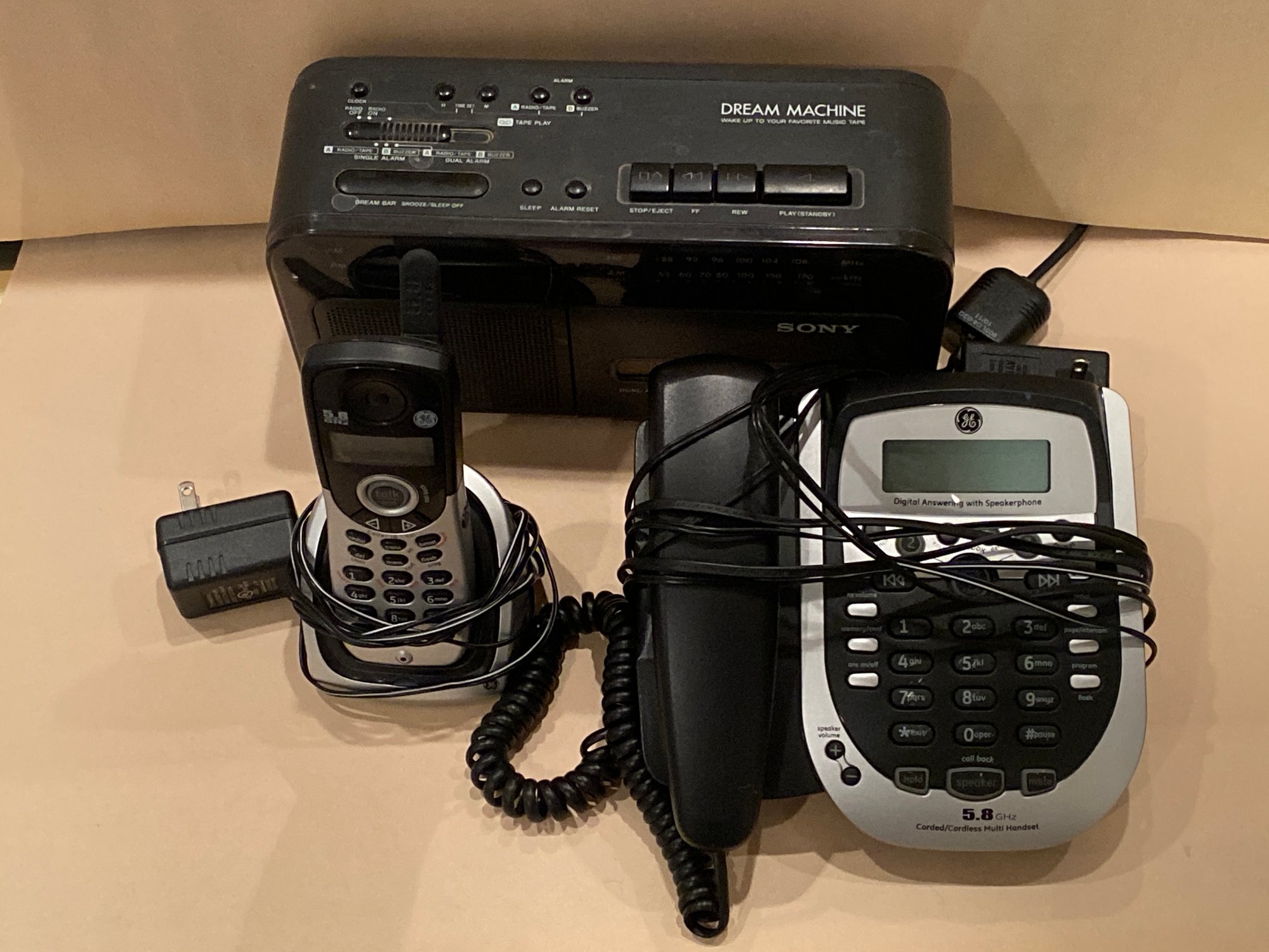 GE Telephone System And Sony Dream Machine. 1 component of the system is a landline and the other is a cordless phone. The Sony Dream Machine is a radio alarm clock. All pre owned condition.