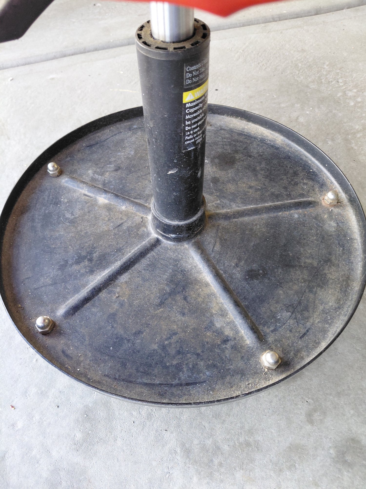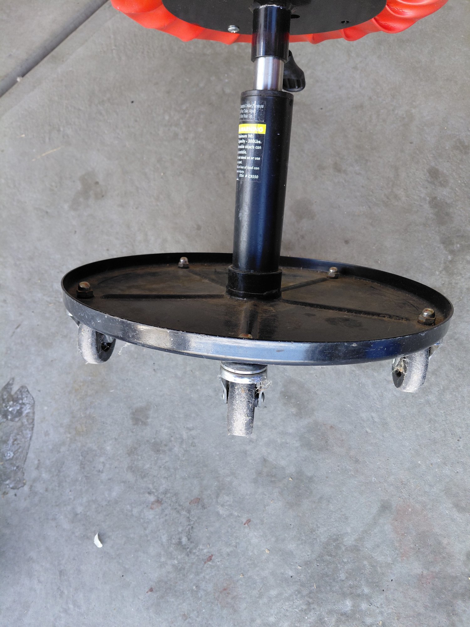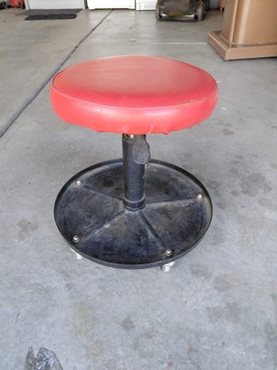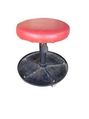 Pneumatic rolling mechanic shop stool used for working on vehicles or in garages.