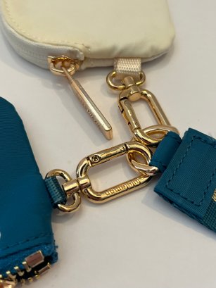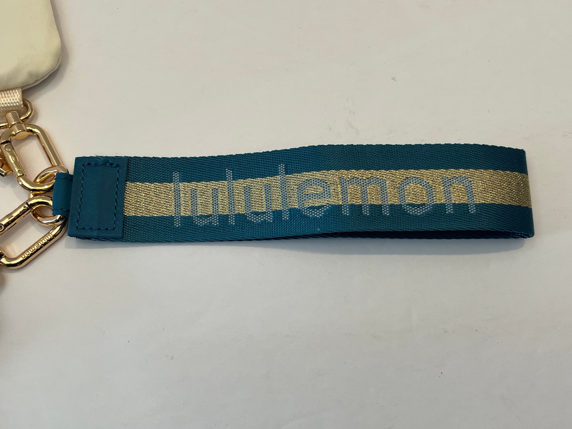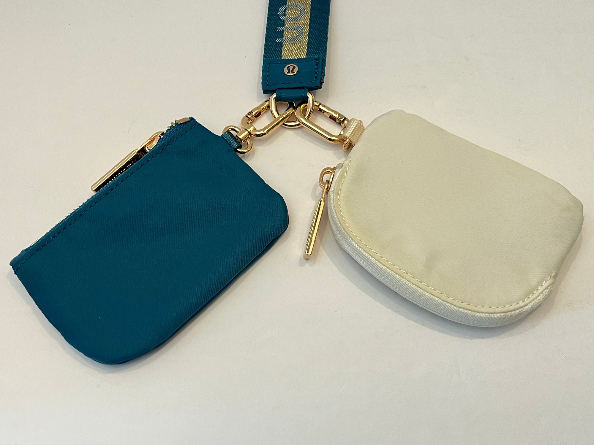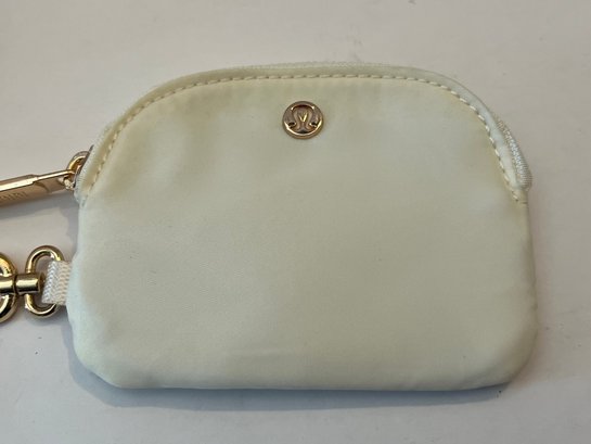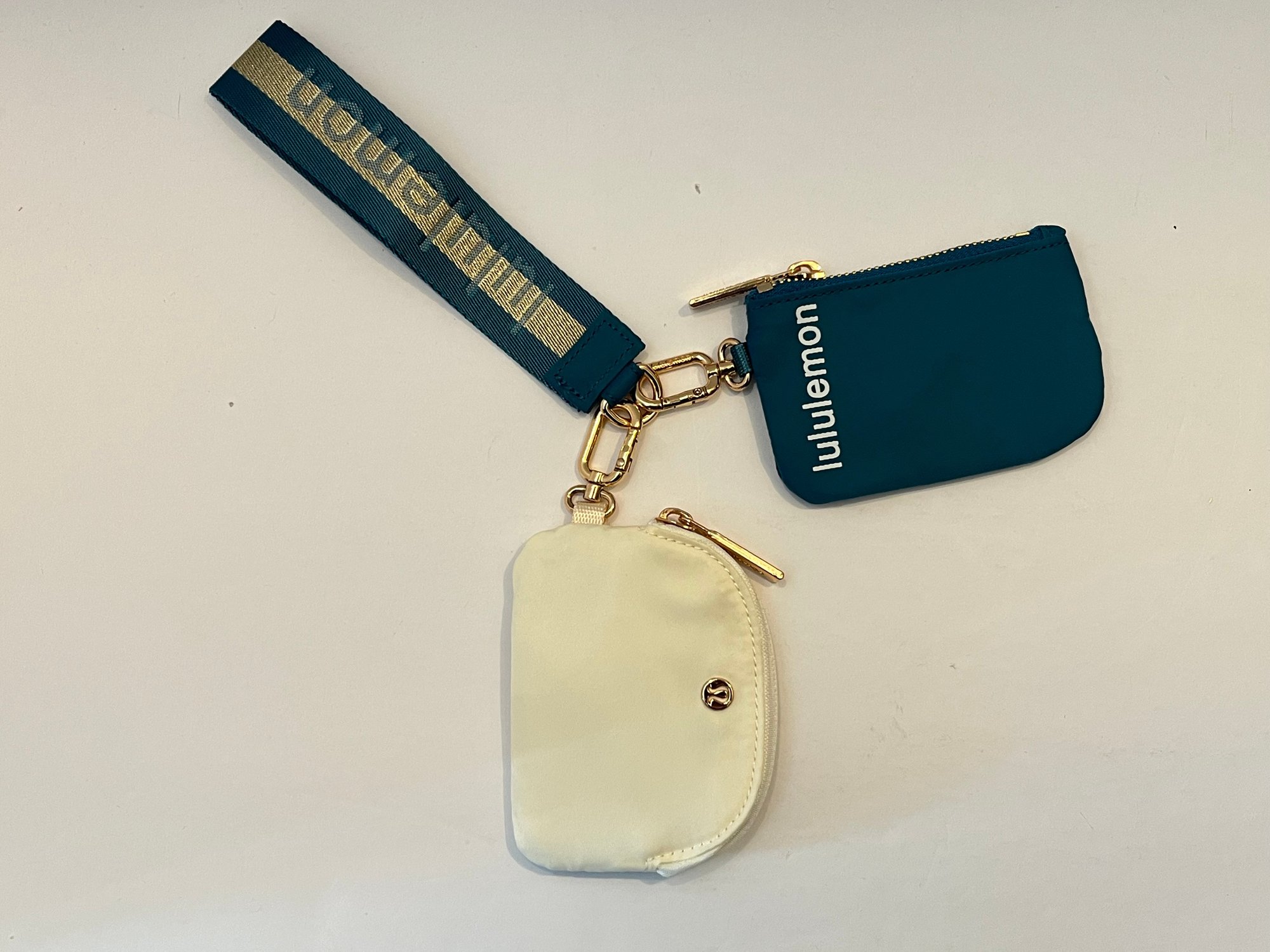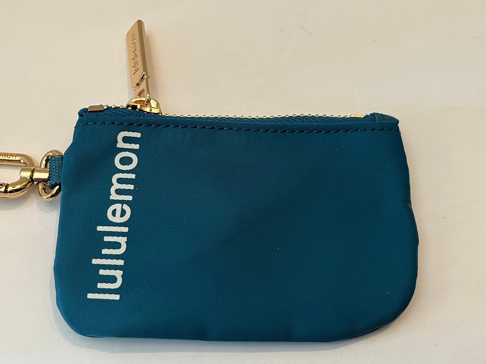 New-Lululemon Dual Pouch Wristlet in the Warp Teal/Gold/Bone color way. Comes with gold toned hardware and a gold stripe down the middle of the wristlet. Great for holding cards and other small essentials on the go. Pre owned good condition.